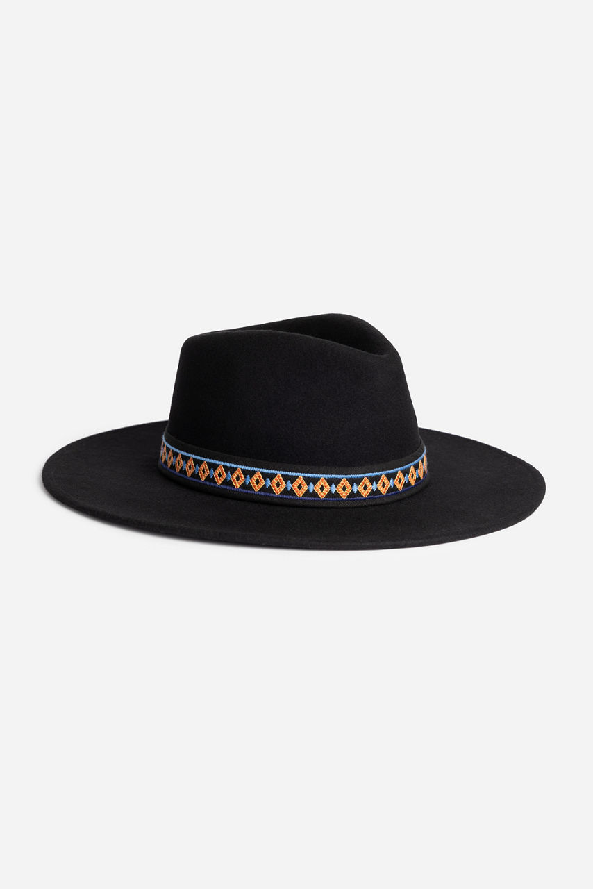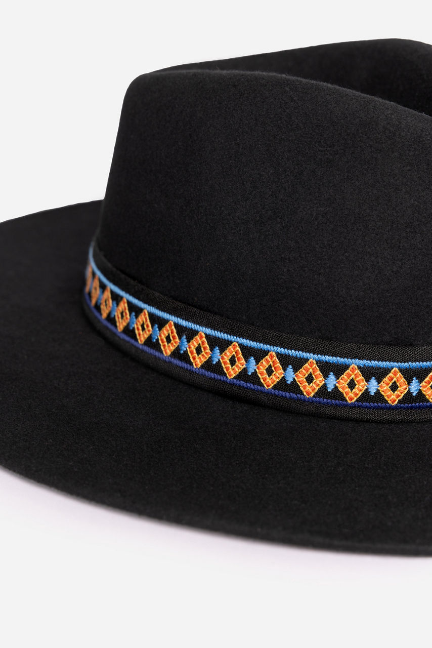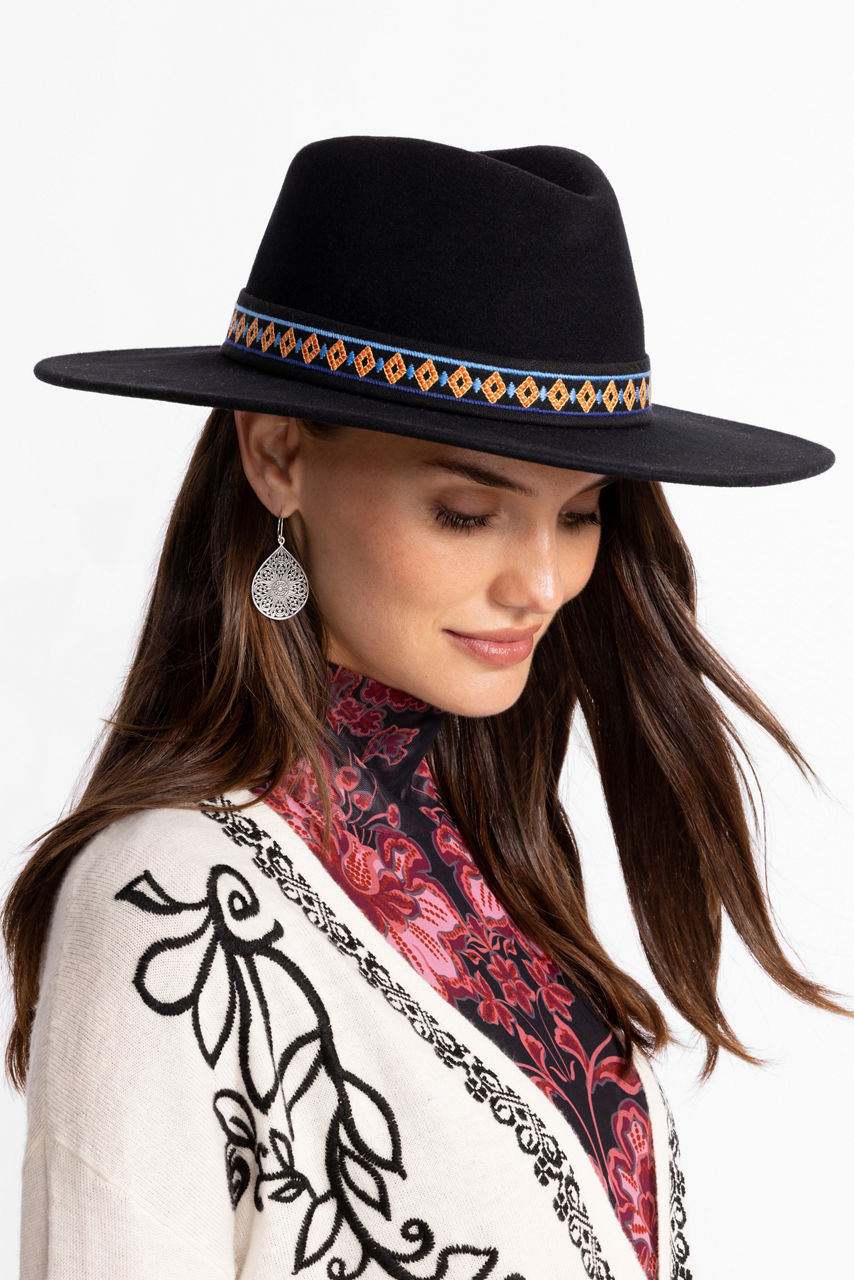 Crafted from 100% wool, the Nellie Hat is a wardrobe statement piece. Designed with a rough-hewn edge for a unique flair, this hat is accented with a bold hatband impeccably embellished with colorful embroidered accents. Wear with a denim-on-denim look paired with bold turquoise jewelry for a fun night out.