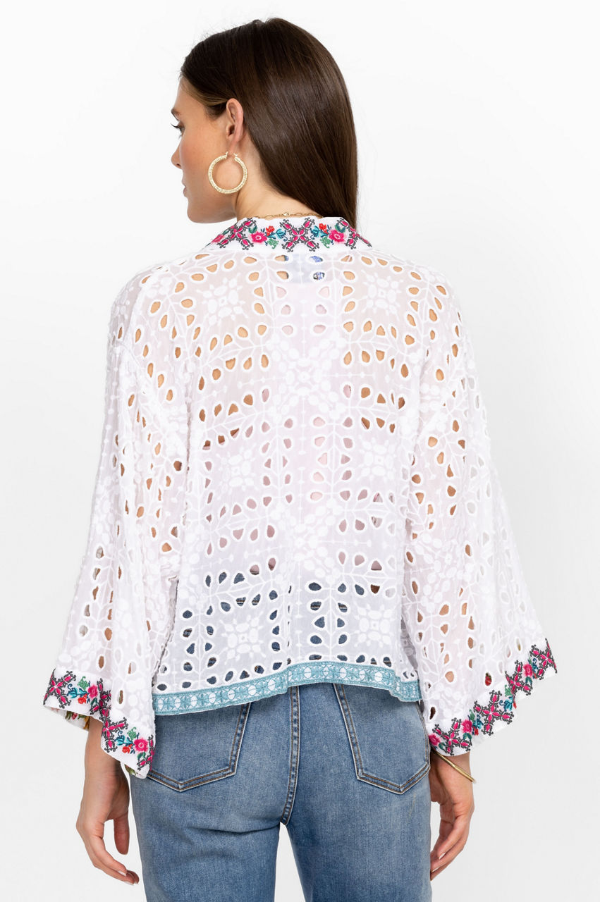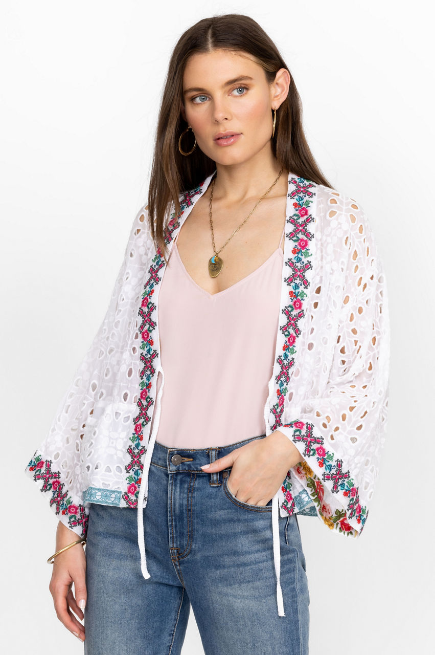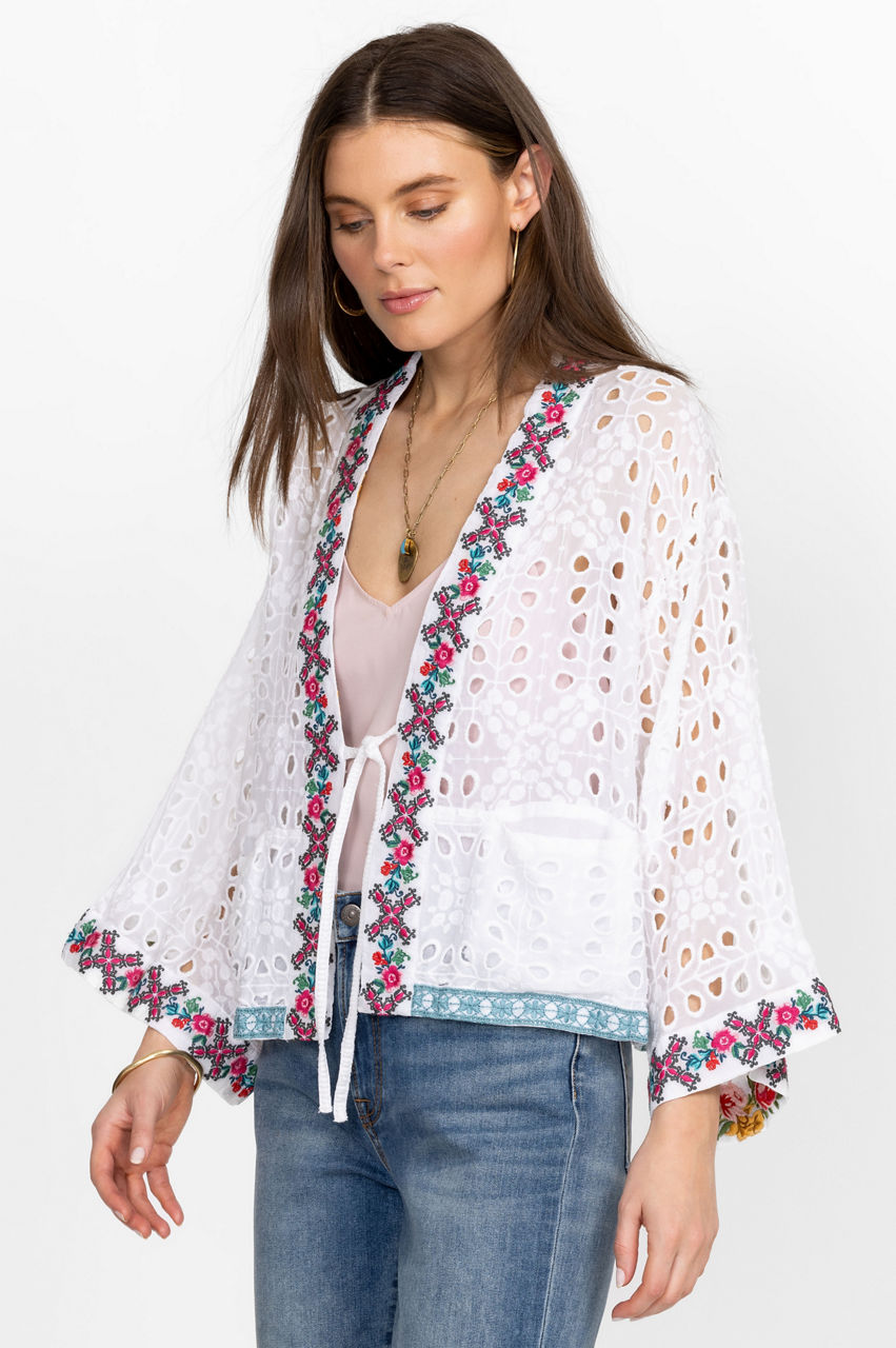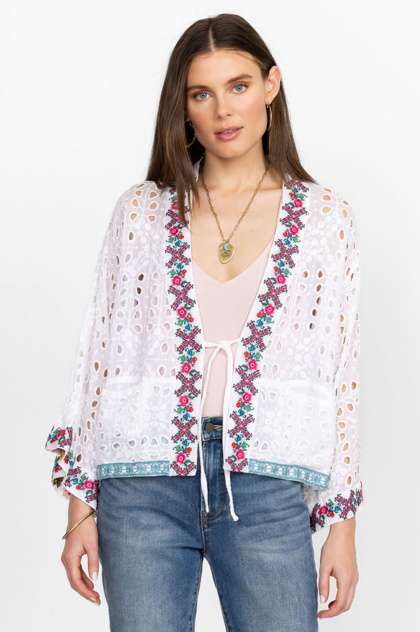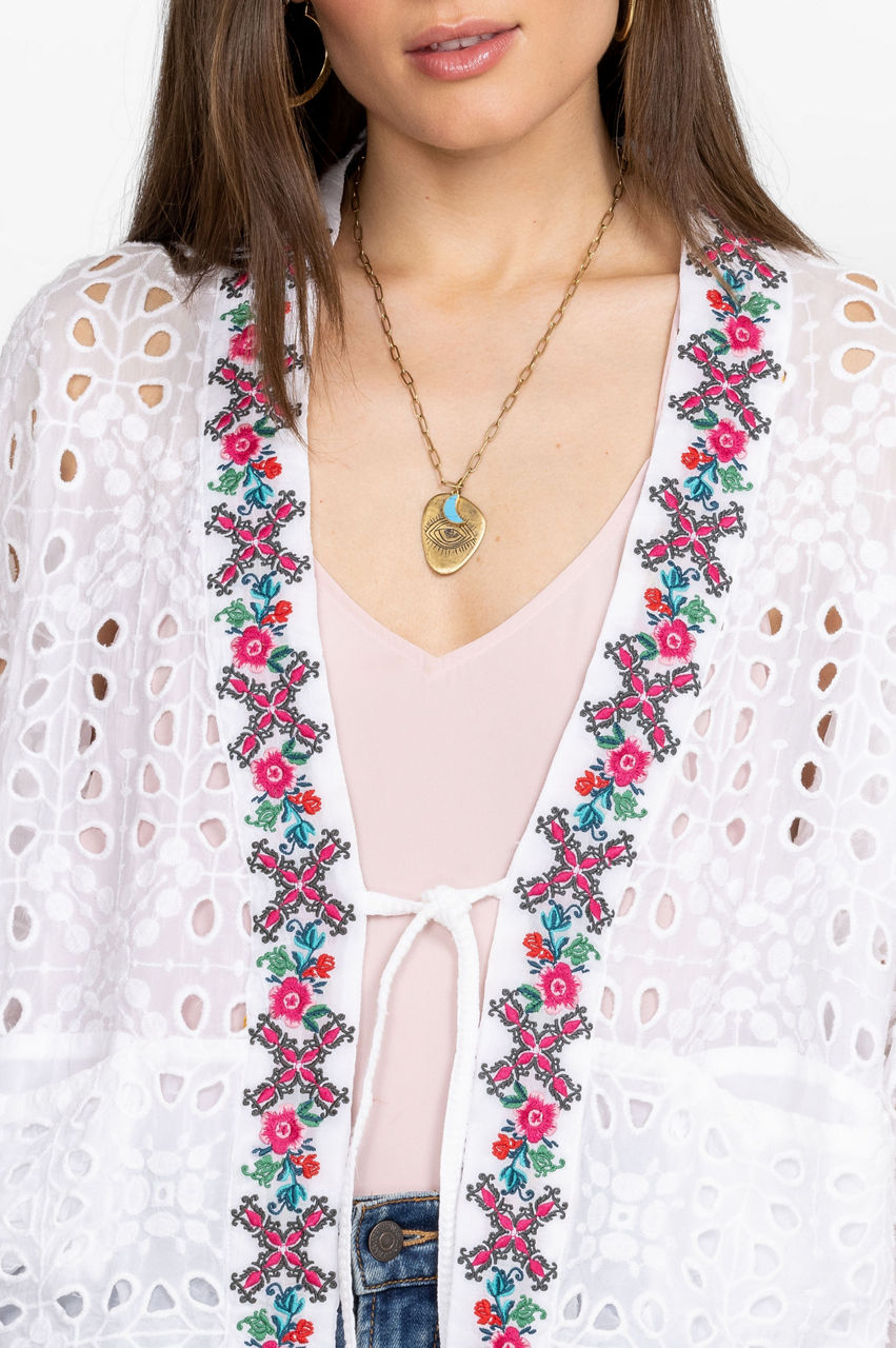 Crafted from rayon, the Nera Kimono makes a case for timeless statement outerwear. Showcasing a passion for detail and creativity, this short kimono features a collar, wide long sleeves, eyelet detailing, a tie front, and a colorful embroidered trim along the edges for an artistic touch. Layer over a plain slip dress and style with heeled sandals for a refined evening outfit.