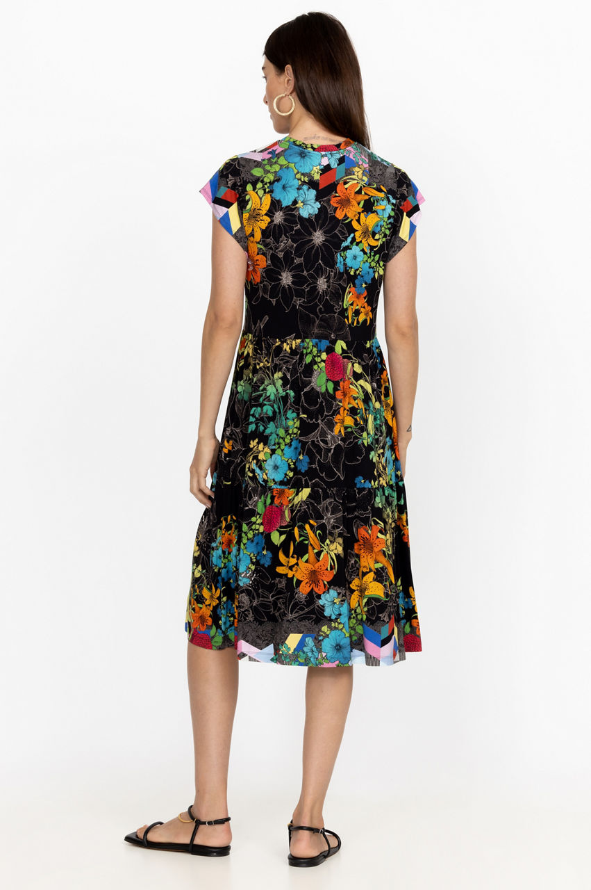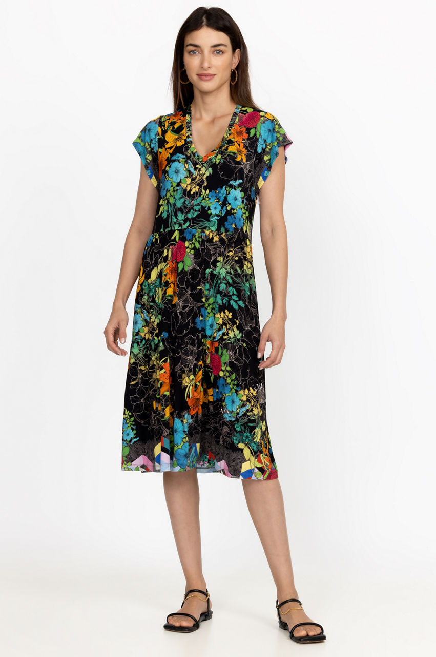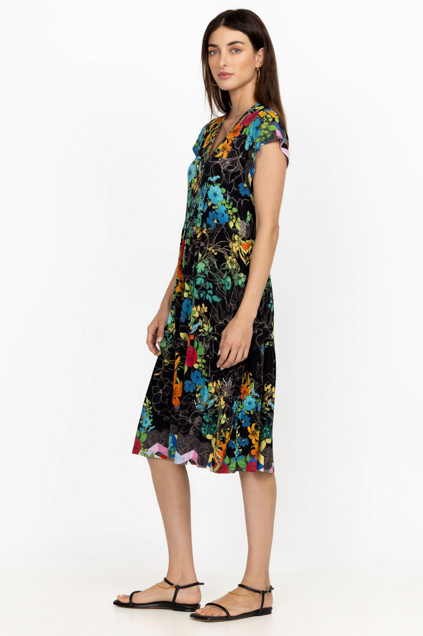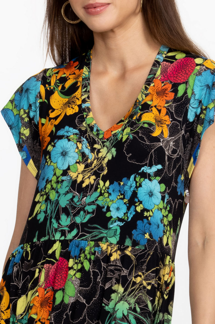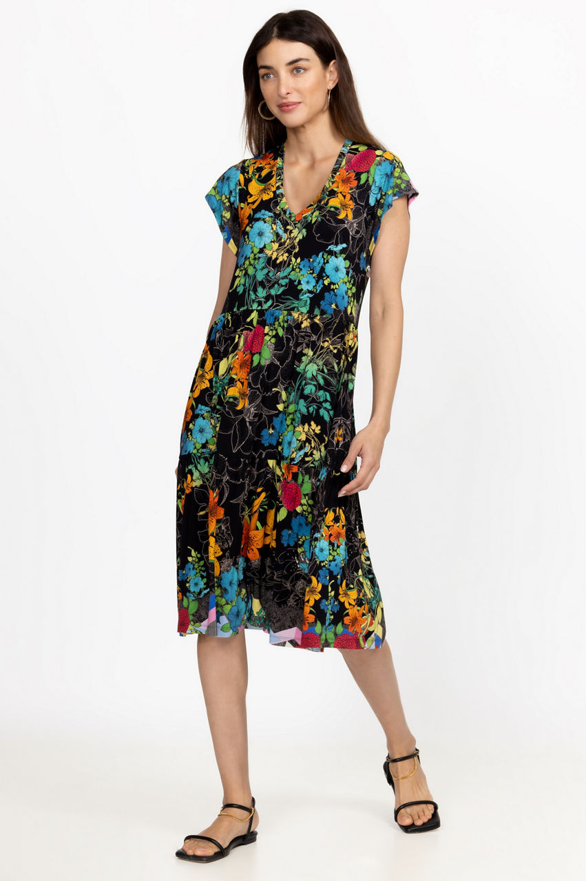 Unapologetically feminine, the Sequence Tiered Tea Length Dress is a statement-making style for sun-drenched days. This dress has a hint of stretch and features a V-neck, short sleeves, a tiered construction for a relaxed fit, and a bountiful display of rich blooms. Dress down with flats or pair with heels for a relaxed evening look.