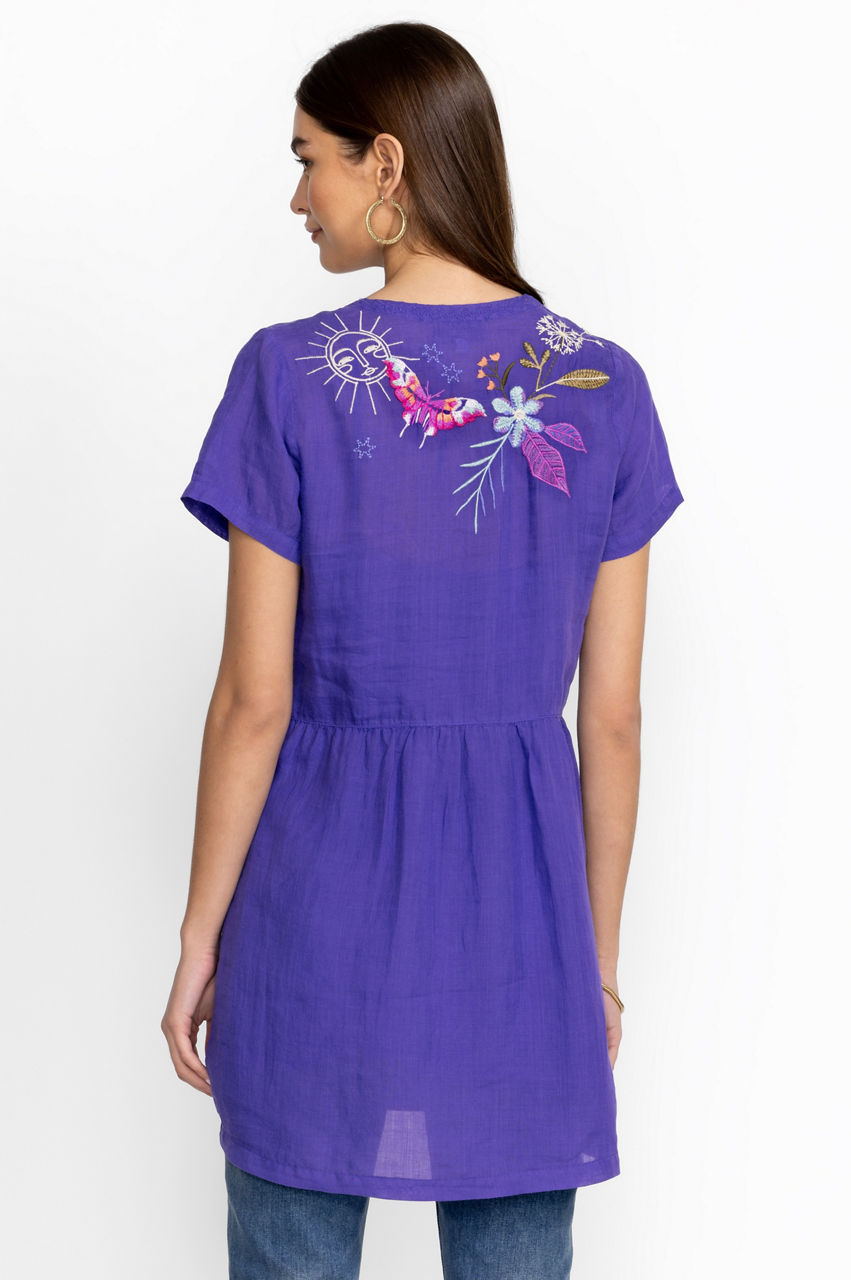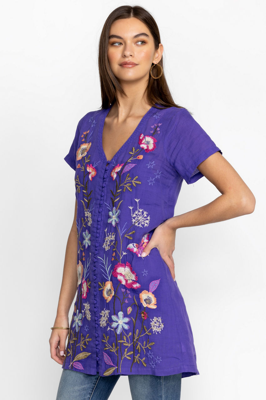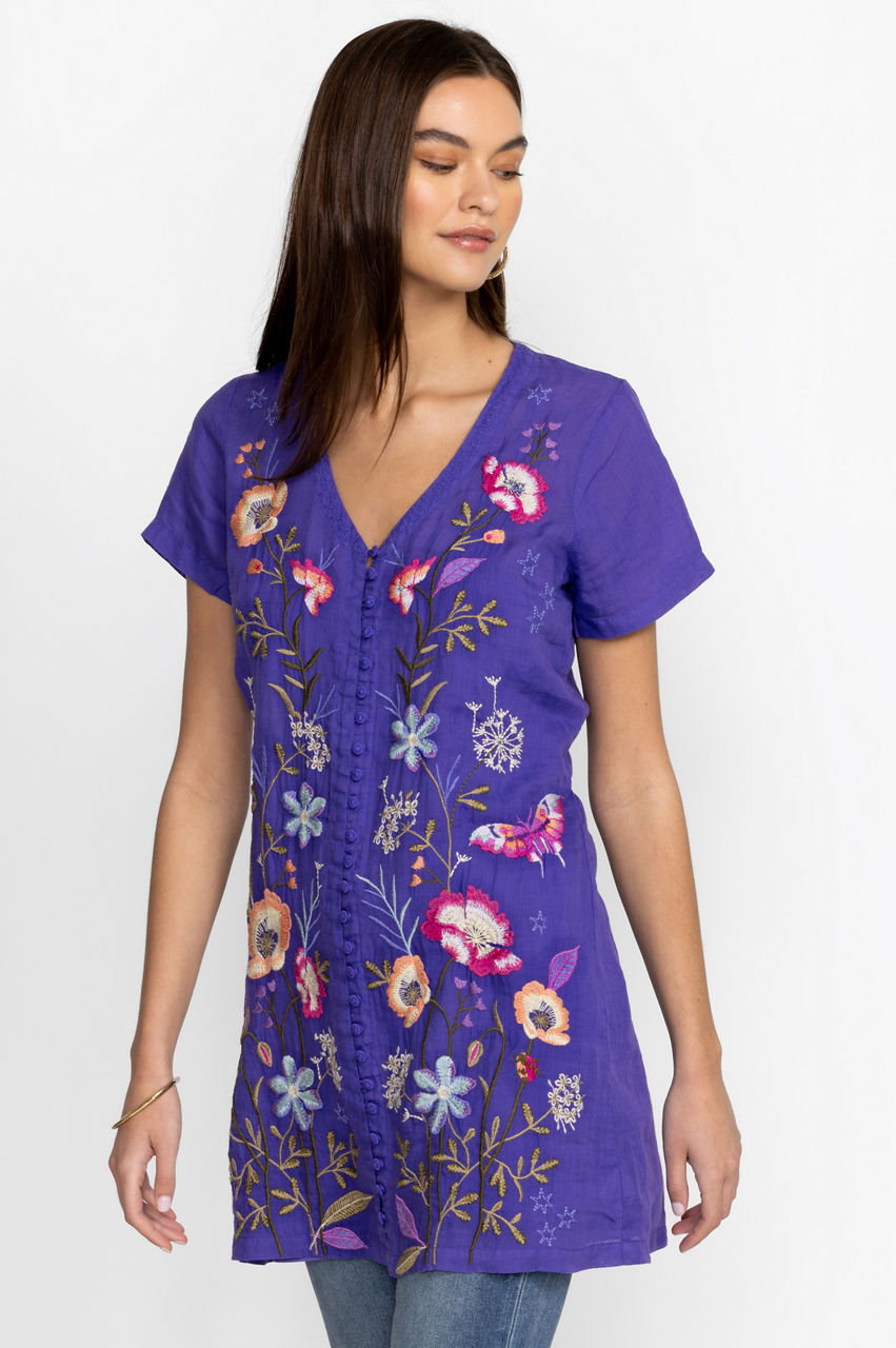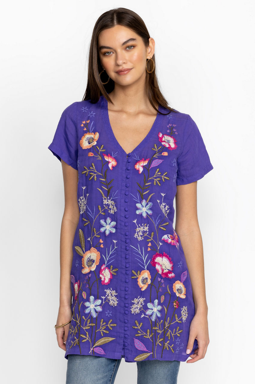 Effortlessly elevated with fresh blooms, the Nila Easy Breezy Tunic is a versatile option for sun-drenched days. Perfect for vacations and bright afternoons, this breezy tunic is made from comfortable ramie and features a V-neck, a button front, short sleeves, and a colorful placement embroidery comprising graceful flowers. Wear with flat sandals for a casual daytime ensemble.