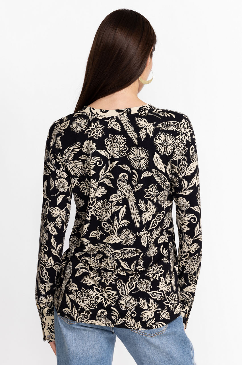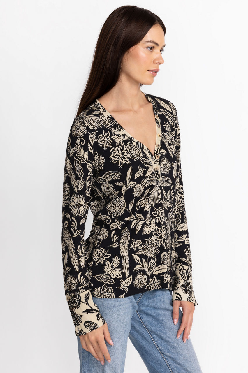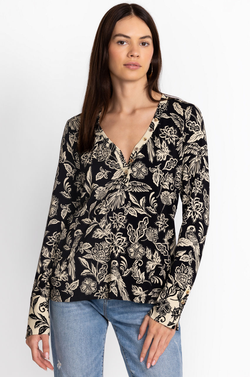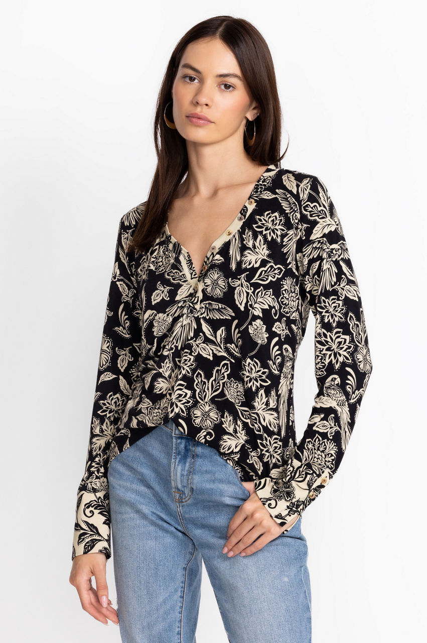 Embodying a botanical finish, the Noah Henley Top exudes casual comfort with a touch of elegance. Featuring an open neckline, long-sleeves and a fluttering hemline, this top will easily become a closet favorite. Pair with relaxed chinos and ballet flats for a casual work look.