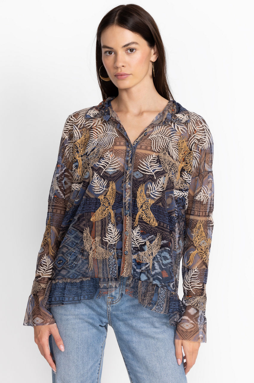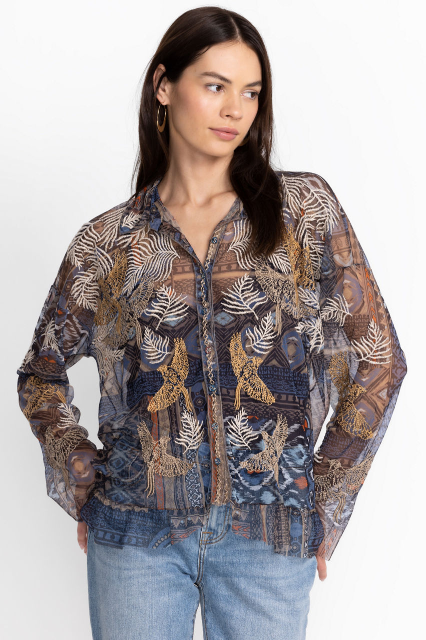Crafted from a lightweight mesh material, the Noemie Mesh Blouse turns to the natural world for inspiration. Underscored with an artistic flair, this mesh blouse features a collar, a front button closure, long sleeves, and a detailed placement embroidery comprising fauna and flora motifs. Keep your look casual by pairing with jeans and flats.