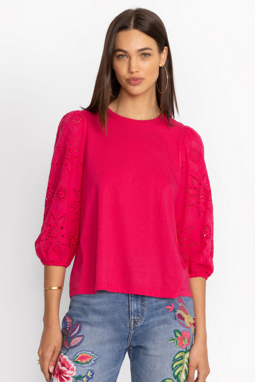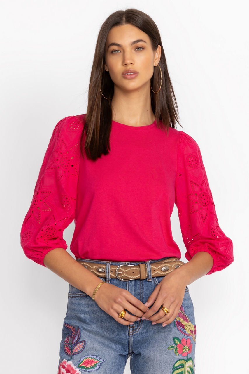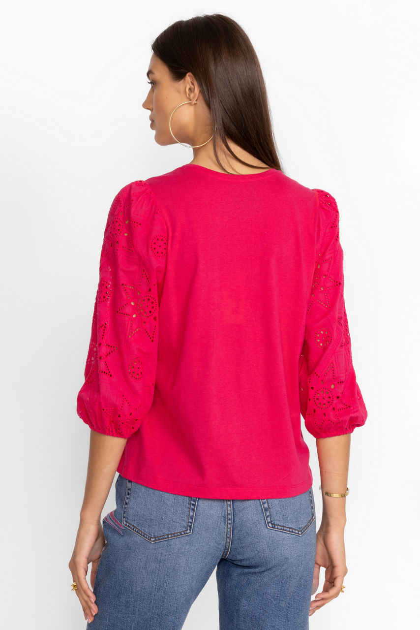 Crafted from 100% cotton, the Nora Easy Tee offers a fresh take on a classic wardrobe staple. Featuring a relaxed crew neck and gently puffed sleeves cut from beautifully detailed eyelet fabric, this tee is finished with an A-line bodice for a silhouette that flows away from the body. Pair with your favorite jeans and fashion sneakers for a casual weekend vibe.