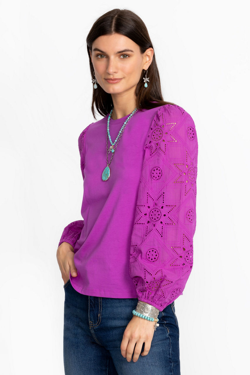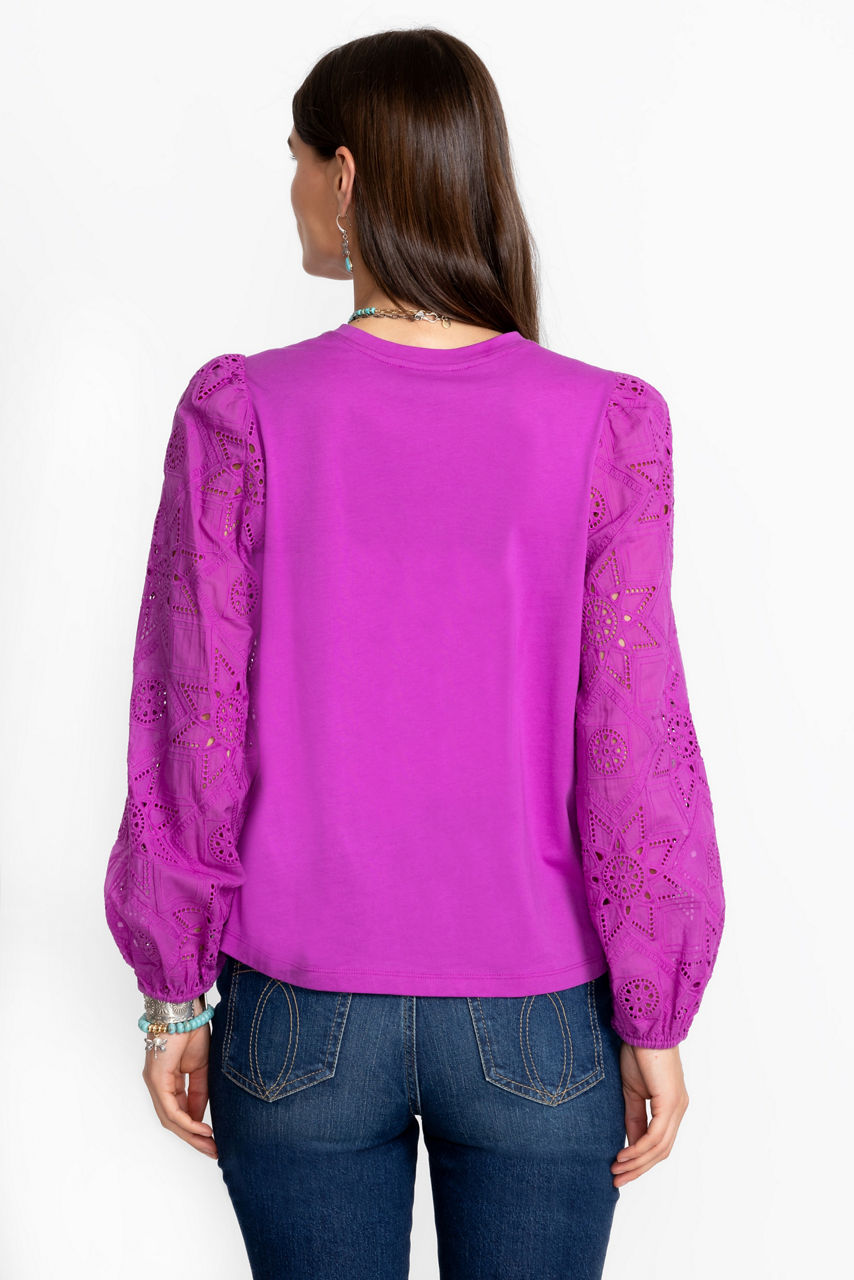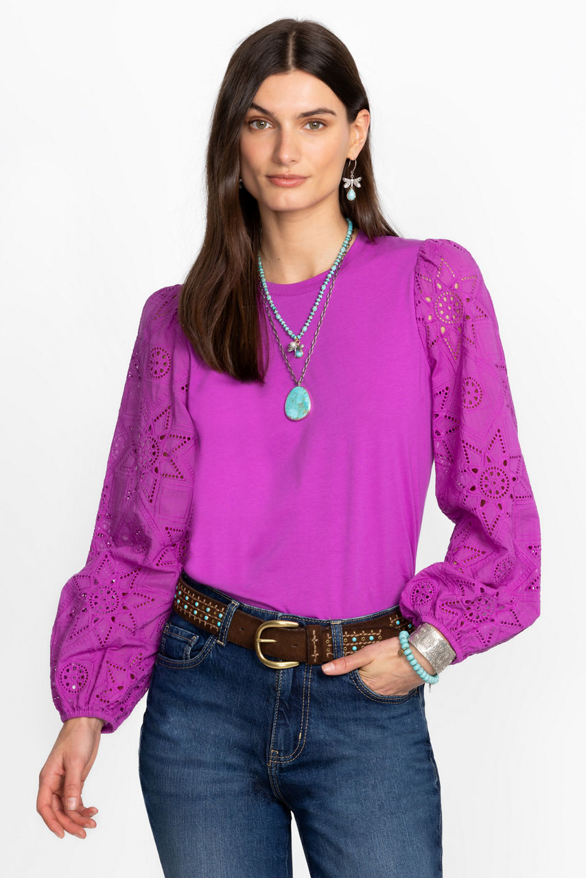 Crafted from 100% breathable cotton, the Nora Long Sleeve Easy Tee offers a modern take on a classic wardrobe staple. Designed with a gently scooped neckline and puffed eyelet bishop sleeves, this updated tee is finished with a relaxed-fit bodice making it perfect for every day. Pair with a casual skirt or trendy denim for an elevated casual look.