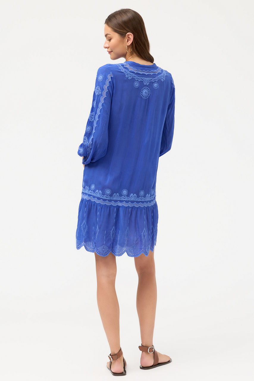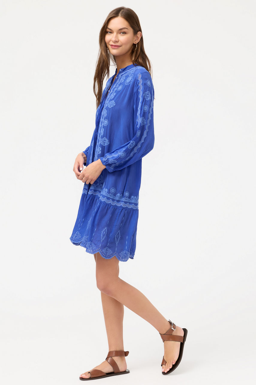 Intricately embellished with bold embroidered detailing, the Norma Dress is crafted from a lightweight flowing fabric. Designed with a rounded button-front neckline and gently puffed Bishop sleeves, this slip-lined dress is finished with a beautifully scalloped hemline. Pair with bold flats and a raffia crossbody for a resort-ready vacation ensemble.