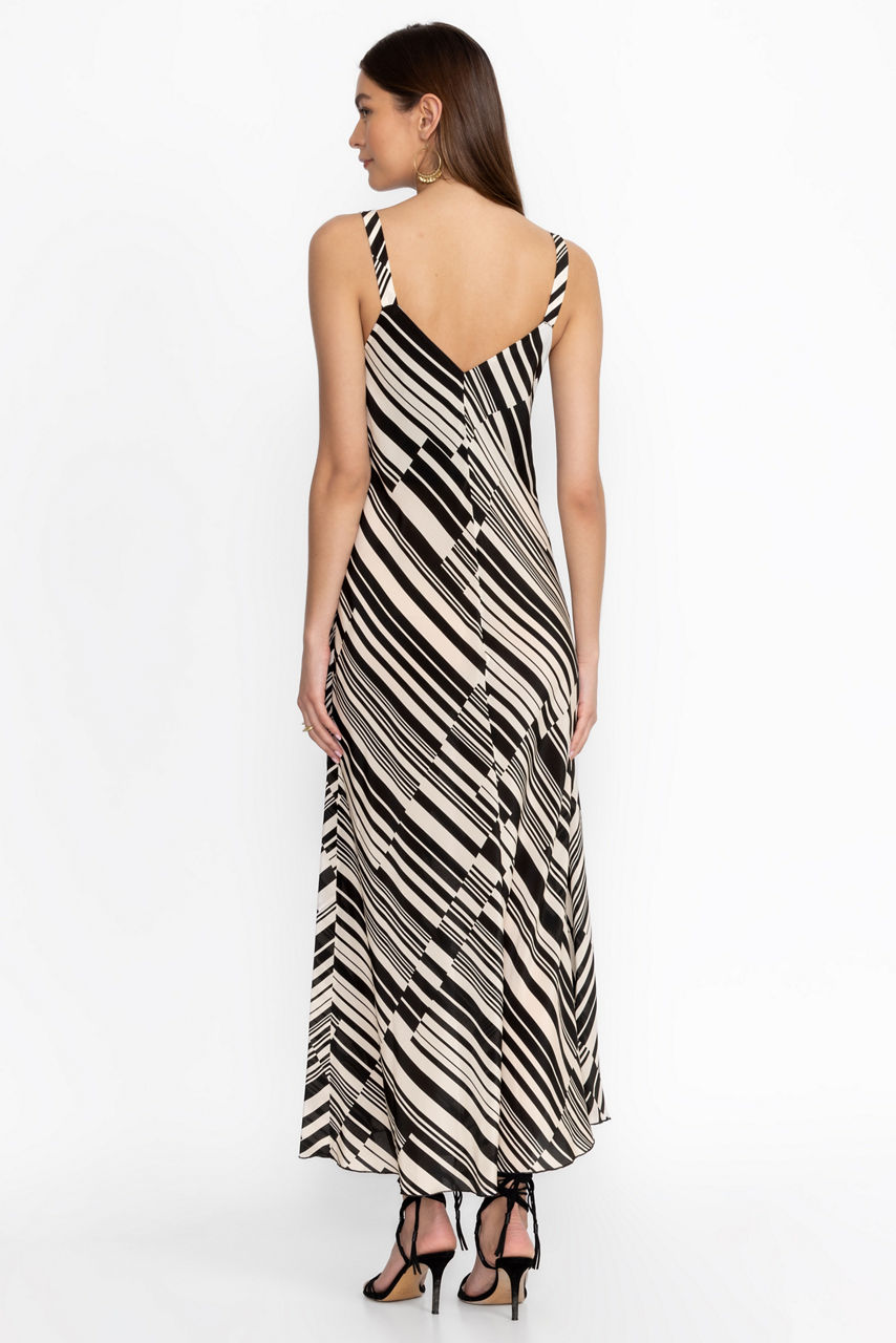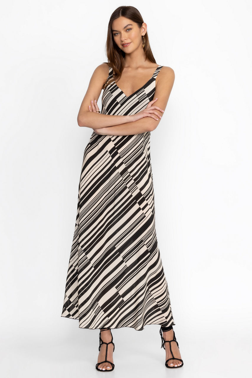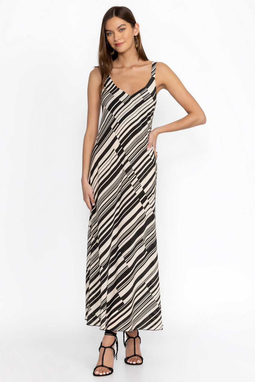 Crafted from a luxurious silk blend, the Normania Bias Maxi Dress offers a unique pattern of contrasting stripes. Featuring a V-neckline at the front and back paired with spaghetti straps, this fully-lined, A-line dress is perfect for a variety of occasions. Pair with leather sandals and a wide-brim sun hat for a vacation ready look.