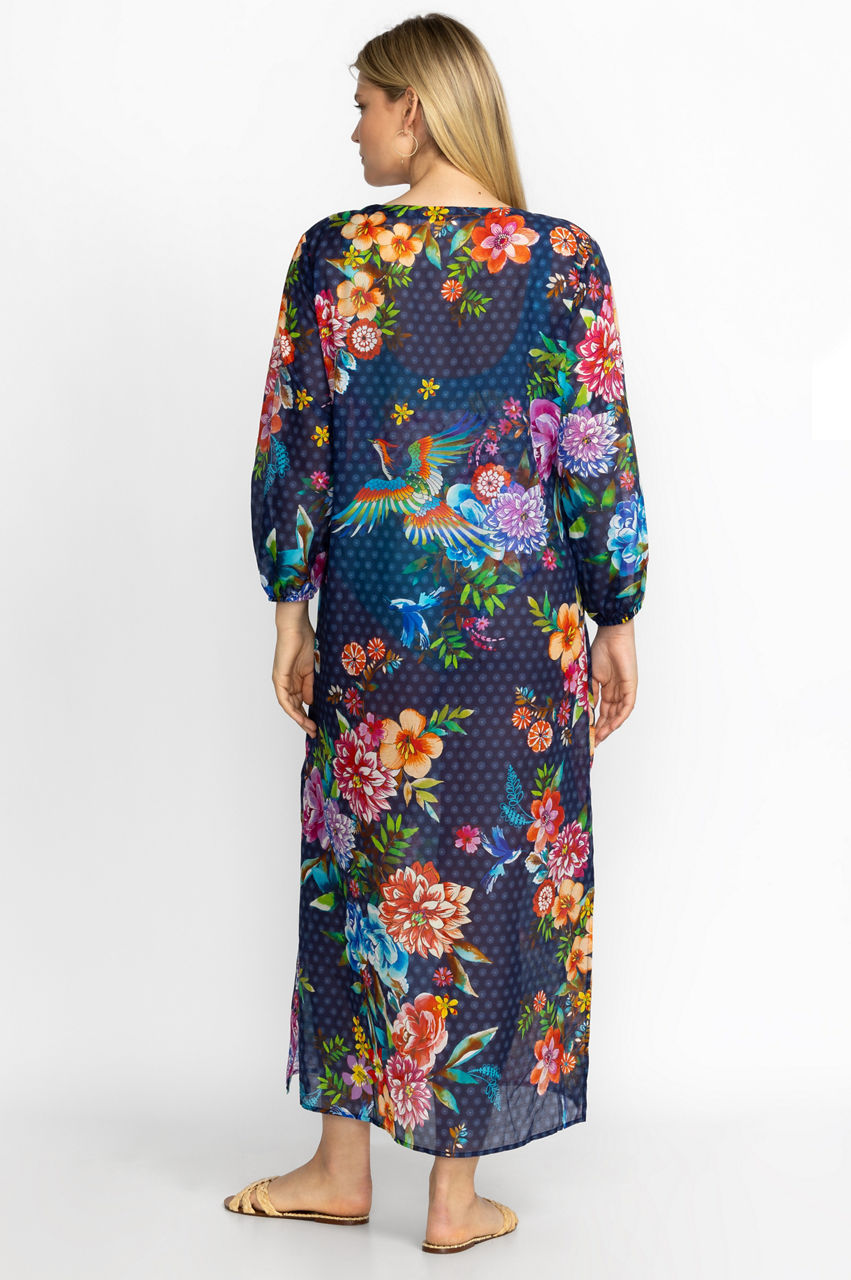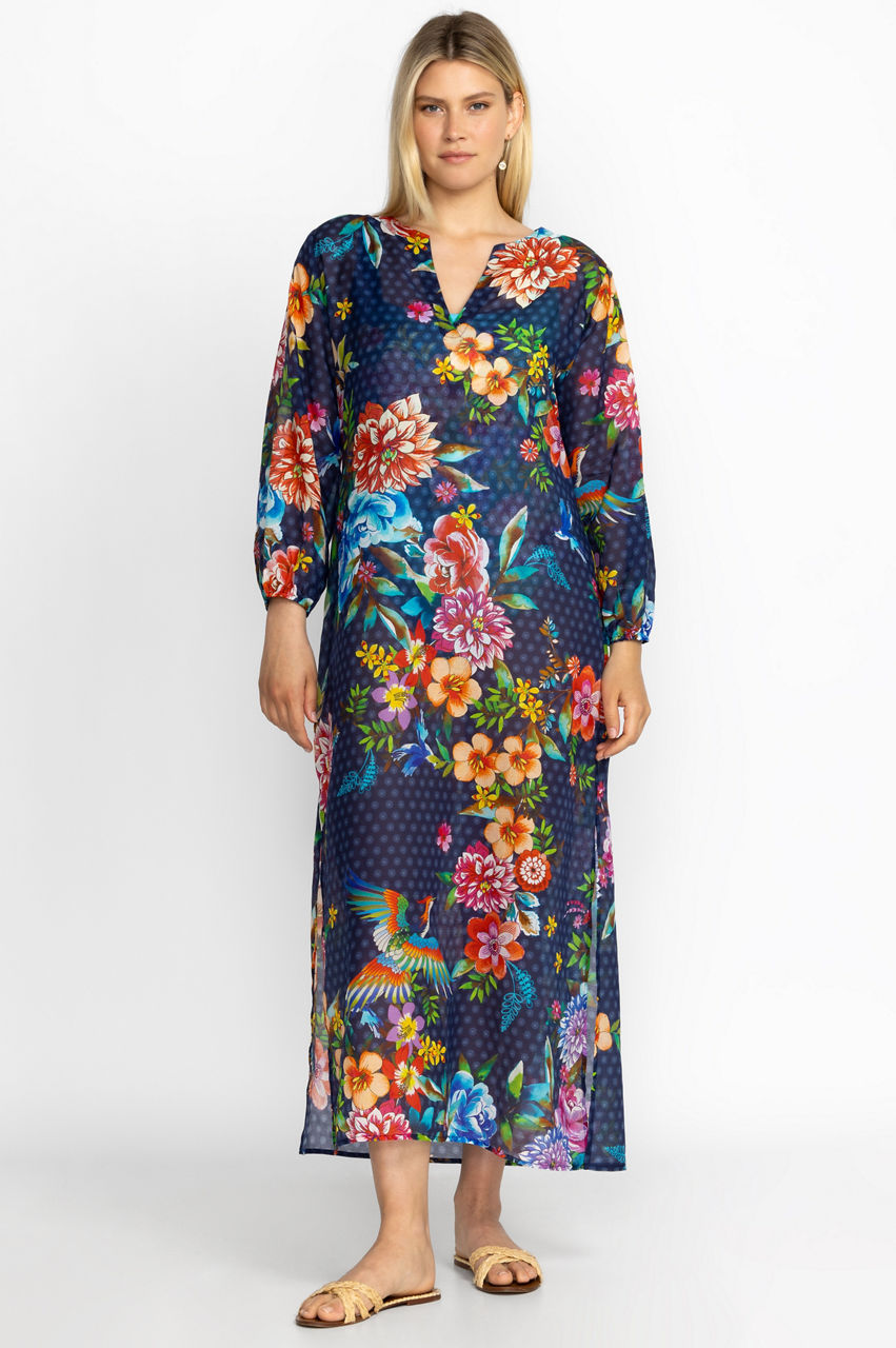 Rendered in vivacious shades, the Ocean Dreamer Puff Sleeve Maxi Cover Up is a graceful choice for poolside lounging and relaxed beach days. Falling to a maxi length, this cover up is designed from a sumptuous cotton silk blend and features a V-neck, long puff sleeves, and a selection of opened blooms. Throw on over a bikini and finish off the look with raffia extras.