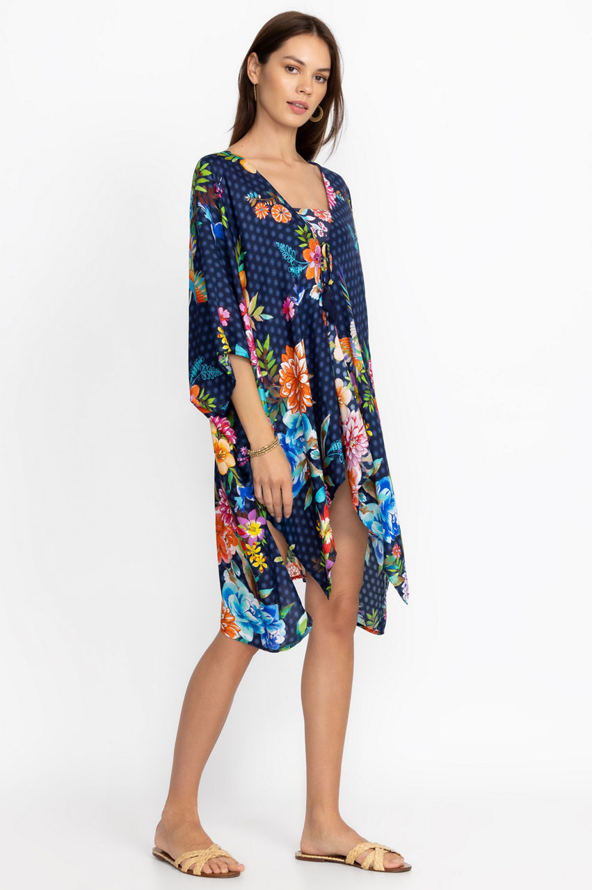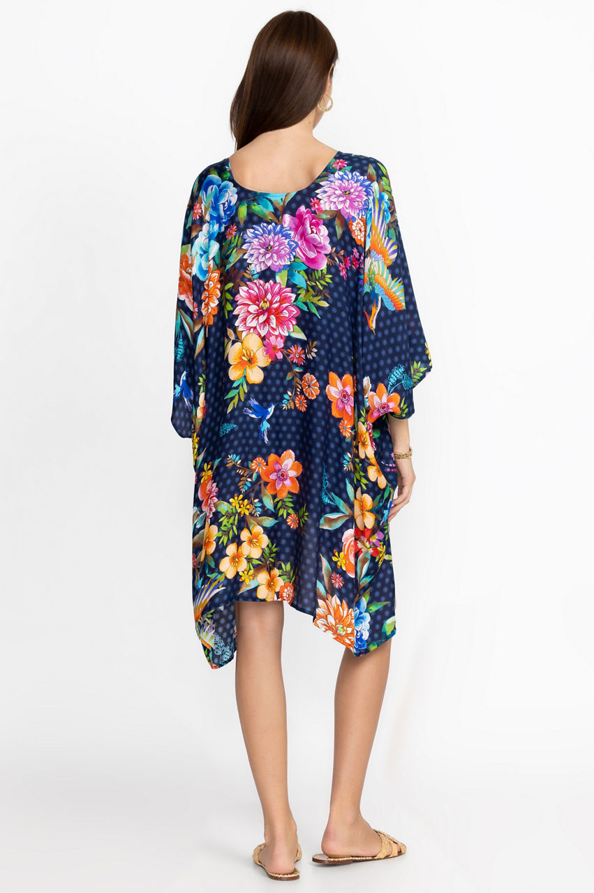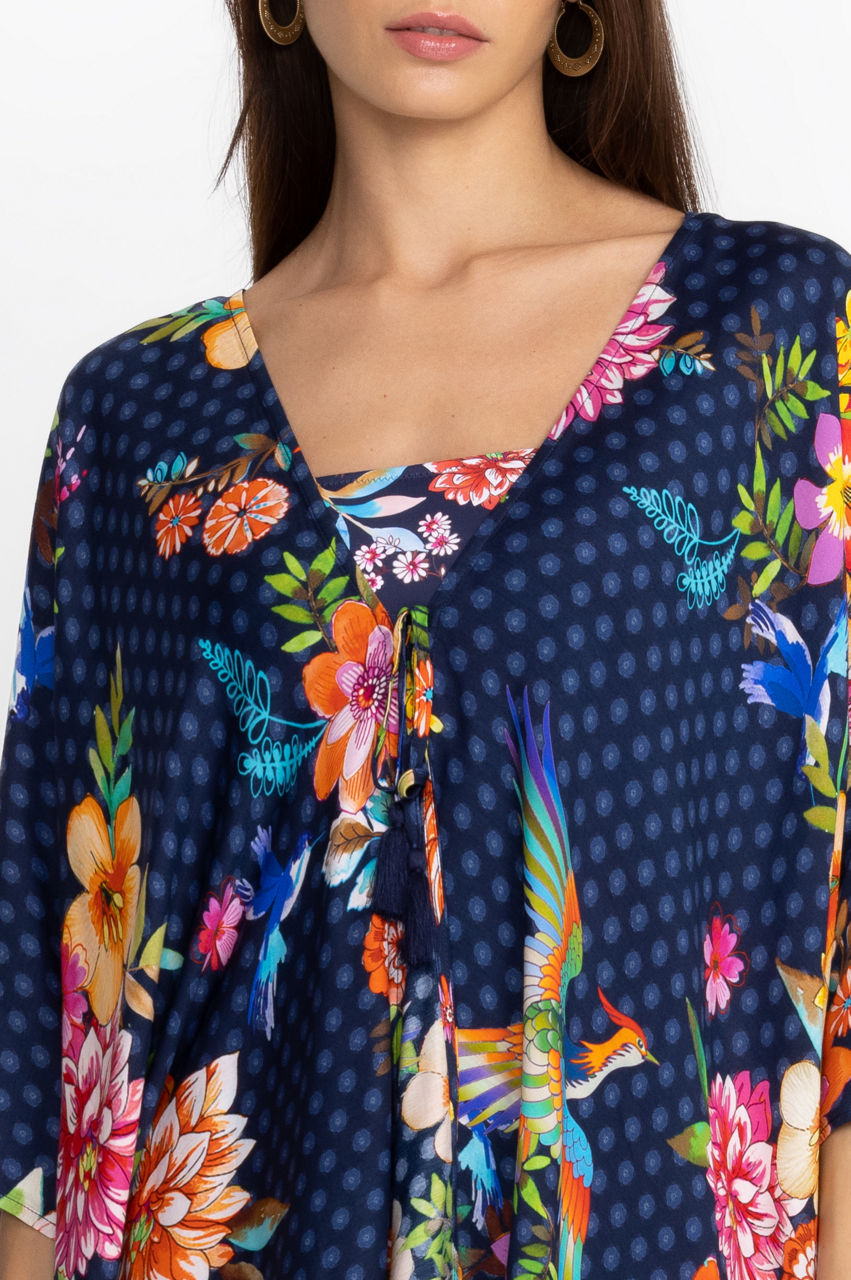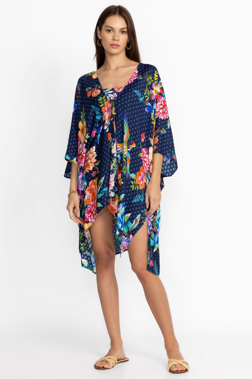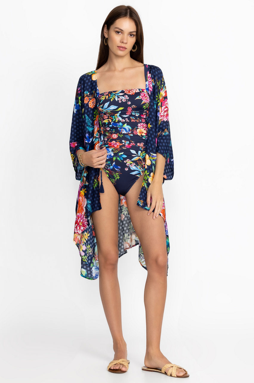 Pebbled beaches and sun-lit skies form the perfect backdrop for the colorful Ocean Dreamer Short Kimono. The perfect pick for exotic locations, this kimono is made from a lightweight silk material and features a self-tie closure with a tassel, long sleeves, and a breathtaking floral arrangement in bright tones. Style this kimono with a one piece and sunglasses to beachside drinks.