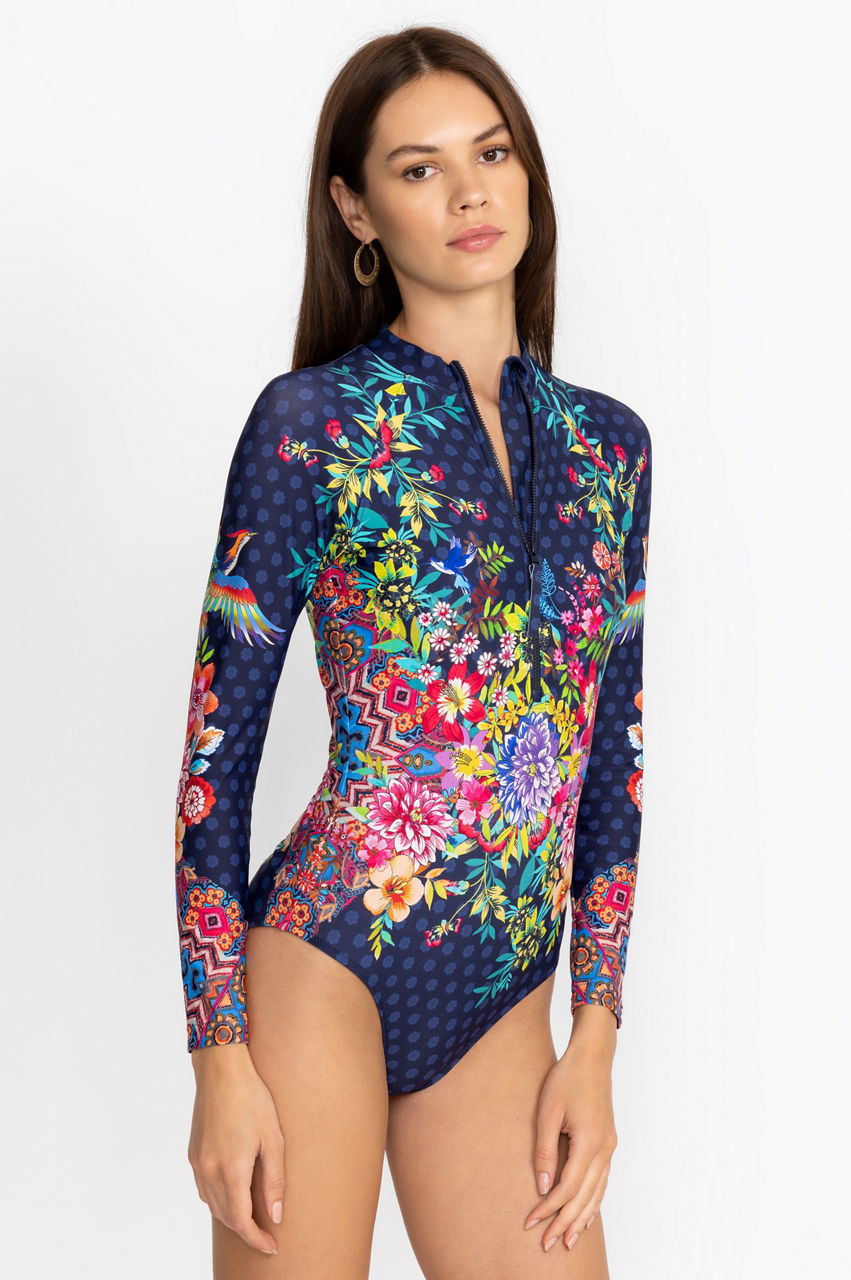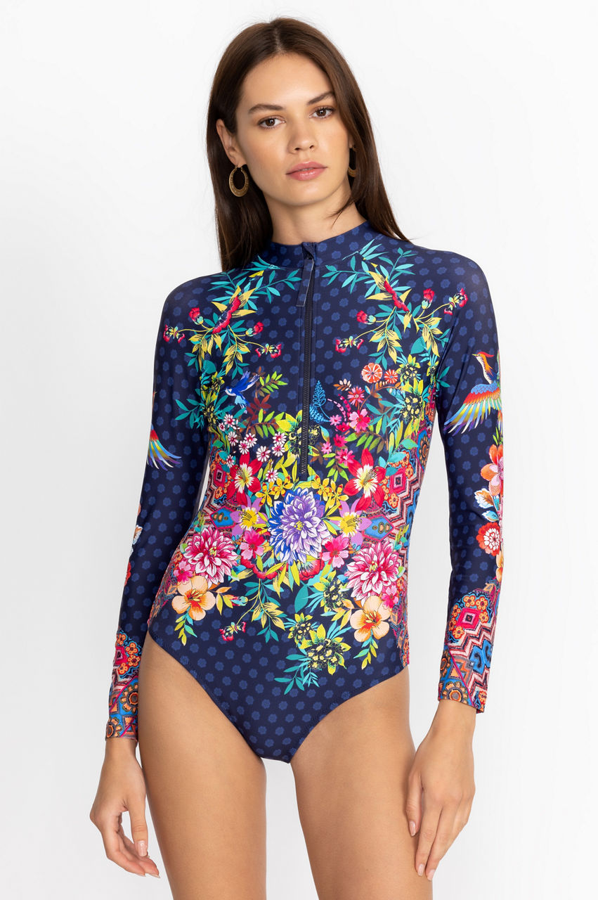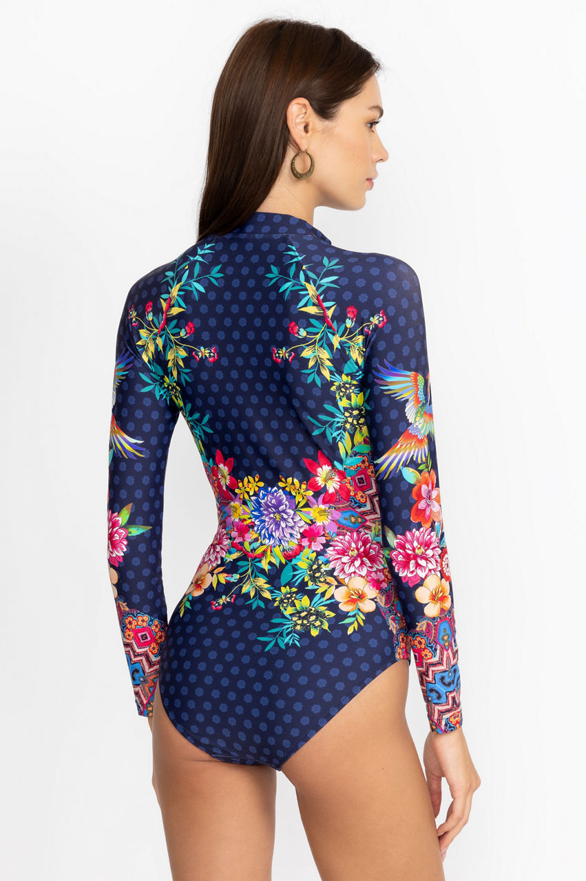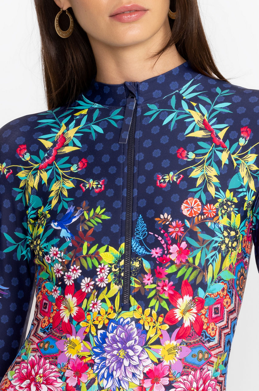 Made from a stretchy quick-drying fabric, the Ocean Dreamer Long Sleeve Surf Shirt is the perfect pick for a host of water-based activities and beachside lounging. Enhanced by eye-catching botanical motifs, this surf shirt boasts a zipper front, a full lining for added comfort, and long sleeves. Pair with the matching hipster bottoms for a stylish head-to-toe finish.
