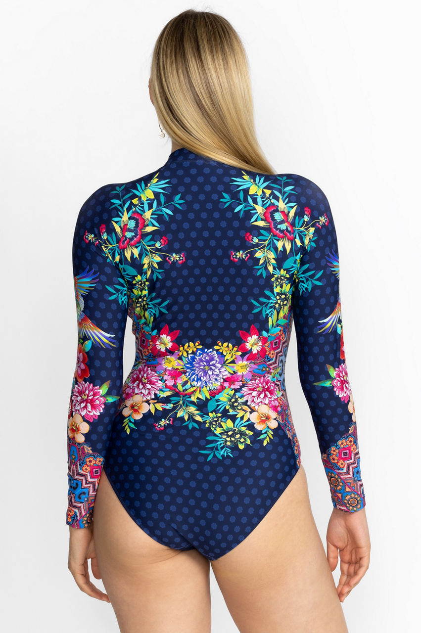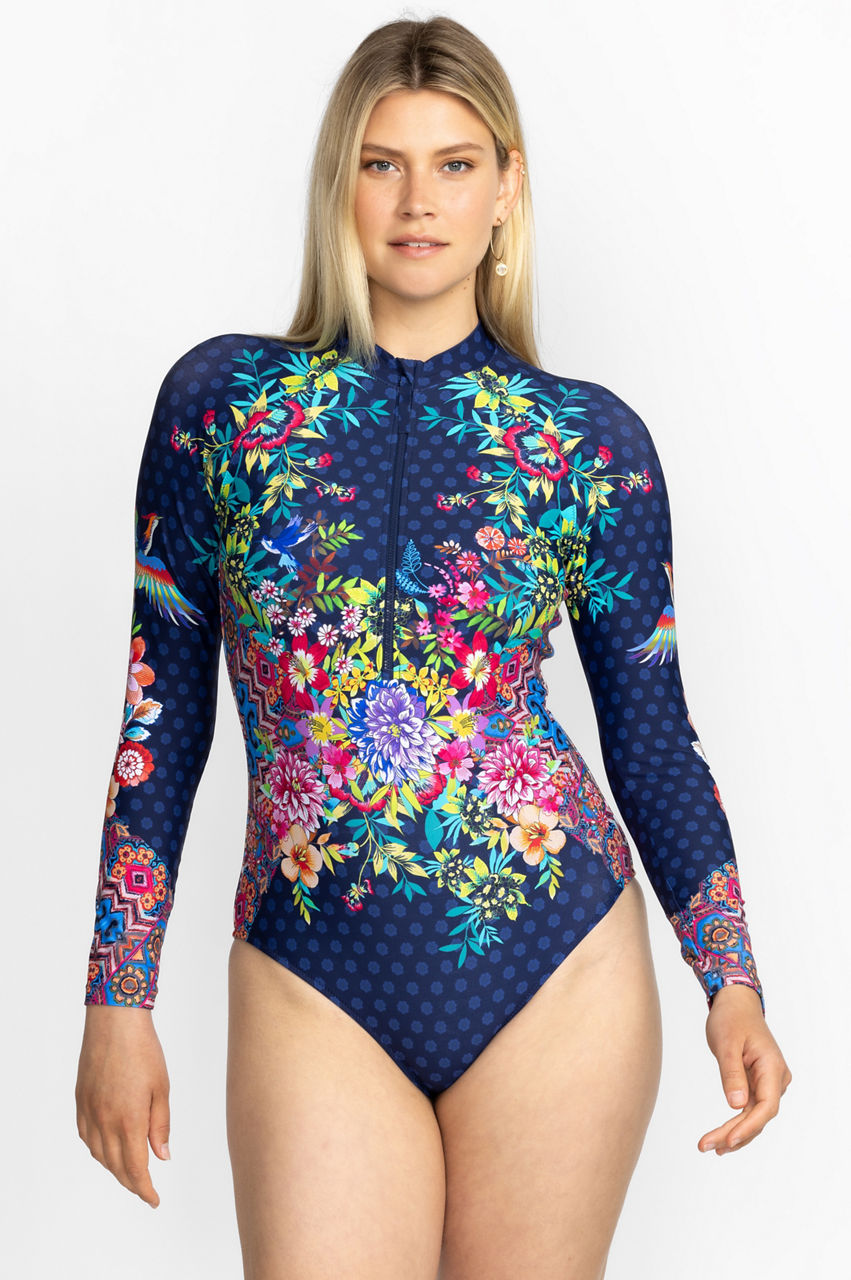 Made from a stretchy quick-drying fabric, the Ocean Dreamer Long Sleeve Surf Shirt is the perfect pick for a host of water-based activities and beachside lounging. Enhanced by eye-catching botanical motifs, this surf shirt boasts a zipper front, a full lining for added comfort, and long sleeves. Pair with the matching hipster bottoms for a stylish head-to-toe finish.
