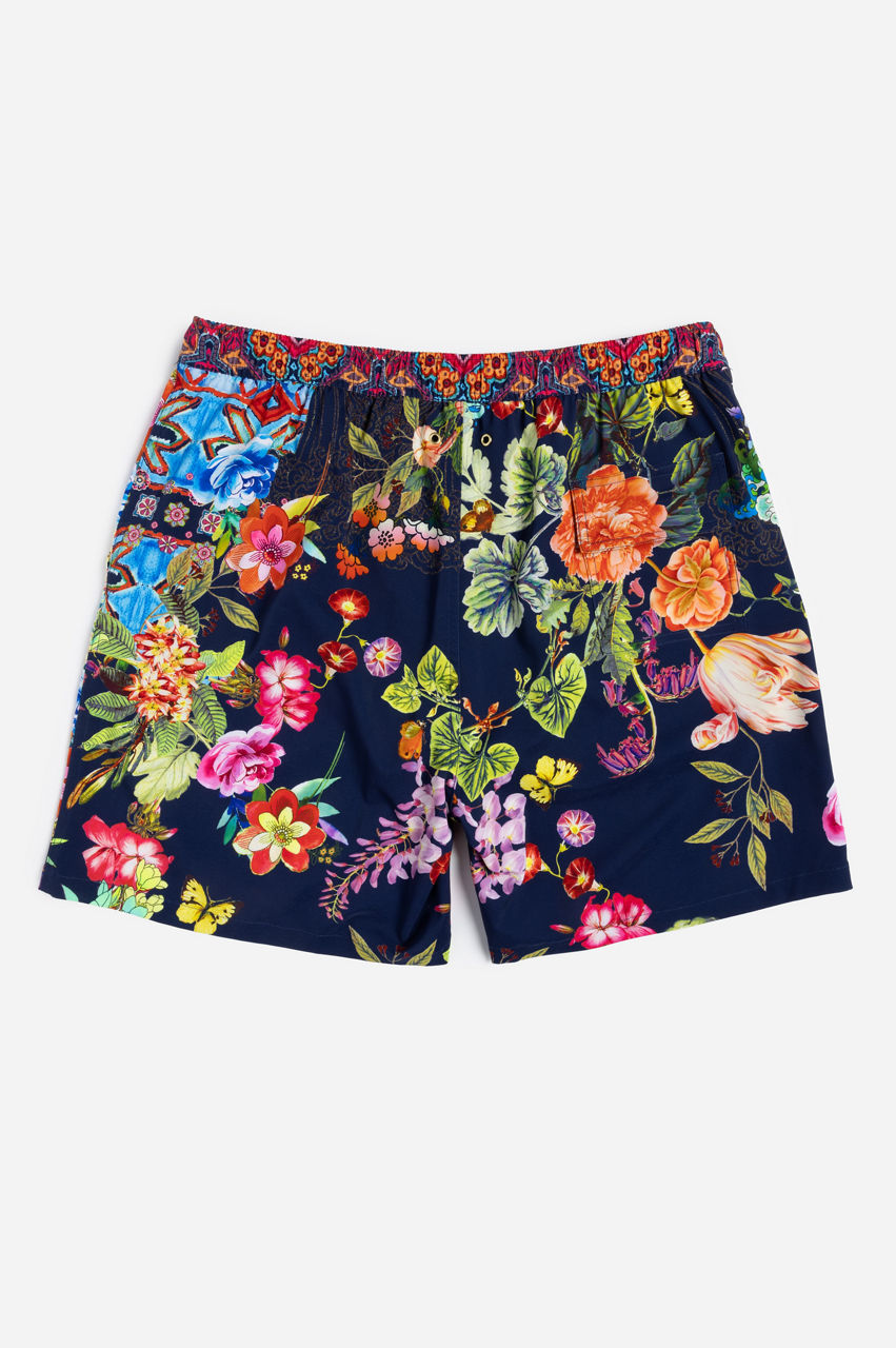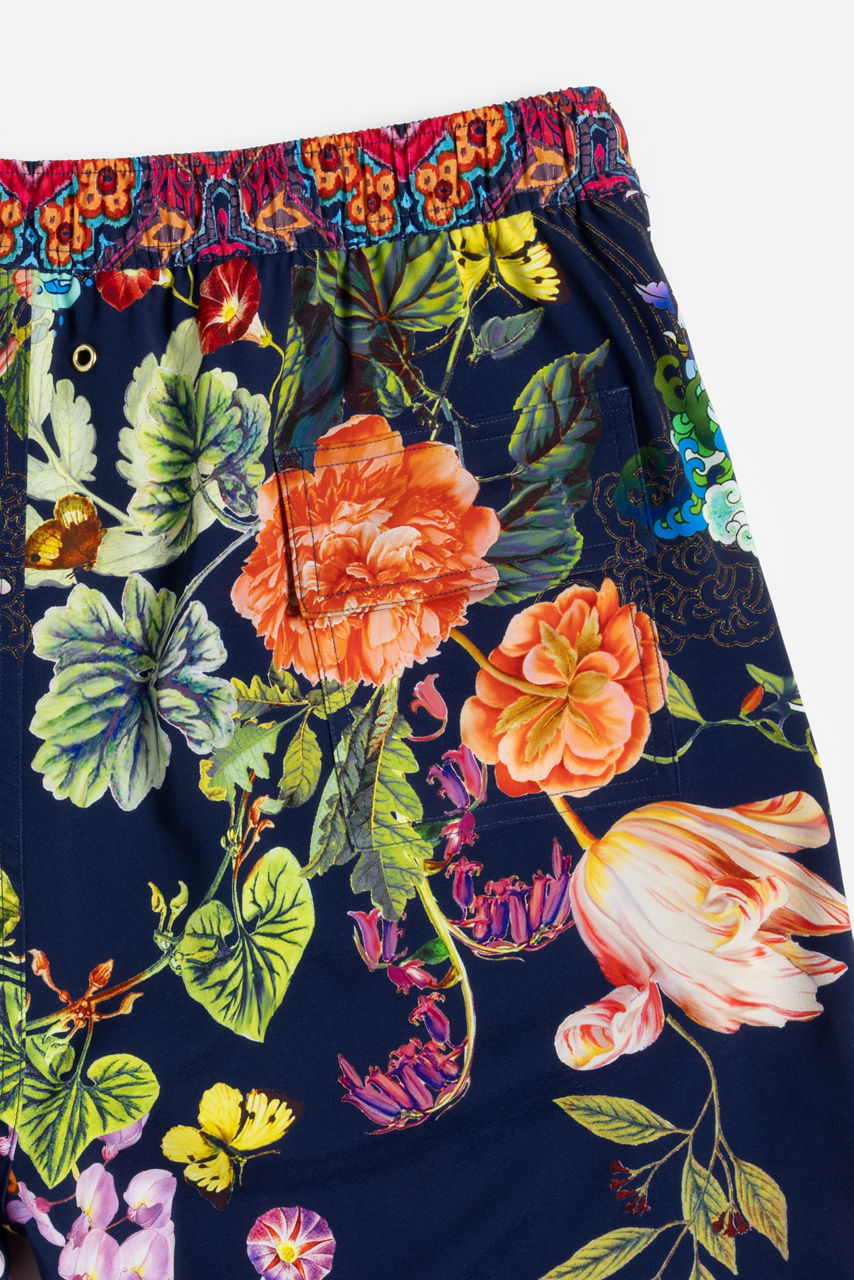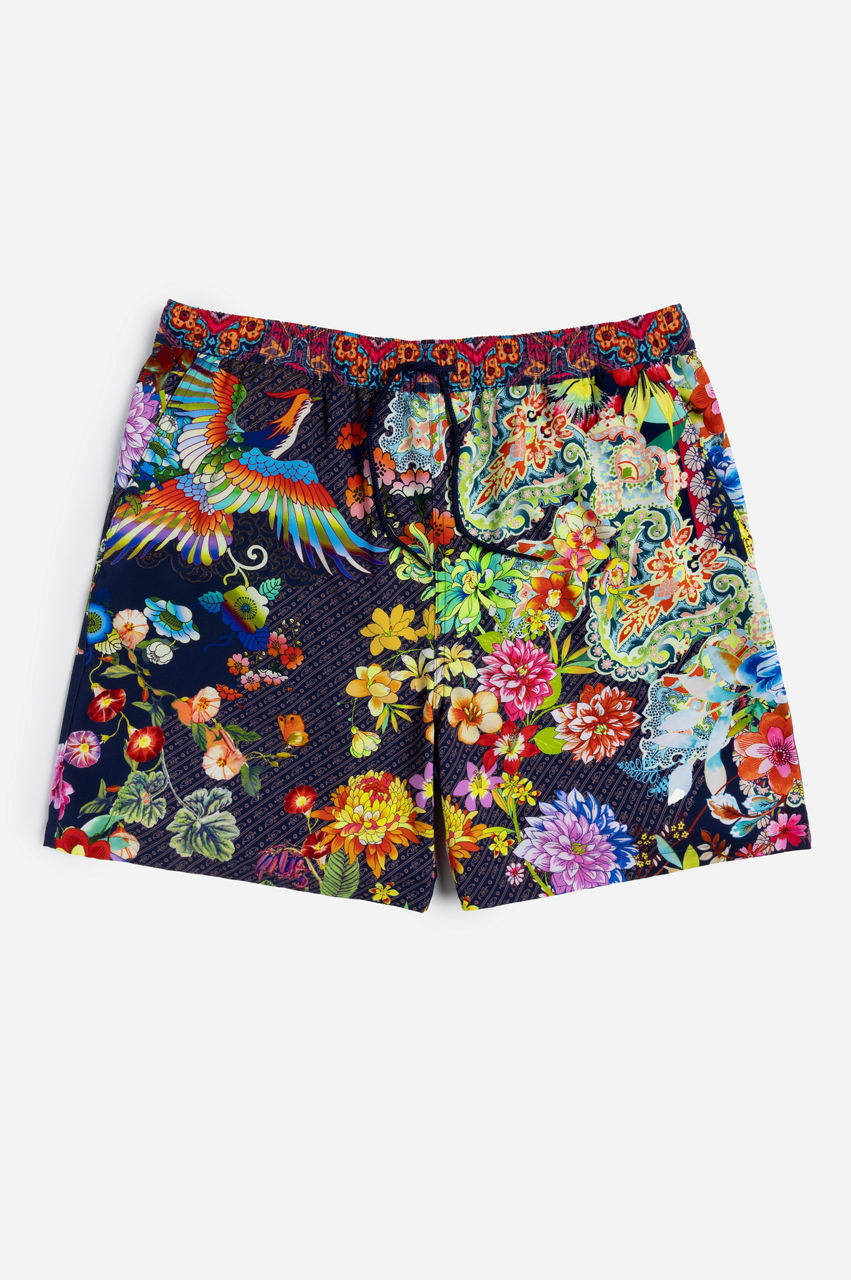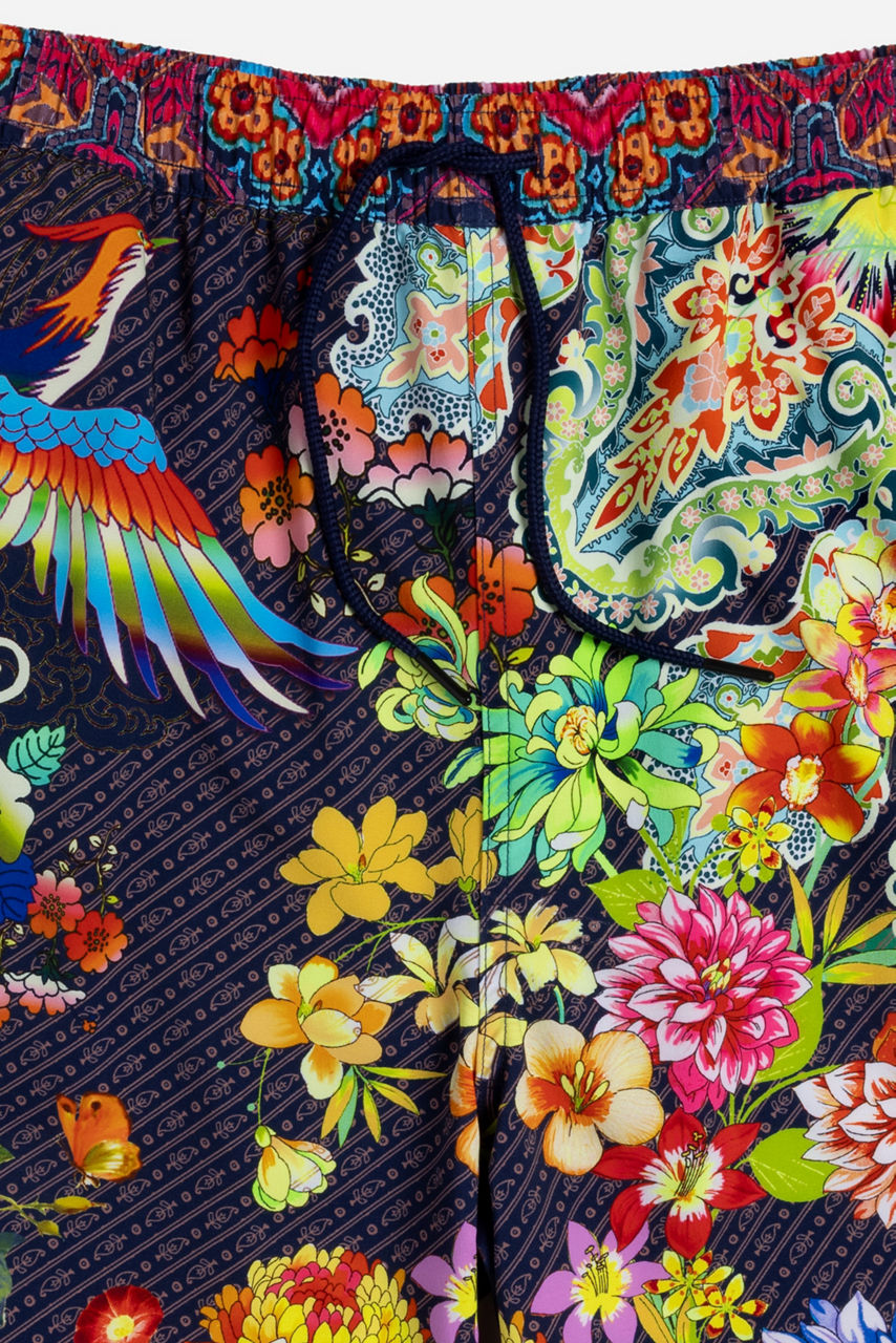 Crafted from a lightweight water-friendly material, the Ocean Men's Swim Trunks merge flamboyance with finesse. These swim trunks adopt a bright color palette and boast a drawstring elastic waistband, an inside brief for all-day comfort, practical pockets, and a hypnotic pattern comprising botanical and animal motifs. Finish off the ensemble with a plain white tee and ready-to-wander slides.