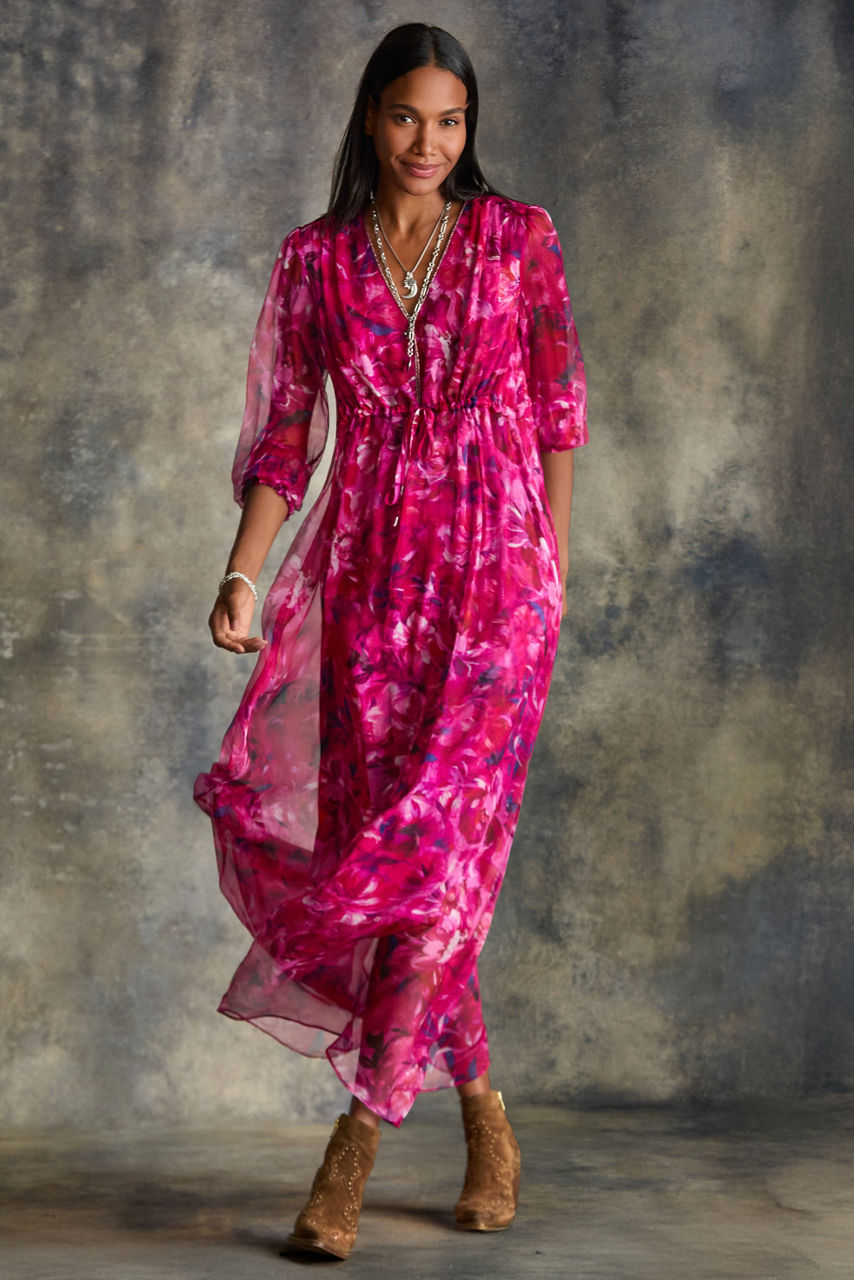 Crafted from 100% flowing silk, the Odessa Maxi Dress is adorned with a vibrant floral pattern in saturated hues of pink. Featuring a split V-neckline and shirred Bishop sleeves, this slip-lined dress is finished with a drawstring at the waist for a customizable fit. Pair with heels and delicate jewelry for an elegant daytime event.