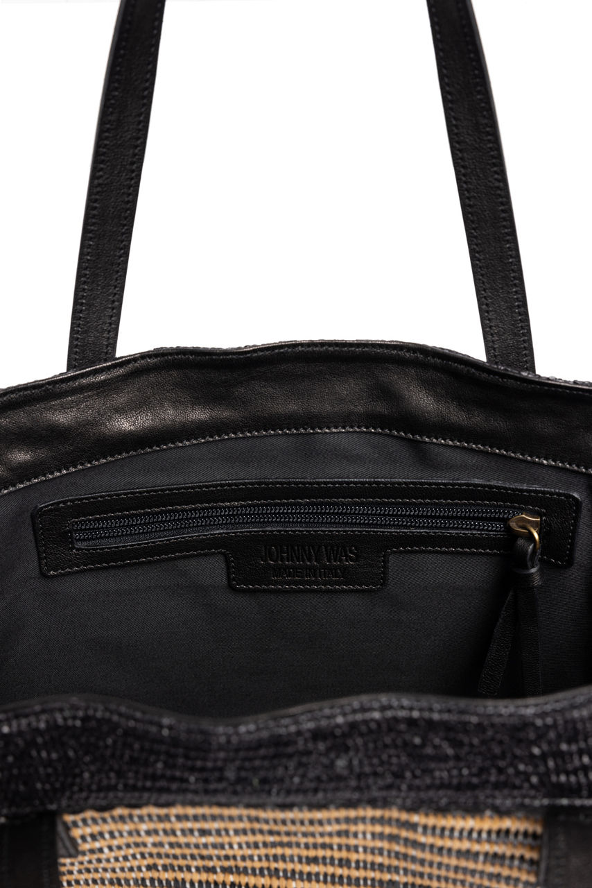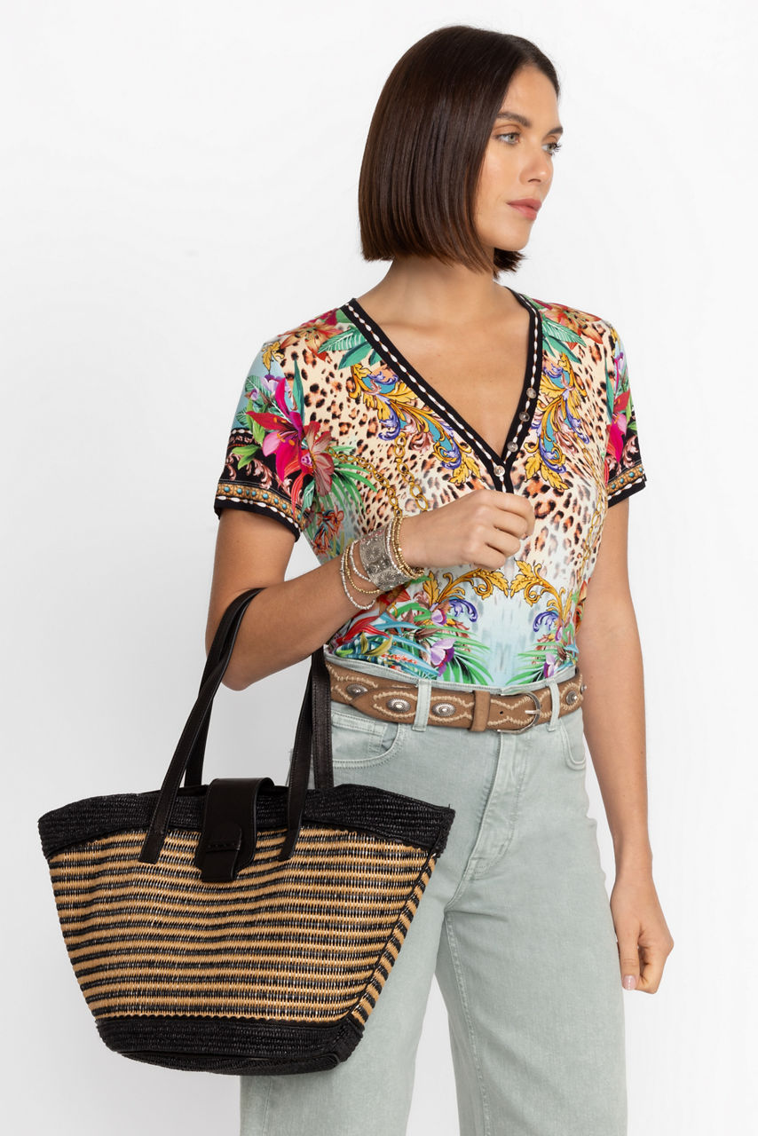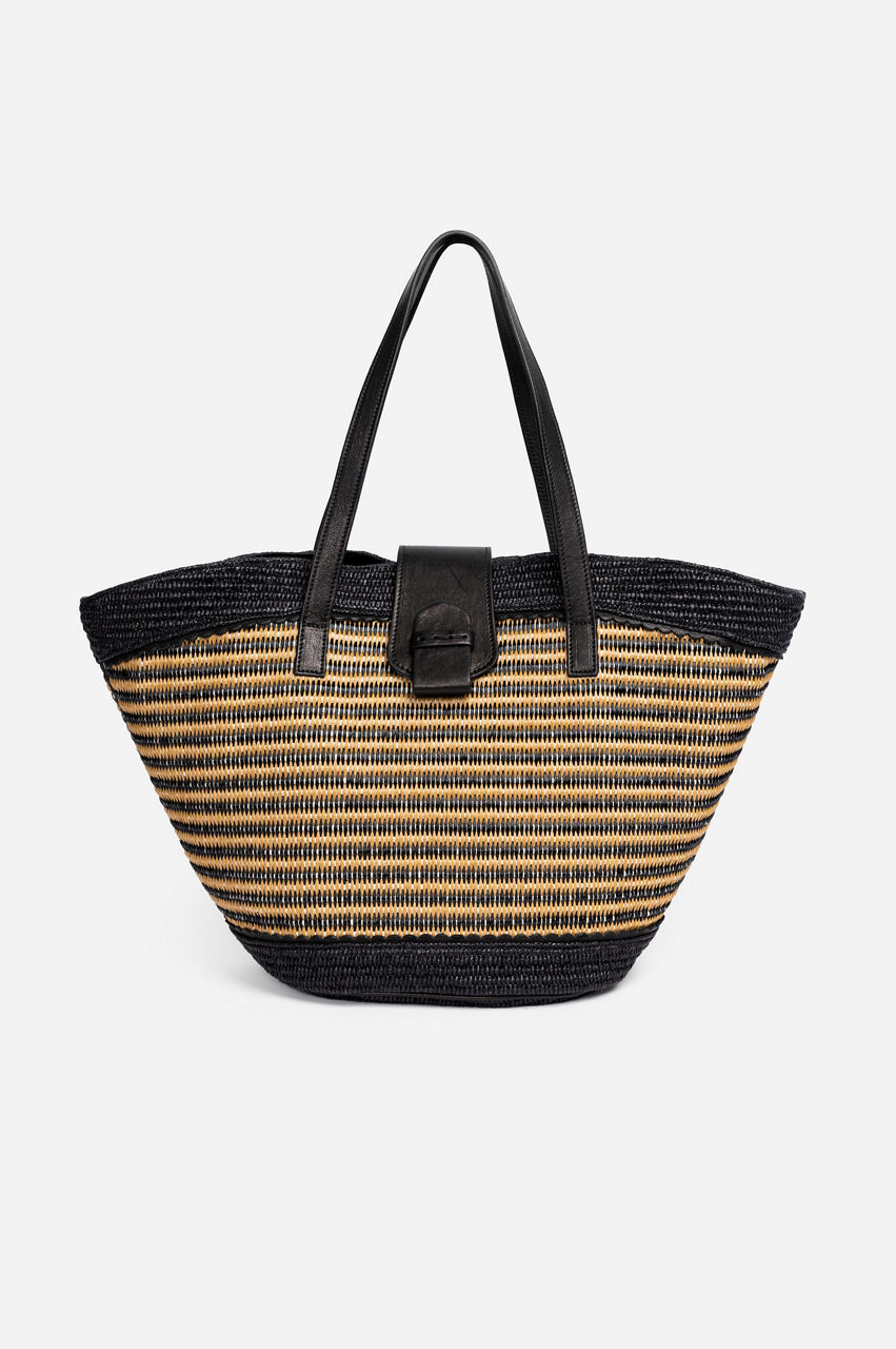 Crafted from 100% natural palm raffia, the Odna Italian Raffia Bag is the perfect resort-ready accessory. Featuring dual shoulder straps and a wide opening for easy access this bold black and tan bag blends perfectly with any look. Fill with poolside necessities and pair with a brilliant swim ensemble for a day catching rays.