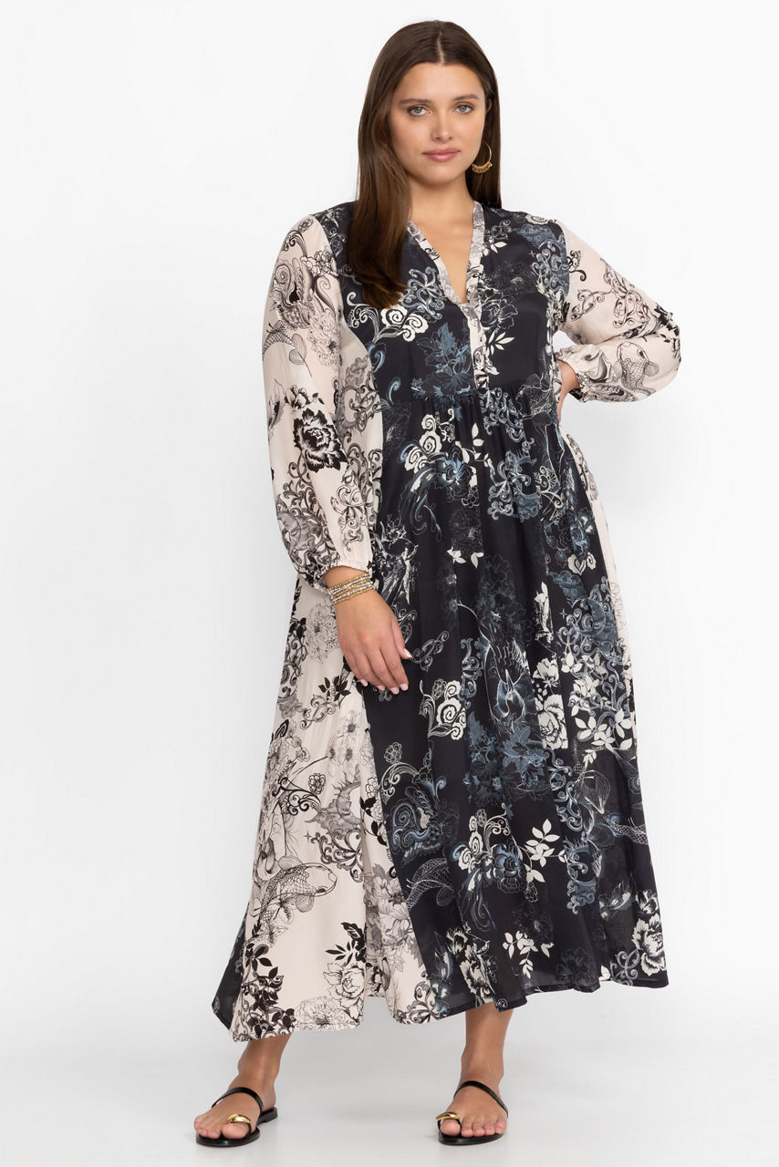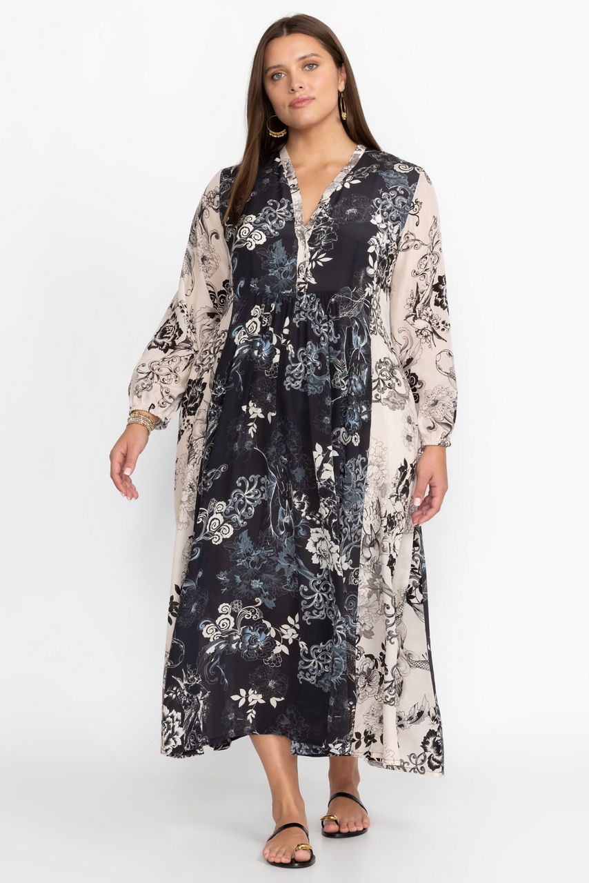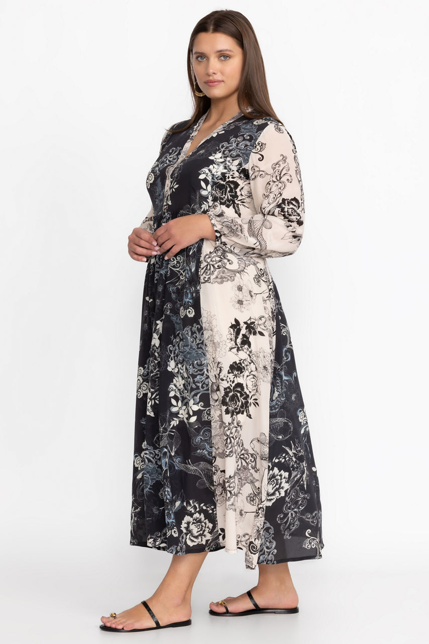 Imagined in lustrous silk, the Olivia Madi Dress is underscored with a romantic charm. A timeless addition to every wardrobe, this dress features a V-neck, long sleeves with elastic sleeve cuffs, pockets, fabric covered buttons, and a mesmerizing floral pattern. Wear this dress with a low heel to brunch with friends.