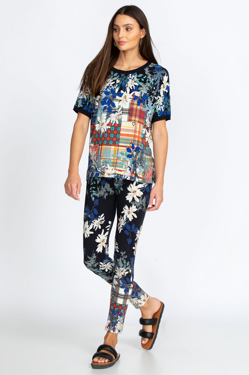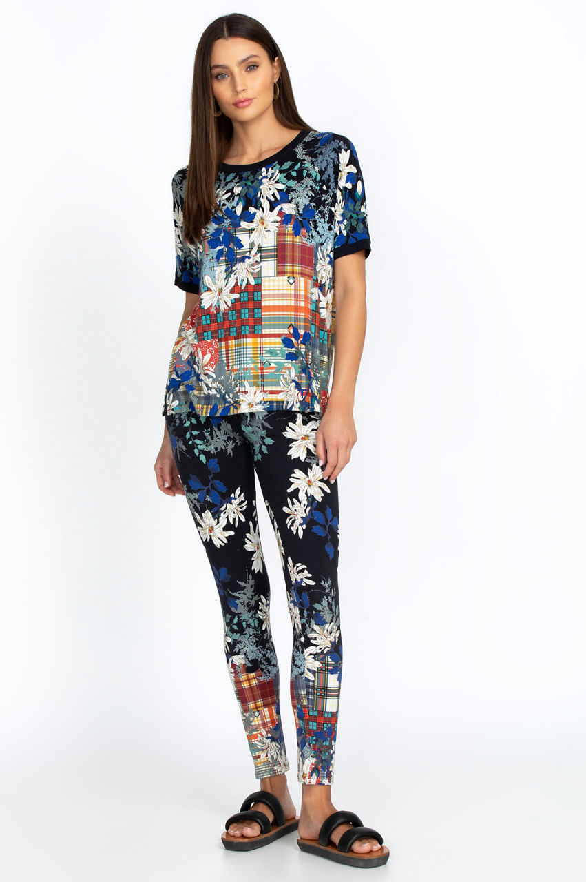 Create a flattering and elegant silhouette with the Ona Legging. The dark color has a slimming effect, while the floral print and discreet geometrical detail will sculpt your silhouette. Work out, run errands, or catch up with friends in style with these comfortable leggings that will complement your favorite peasant top nicely.