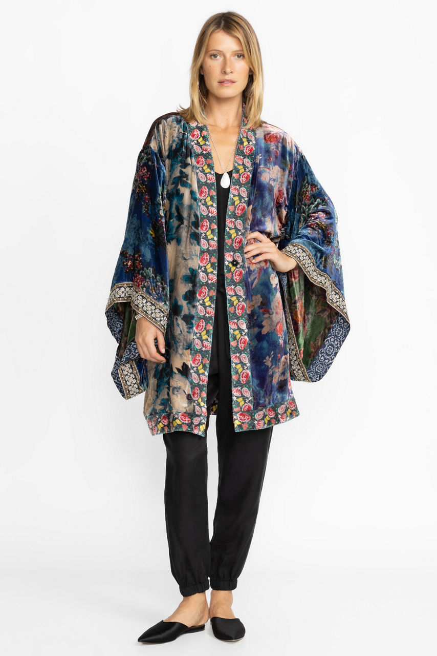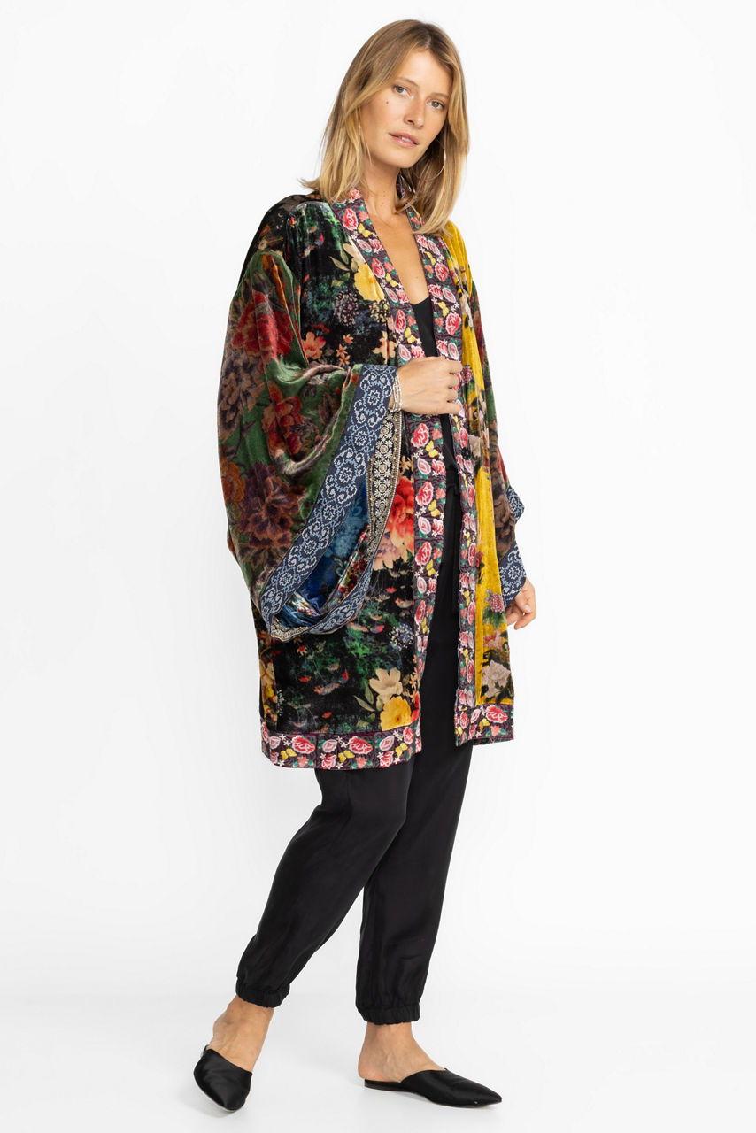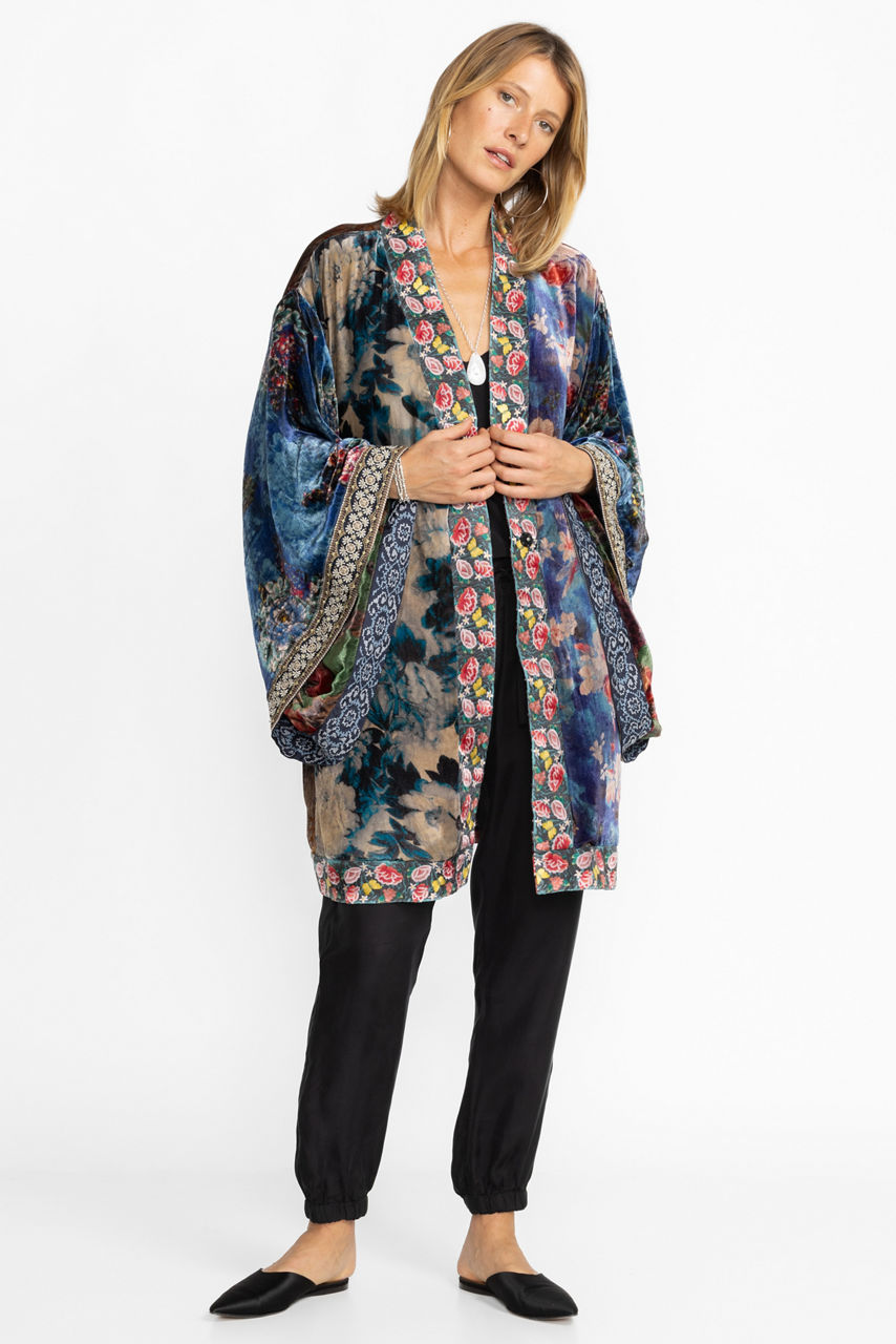 Conveying a romantic mood, the One of a Kind reversible Velvet Midi Kimono charms with its midnight color scheme and luxe composition. A stylish layer for the evening, this kimono is made from plush silk blend velvet and boasts long sleeves, a front closure, and a detailed floral pattern. Wear this midi kimono with a bias-cut dress or opt for a vest and smart pants for a more sophisticated approach.