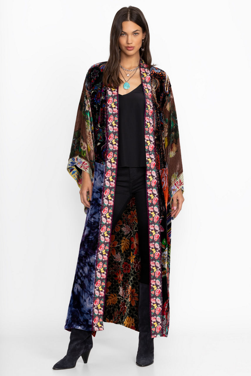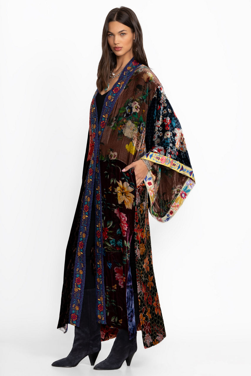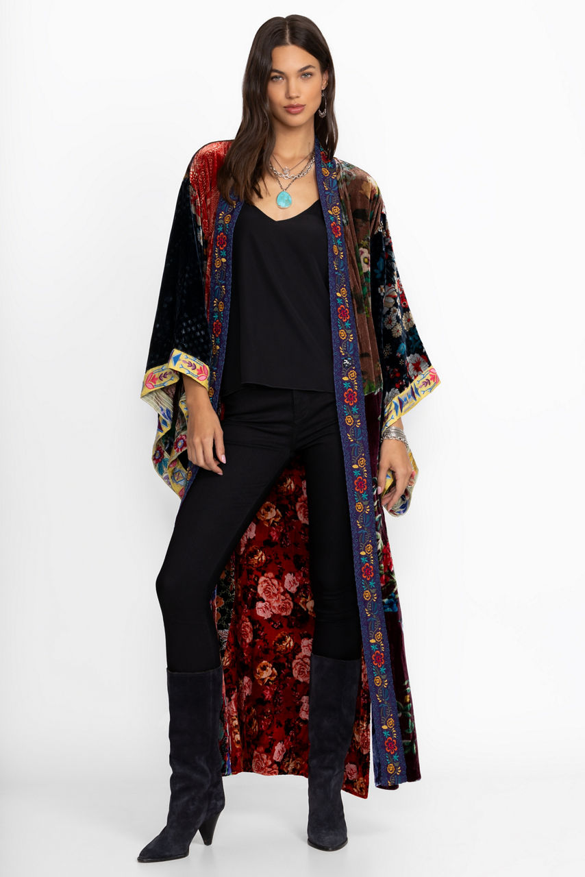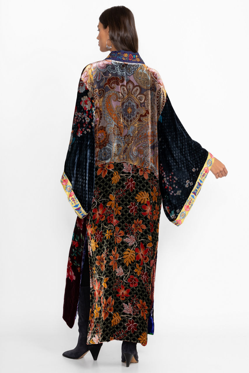 Individually crafted in Los Angeles, the One of a Kind Velvet Kimono is truly unique and no two are alike. Thoughtfully crafted from a plush silk-blend velvet, this full-length kimono is accented with wide sleeves and is finished with a snap-front closure and side vents. Wear over an outfit to add elegance or layer over silky sleepwear and pair with cozy slippers for a truly luxurious evening lounge wear ensemble.
