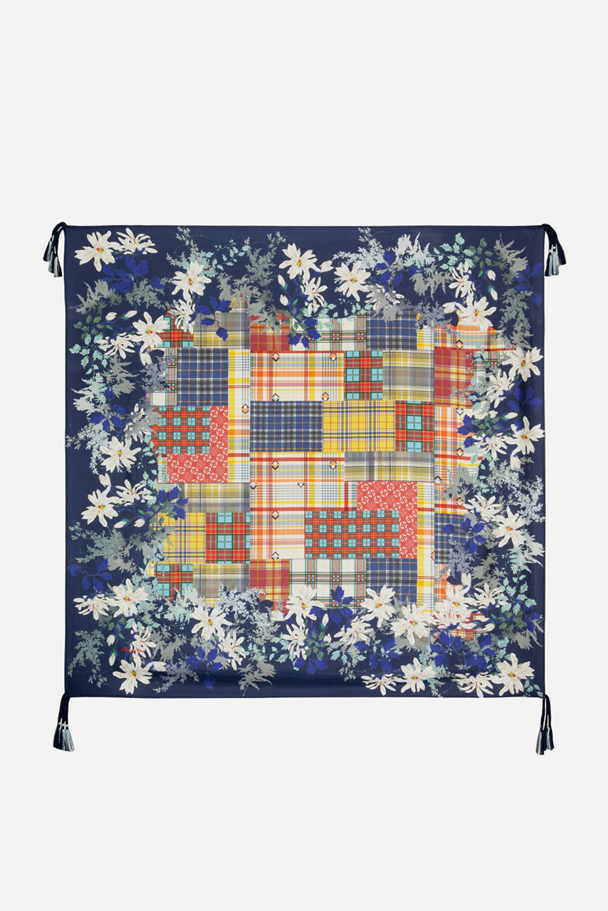The Ono Scarf artfully mixes a patchwork print and floral elements on a darker background. Tie or fold this scarf to create interesting visual juxtapositions between these two prints. The mix of warm and cold colors also creates a versatile accessory that can elevate any outfit. Draw attention to this scarf by wearing it with a light neutral top.