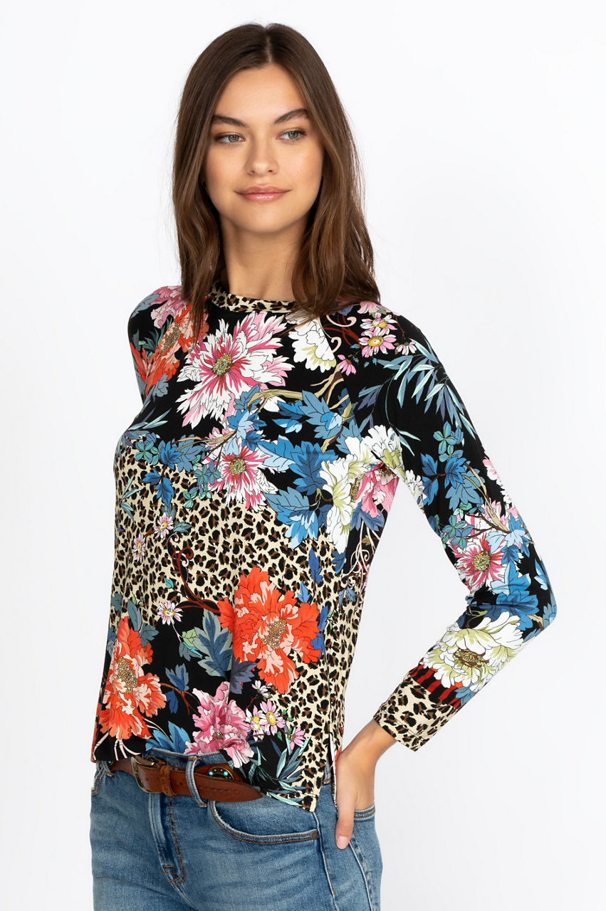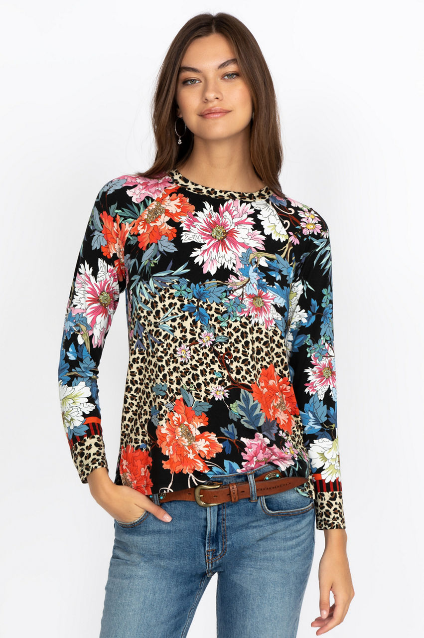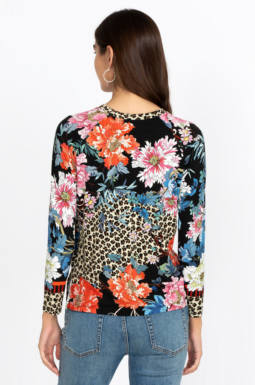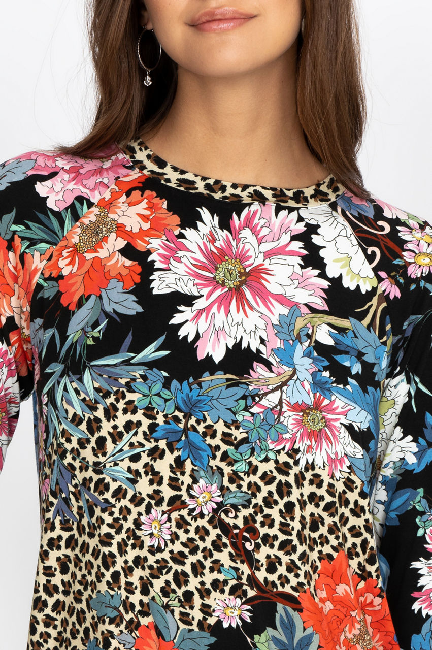 This comfortable raglan tee features bold floral motifs and geometric shapes. The classic cut makes this tee a versatile piece that will match different styles. Have fun accessorizing with colorful pieces that match the bold print, or wear this chic top as a base layer to create a contrast with a neutral jacket.