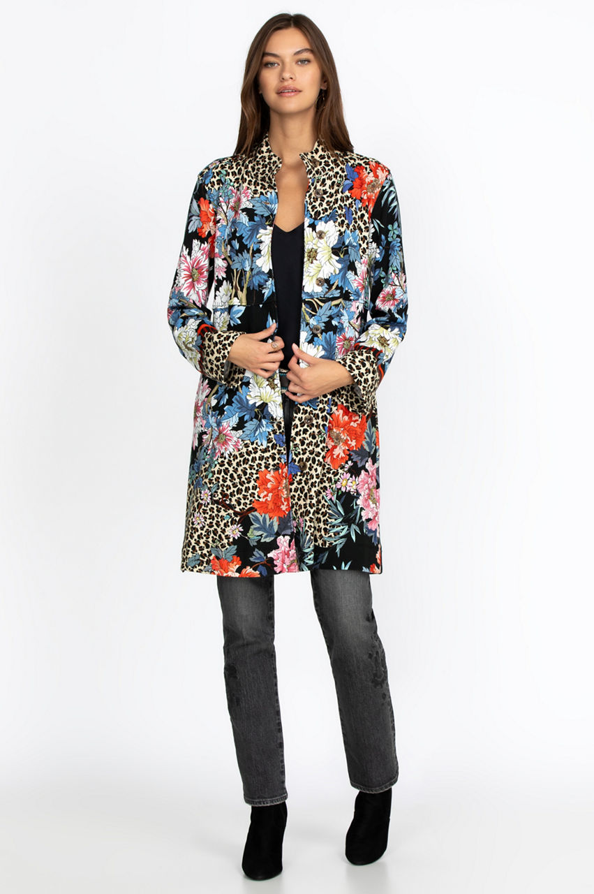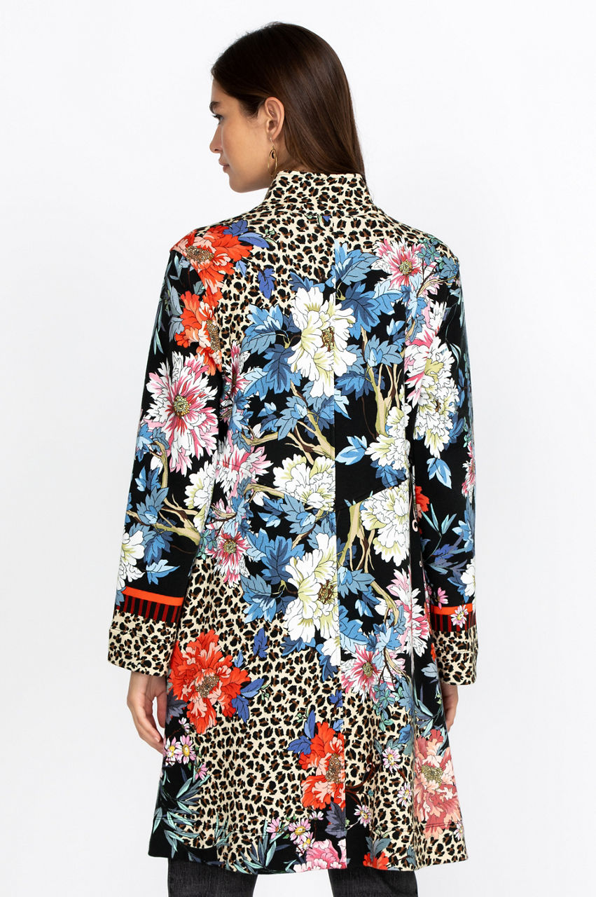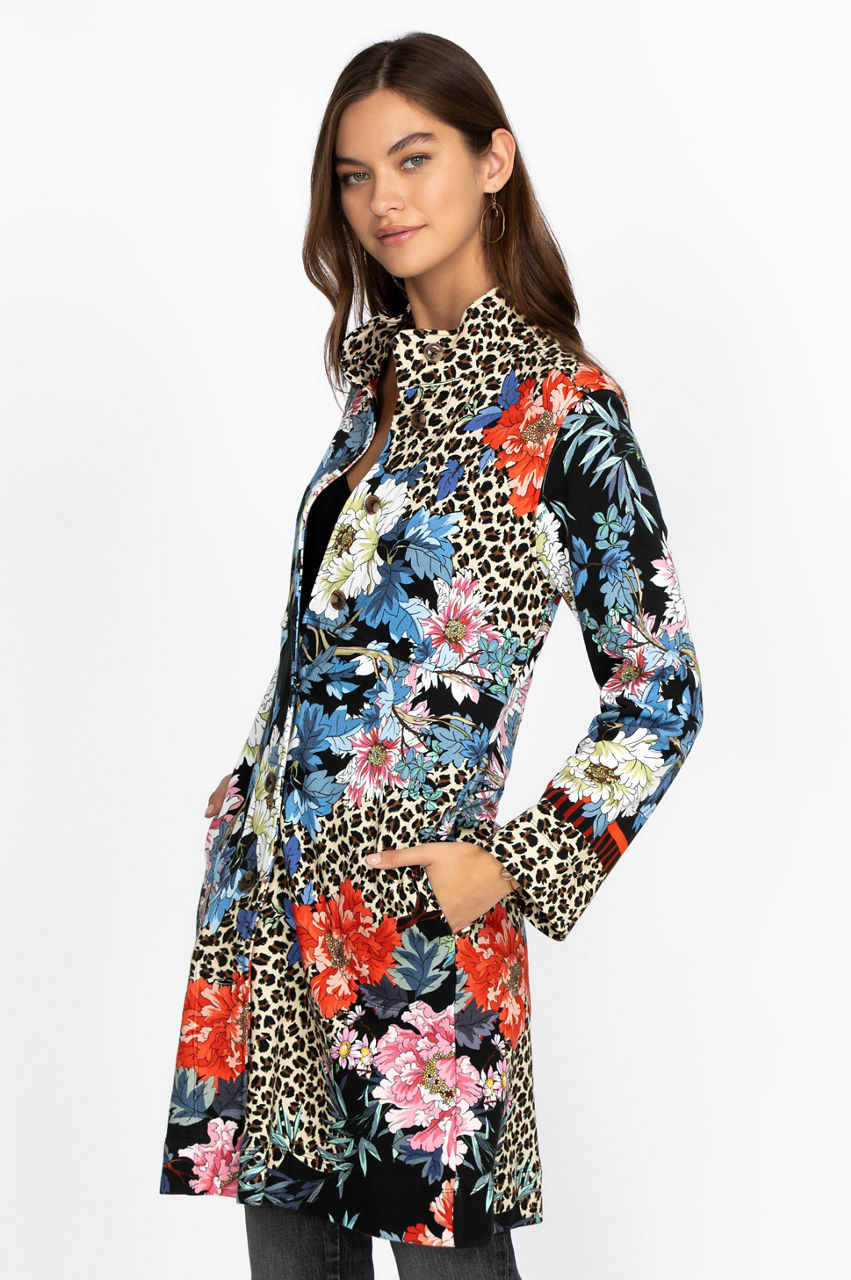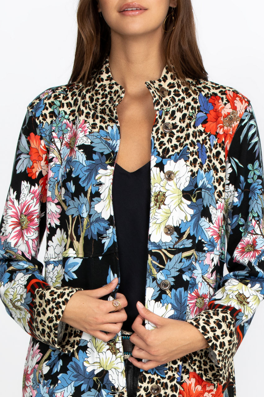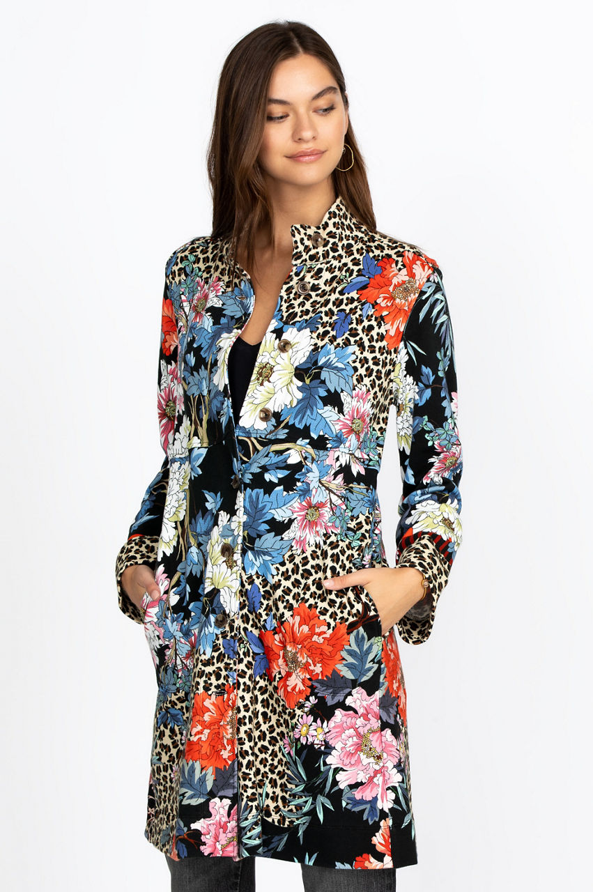 The Ontari Military Jacket is a stunning piece that combines floral motifs and geometric shapes. The military-inspired collar contrasts with the flowy hem, while the flattering fit makes this garment a versatile option. This chic jacket will quickly become your favorite go-to outerwear layer to complement simple jeans and tee outfit or over your favorite peasant top.