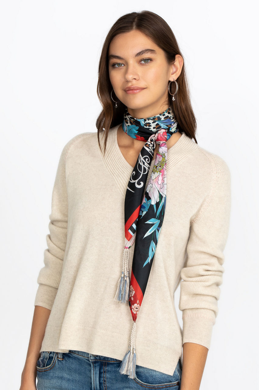 The Ontari Scarf is a bold accessory that will add colors and originality to your outfits with its floral and abstract motifs. Try pairing this stunning scarf with a red top or combine it with geometric jewelry for a modern result.