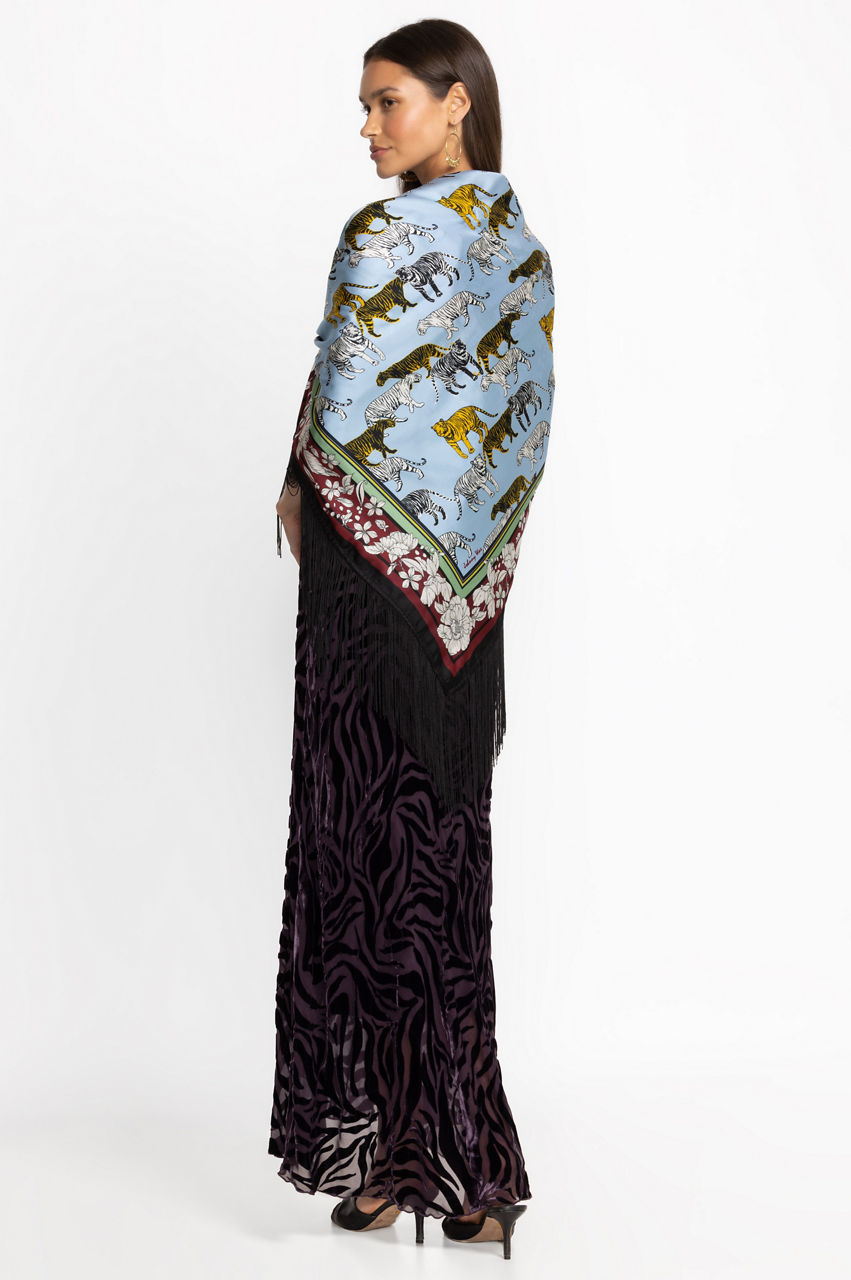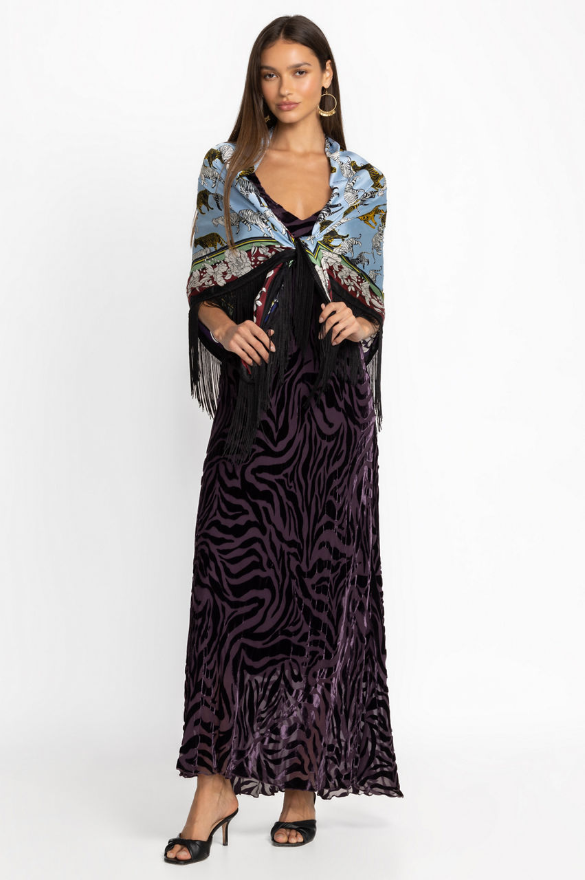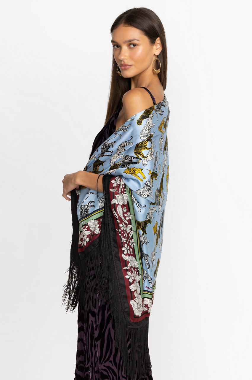 Exemplifying equal parts art and fashion, the Opal Shawl combines stunning design and luxurious fabric. Crafted from 100% exquisite silk and featuring a decorative fringe trim, this shawl brings botanical beauty to life. Layer over classic black trousers and a fitted black tank to allow this stunning layering piece to shine.