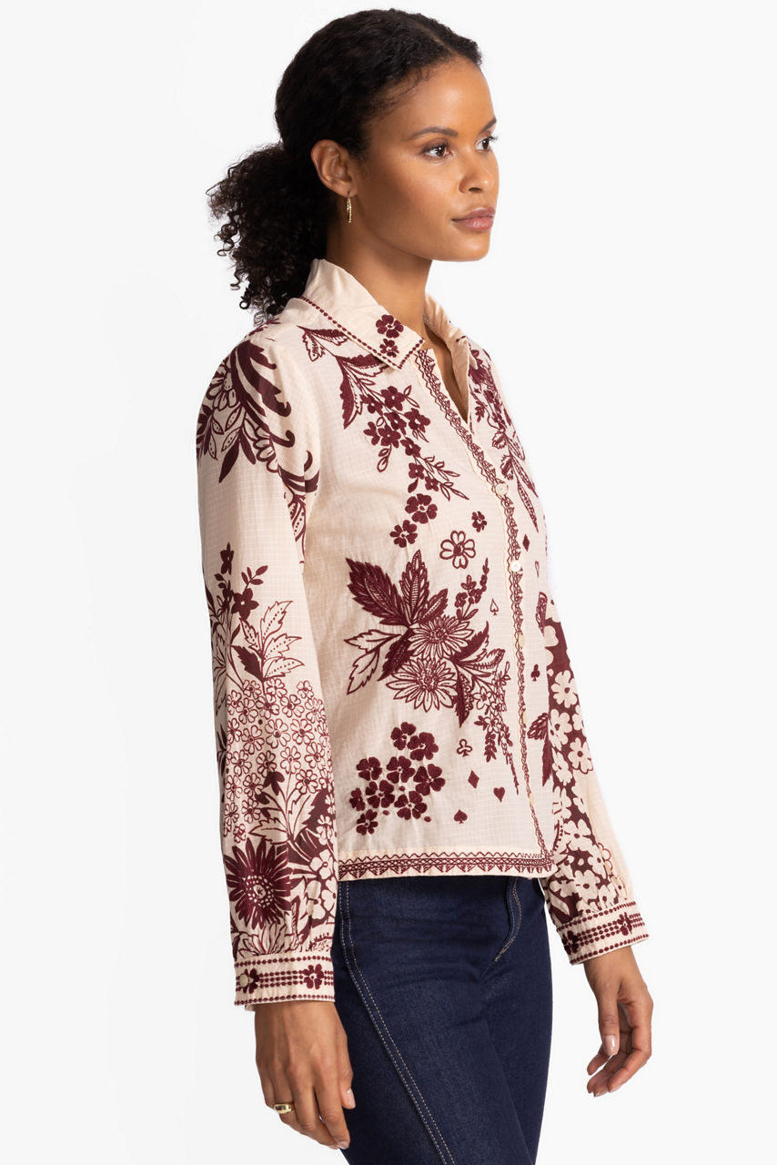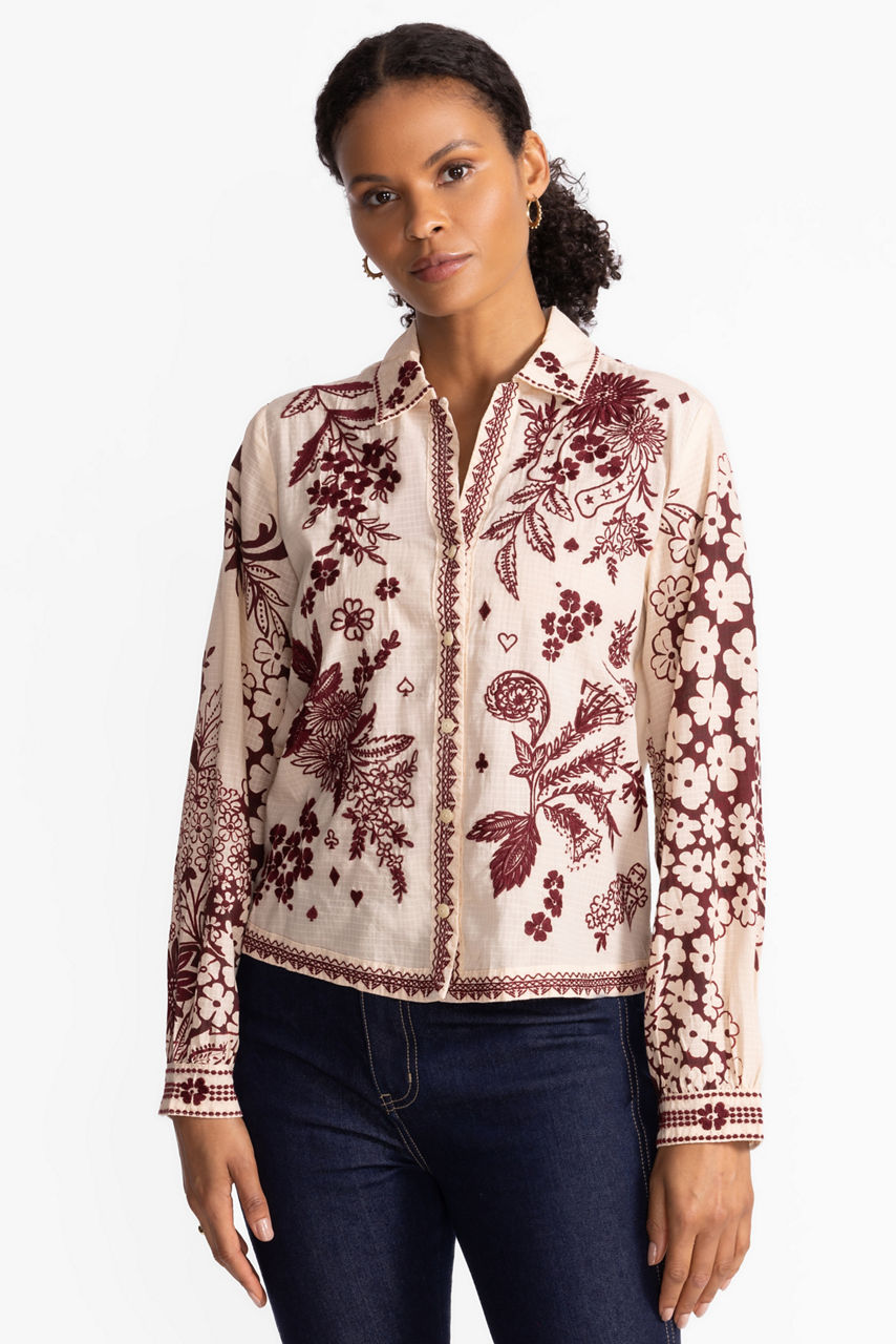 Crafted from a lightweight cotton blend, the Aquijio Open Neck Shirt is embellished with a bold floral pattern. Featuring an open neck and with a button-down style, this eye-catching top is finished with pearl snap buttons at the closure. Pair with high-waisted denim and red ankle boots for a fun night out.