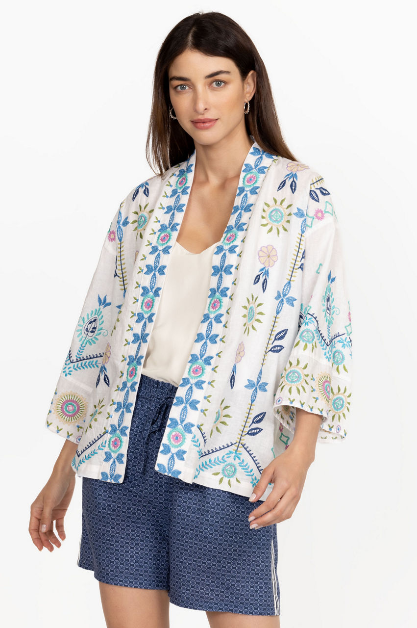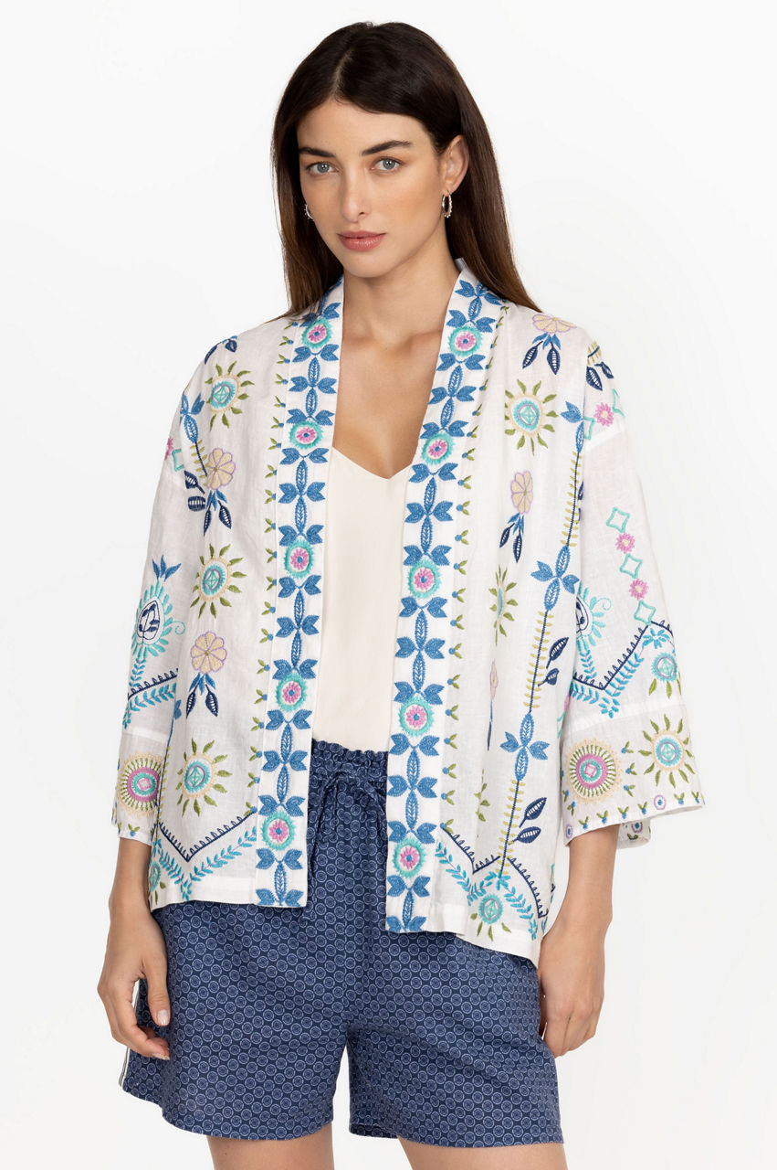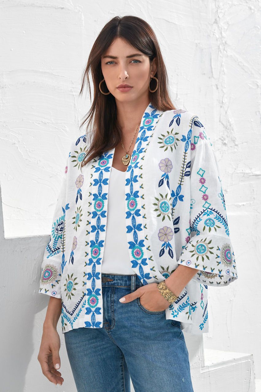 Crafted from pure linen, the Oriel Cropped Linen Kimono merges a traditional silhouette with bohemian-inspired motifs. This kimono is cut in a slightly relaxed fit with an open front, wide long sleeves, and an intricate placement embroidery comprising floral patterns. Layer this kimono over a tee and pair with jeans for an elevated daytime look.