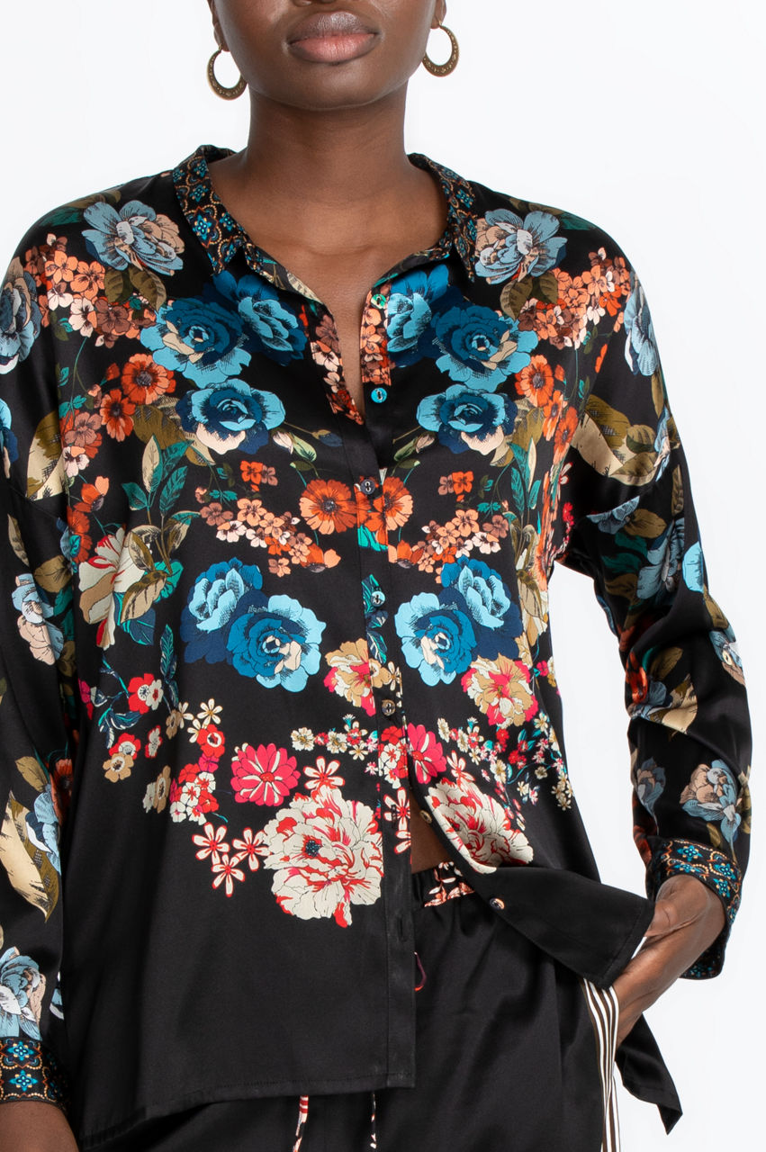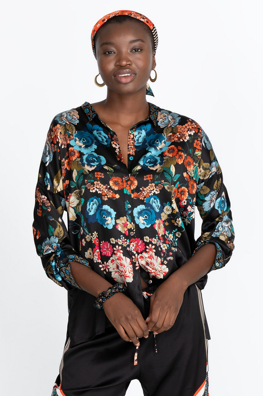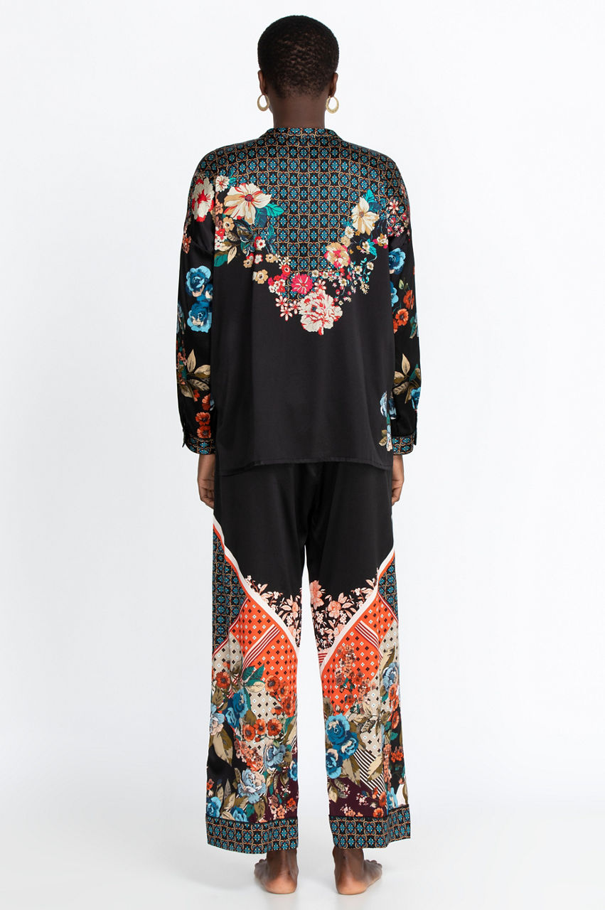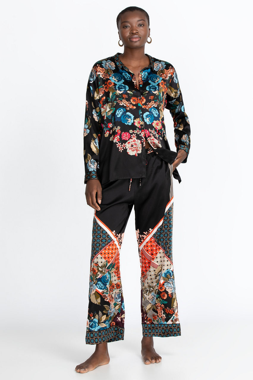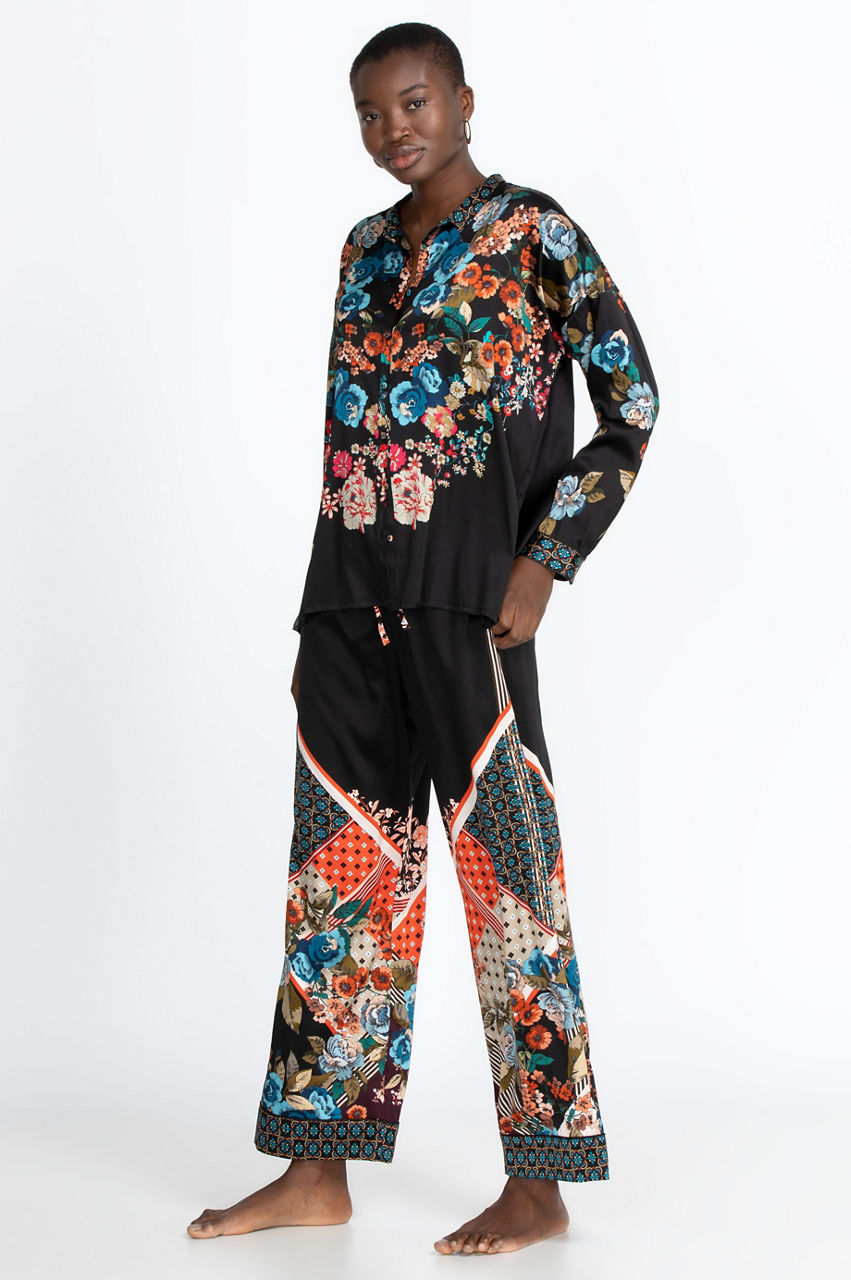 The Orla Lounge Set is the ultimate lounging outfit. It comes with a comfortable top with a vibrant floral print, some flattering pants with a comfortable waistband and gorgeous geometric print, a matching scarf, a scrunchie, and a bag that is ideal for traveling. All you need is a stylish robe or kimono to layer over this lounge set.