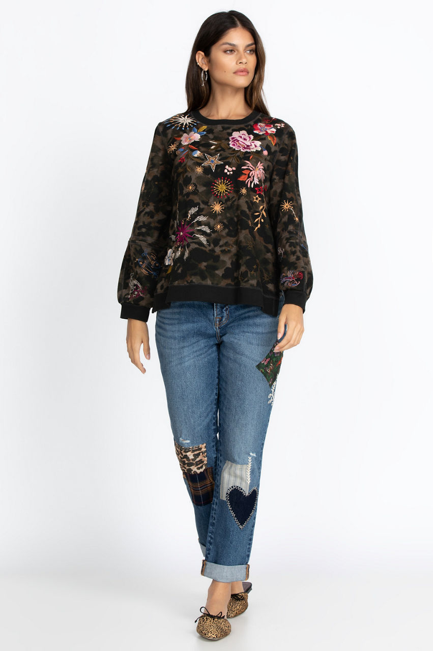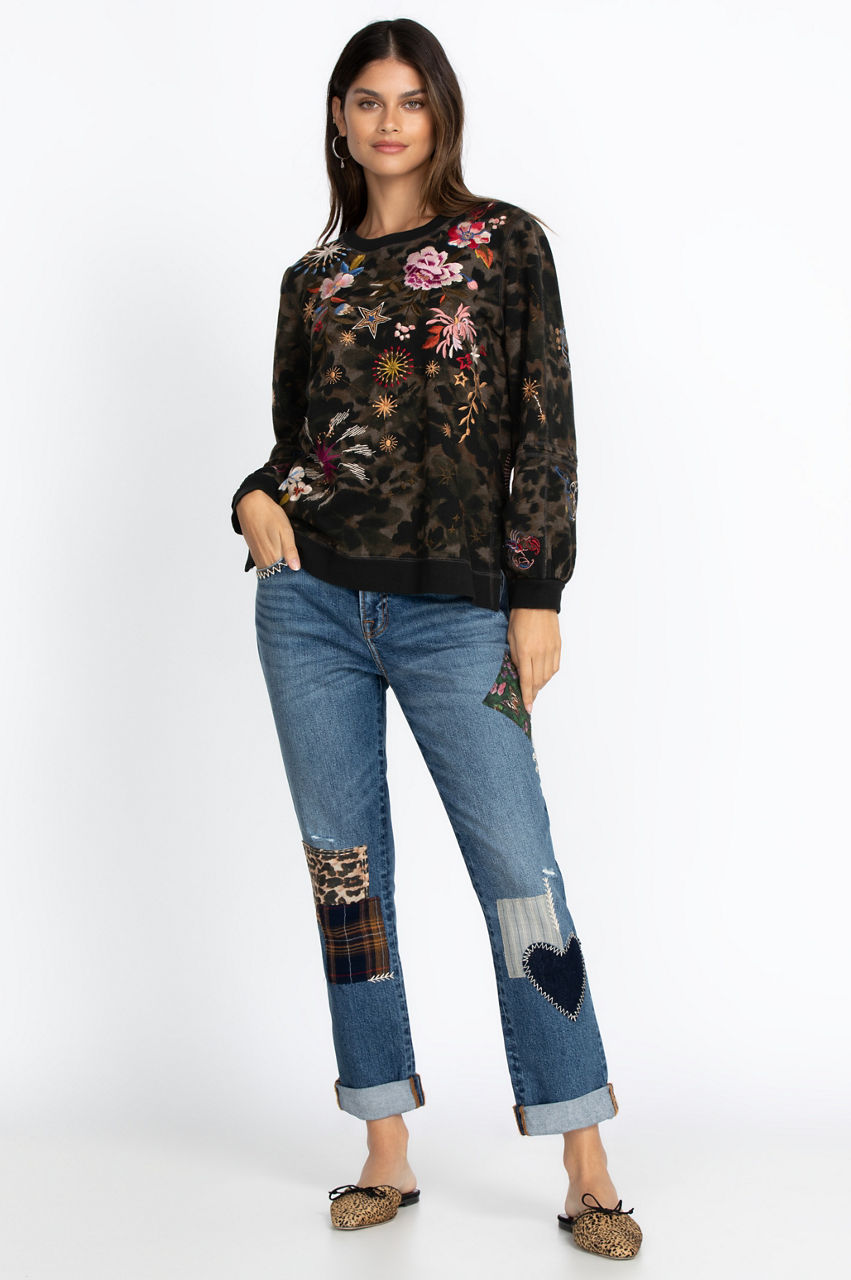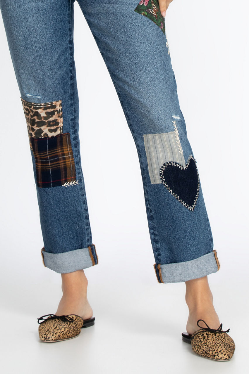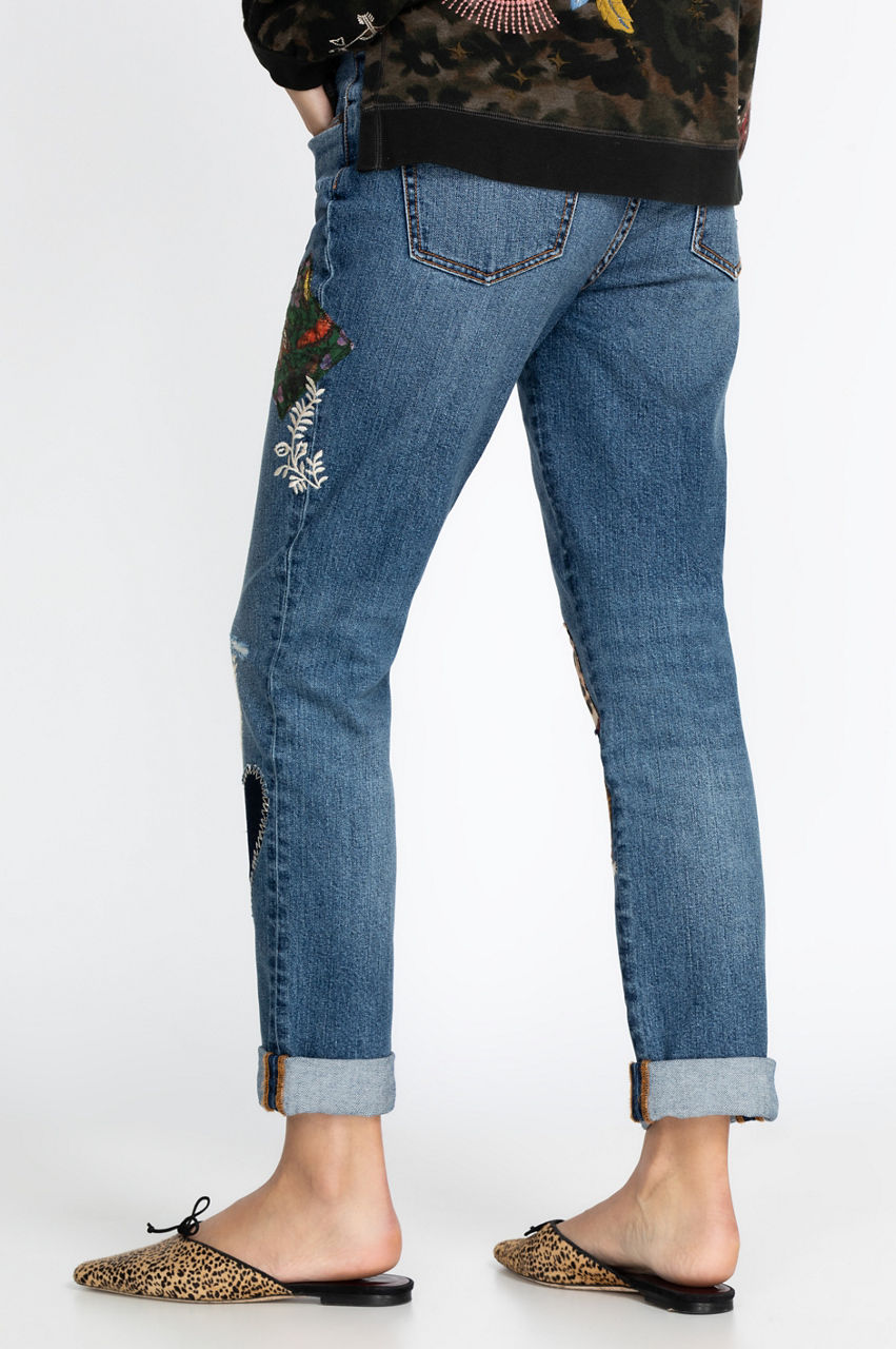 Distressed yet stylish and fun, our Orla Patched Boyfriend Jean will quickly become your favorite denim. Multi-colored patches and embroidery lend a whimsical and casual tone to these ultra-comfortable jeans. Easily wear our Orla Patched Boyfriend Jean with your favorite sweatshirt and fluffy socks for cozy days by the fire, or pair them with a sleek top and flats for a day around town.
