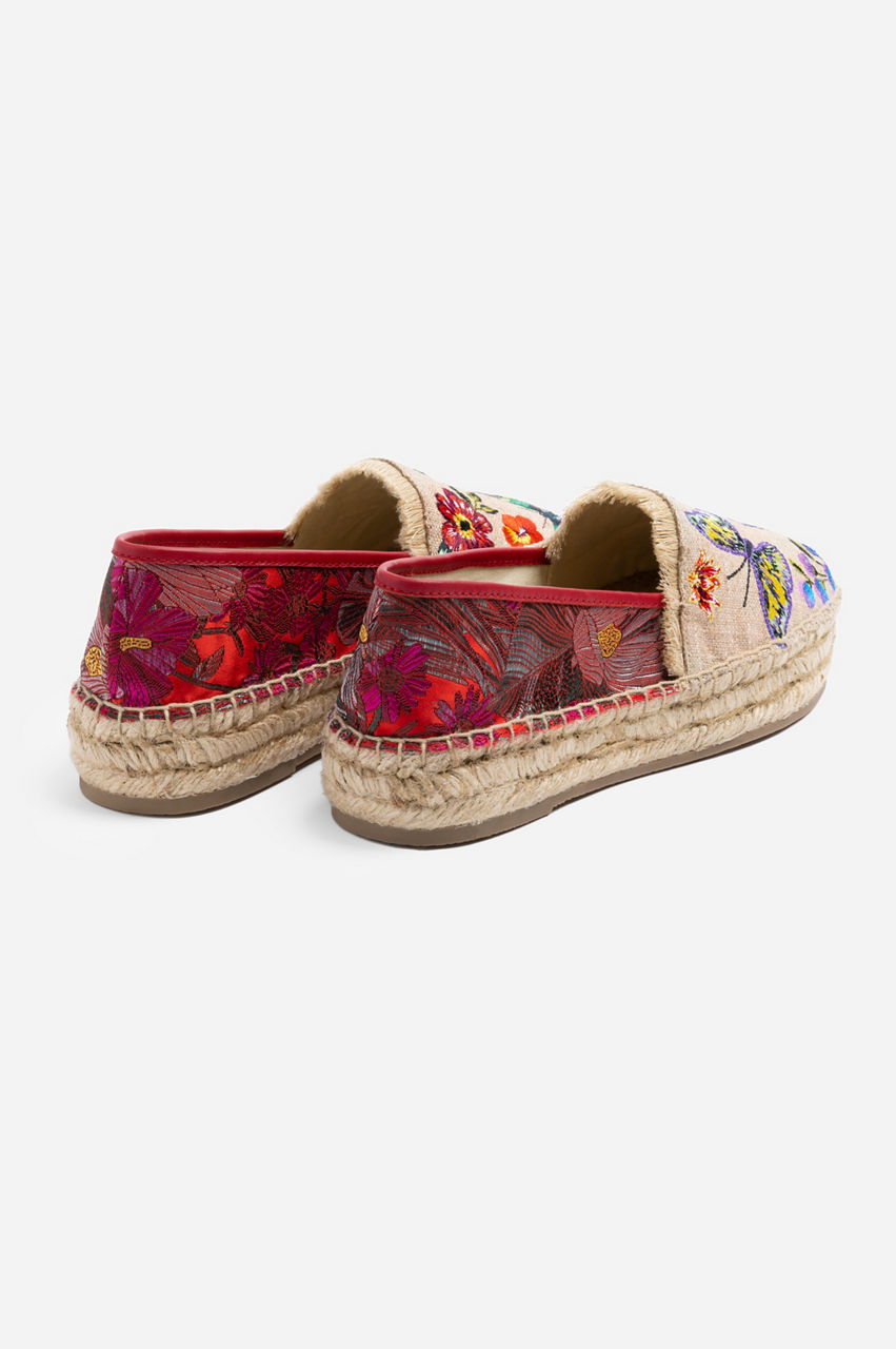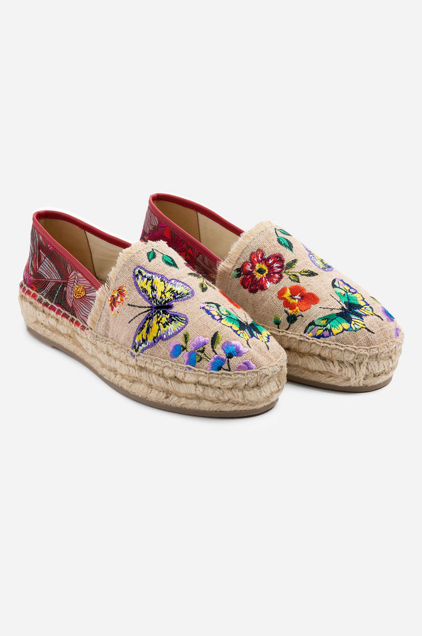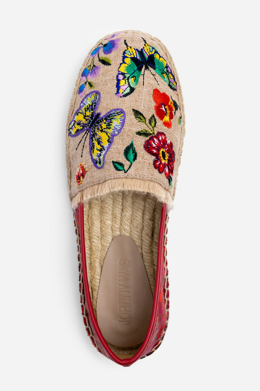 Perfect for sun-soaked days, the Osaka Espadrilles are a cheerful take on a timeless warm-weather favorite. Crafted from durable and comfortable linen, these espadrilles adopt a flat silhouette and feature a round toe with a colorful butterfly pattern, a jute woven sole, and rich blooms across the heel. Pair with a midi dress for a feminine vacation look.