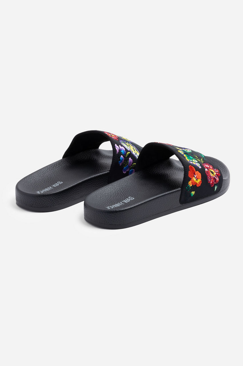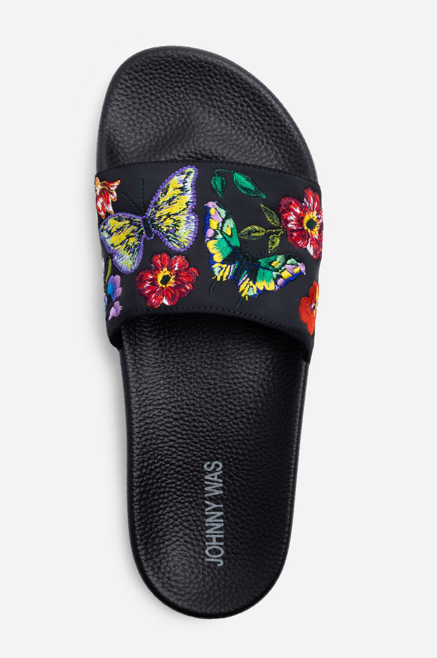 Rich in color, the Osaka Pool Slides are equal parts energetic and feminine. A practical yet stylish option for tropical escapes and poolside lounging, these slides are made from a comfortable material with an open round toe, a gradient-colored insole, and a strap across the front with hypnotic floral and butterfly motifs. Pair with a tee and shorts or opt for a long maxi dress.