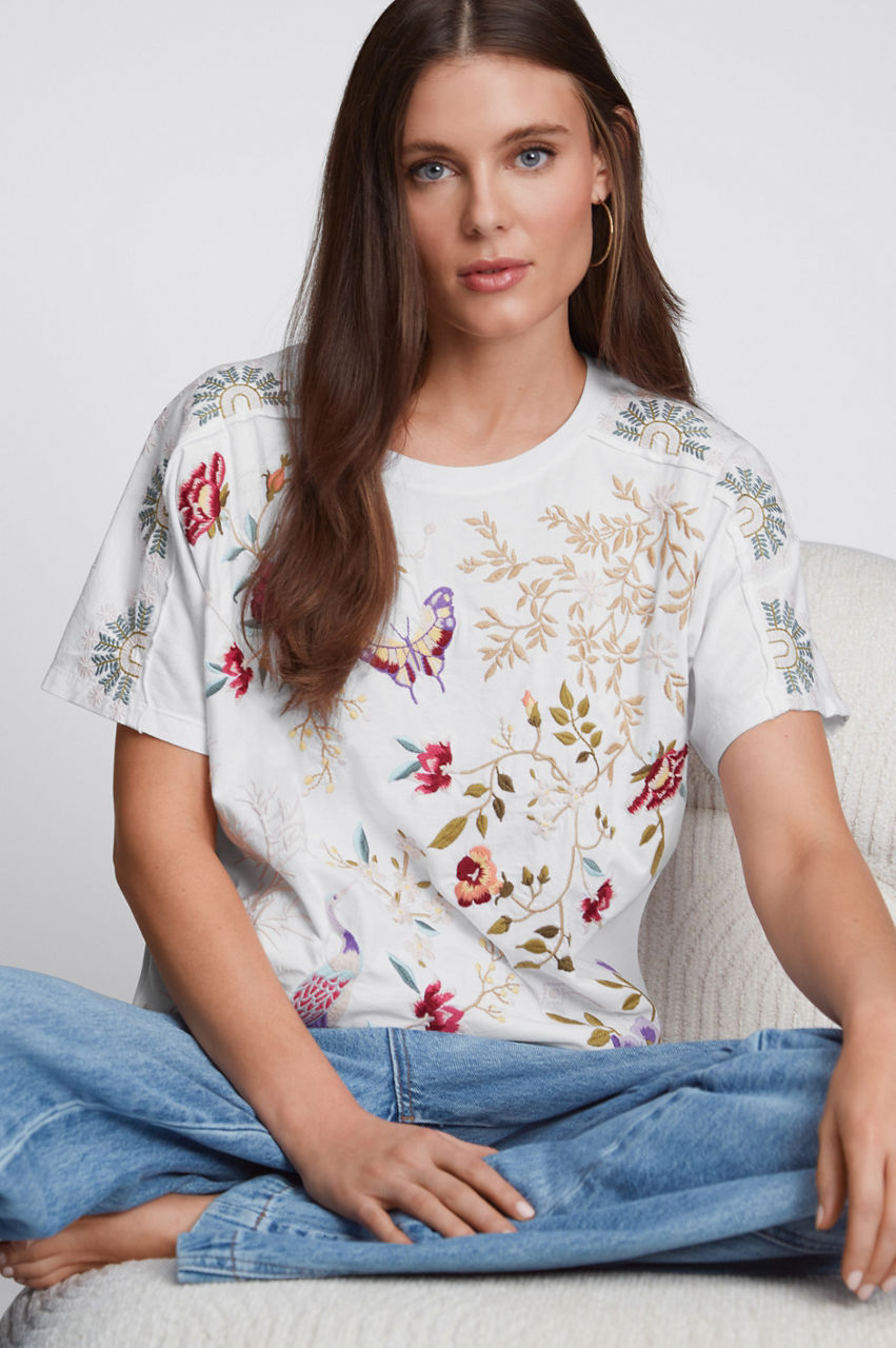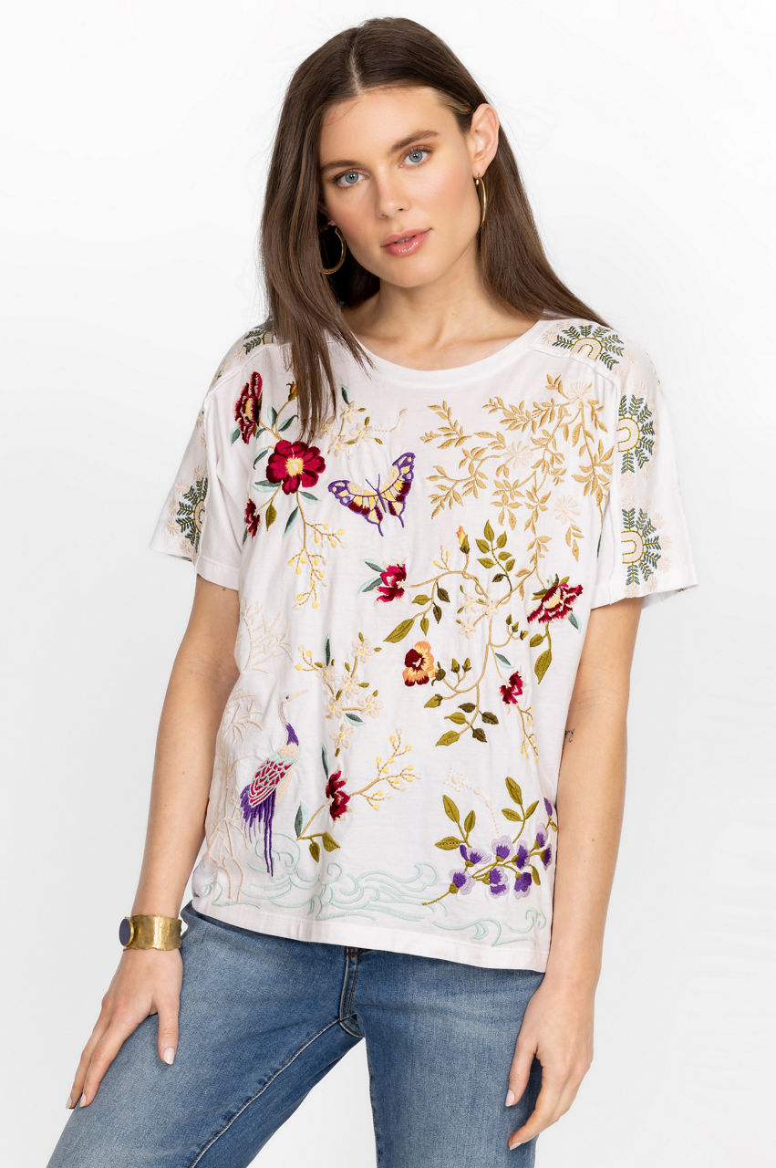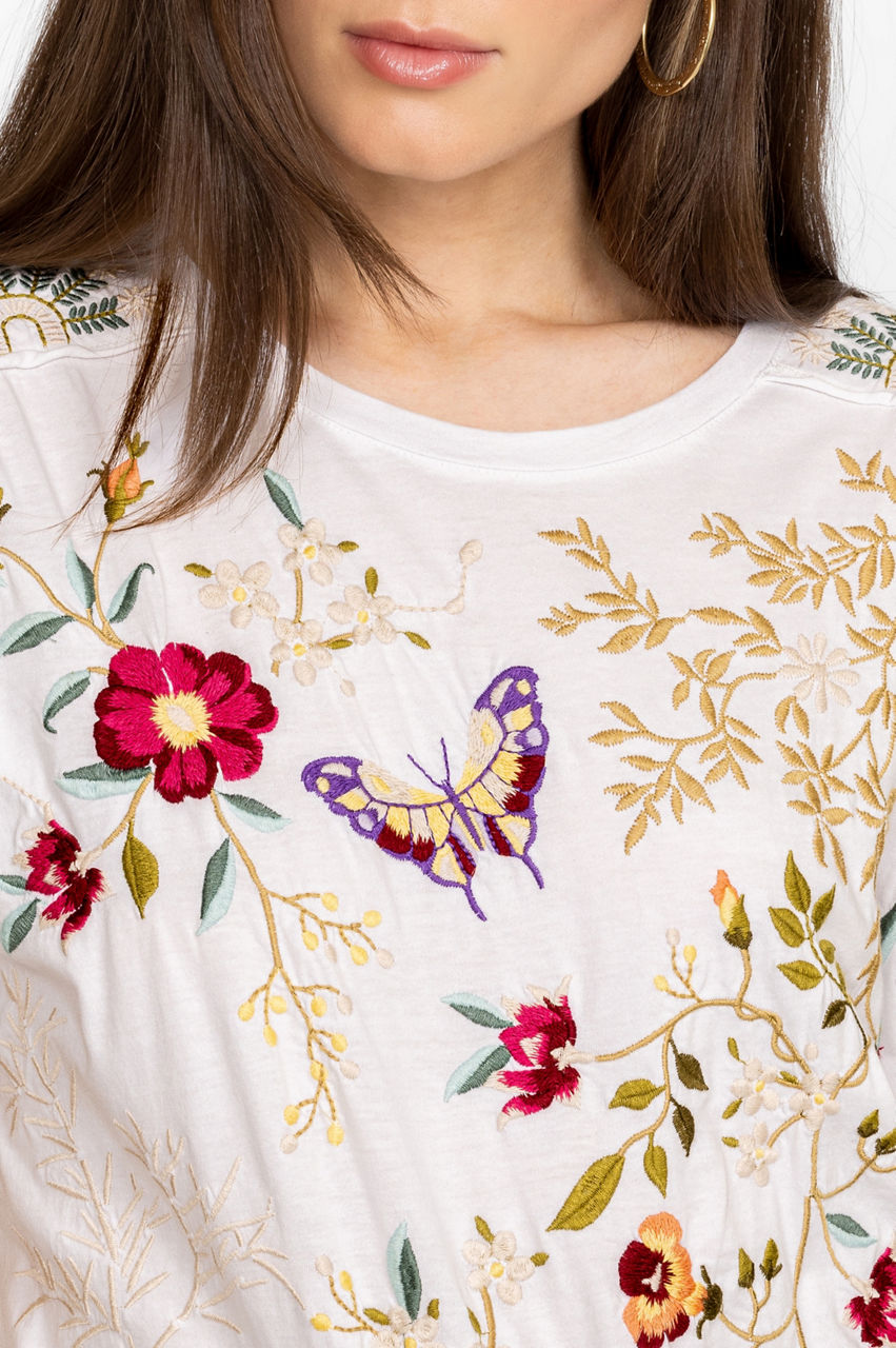Crafted from breathable cotton, the Osaka Raw Seam Dolman Tee revamps a timeless daily staple with the effortless beauty of the butterfly. Influenced by the animal kingdom, this tee boasts a round neck, short sleeves, and a bright placement embroidery comprising animal and floral motifs. For the daytime, pair with jeans and for vacations, switch to shorts or skirts.