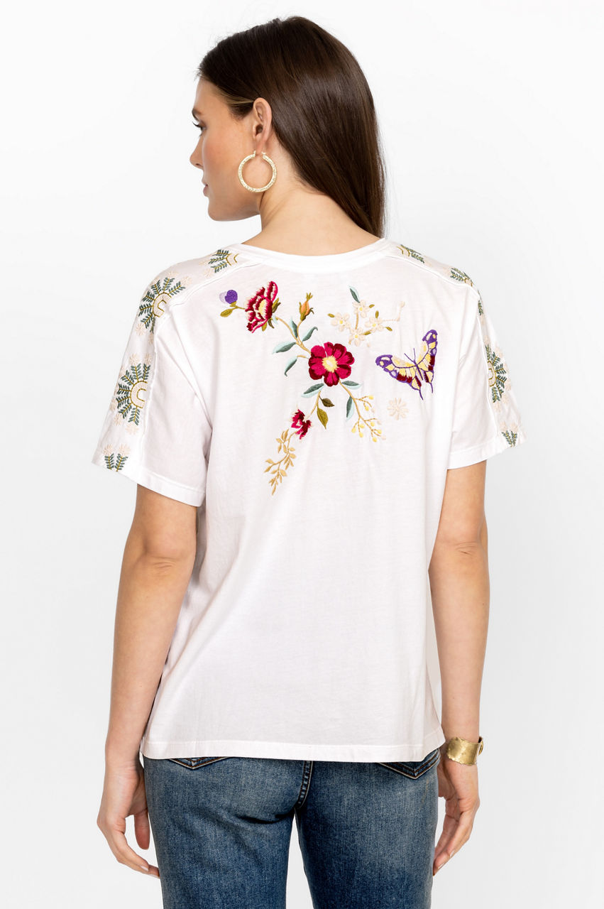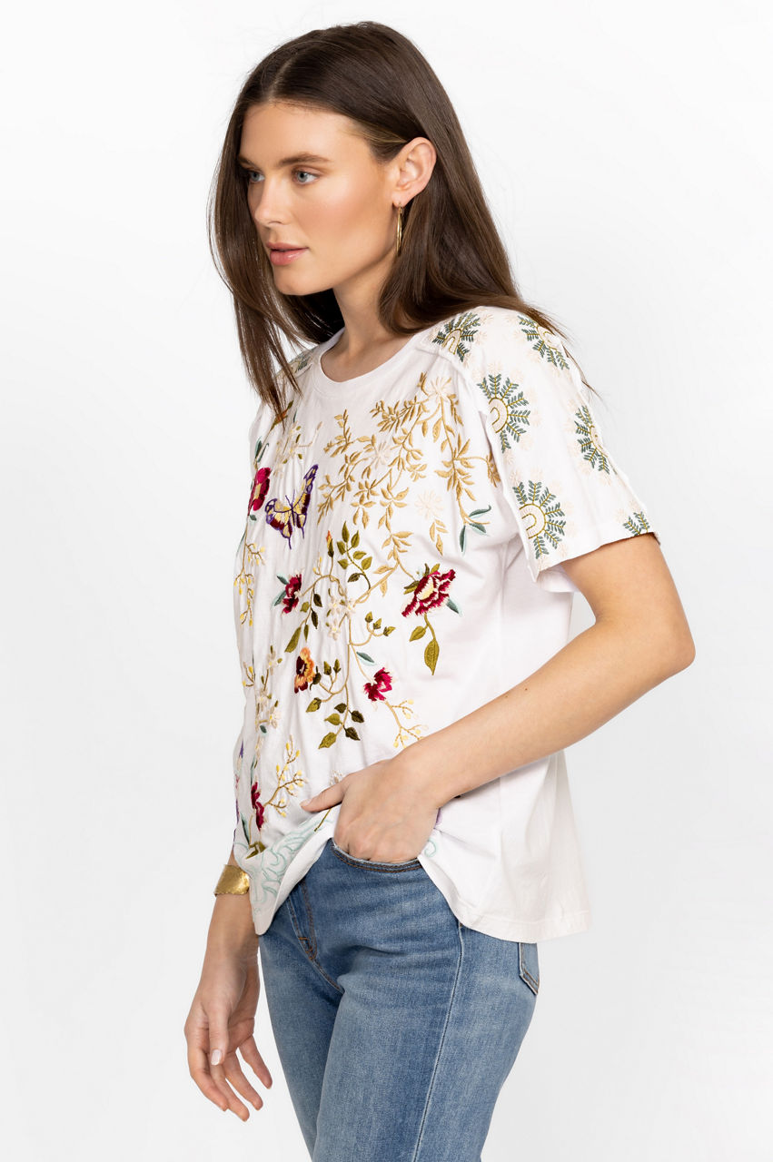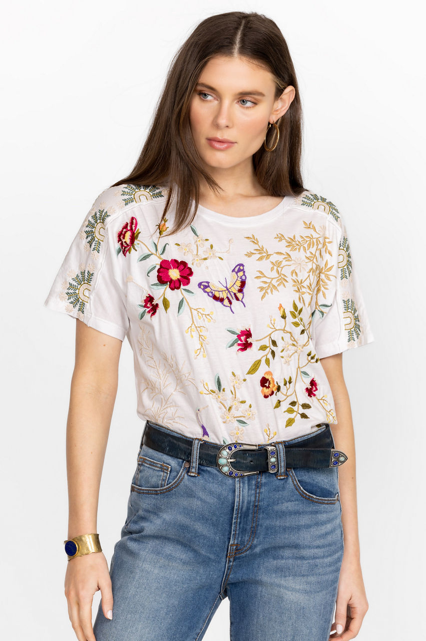Crafted from breathable cotton, the Osaka Raw Seam Dolman Tee revamps a timeless daily staple with the effortless beauty of the butterfly. Influenced by the animal kingdom, this tee boasts a round neck, short sleeves, and a bright placement embroidery comprising animal and floral motifs. For the daytime, pair with jeans and for vacations, switch to shorts or skirts.