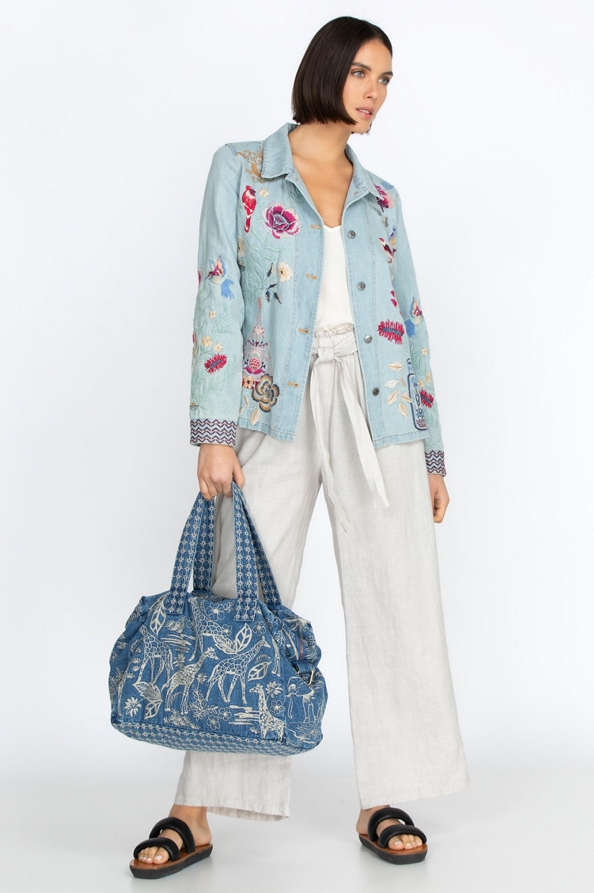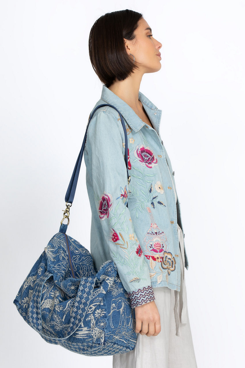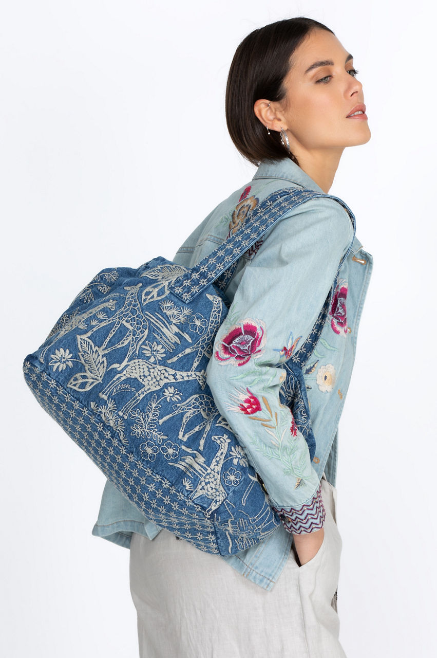 Turning to the animal kingdom for inspiration, the Osiris Denim Duffle Tote Bag exudes a free-spirited aesthetic. This roomy accessory is made from durable denim with a zipper closure and is adorned with an intricate giraffe embroidery in a contrast shade. Finished with top handles, the duffle tote bag is the perfect size for both travel and daily errands.