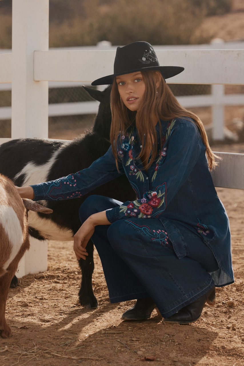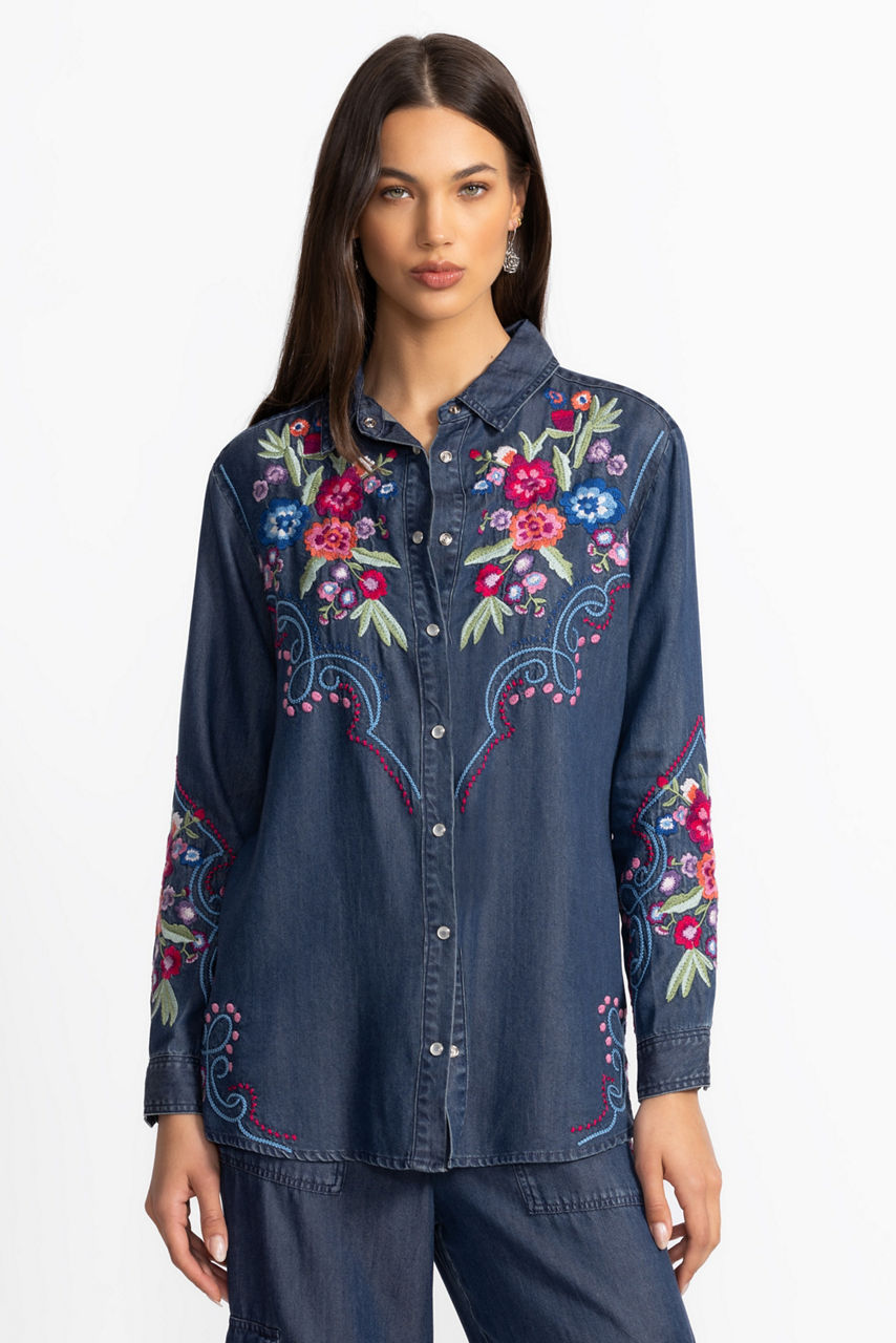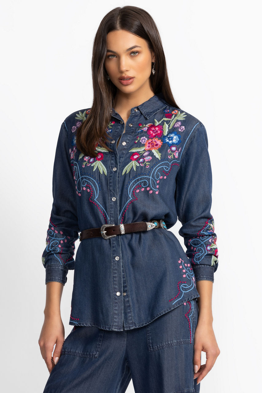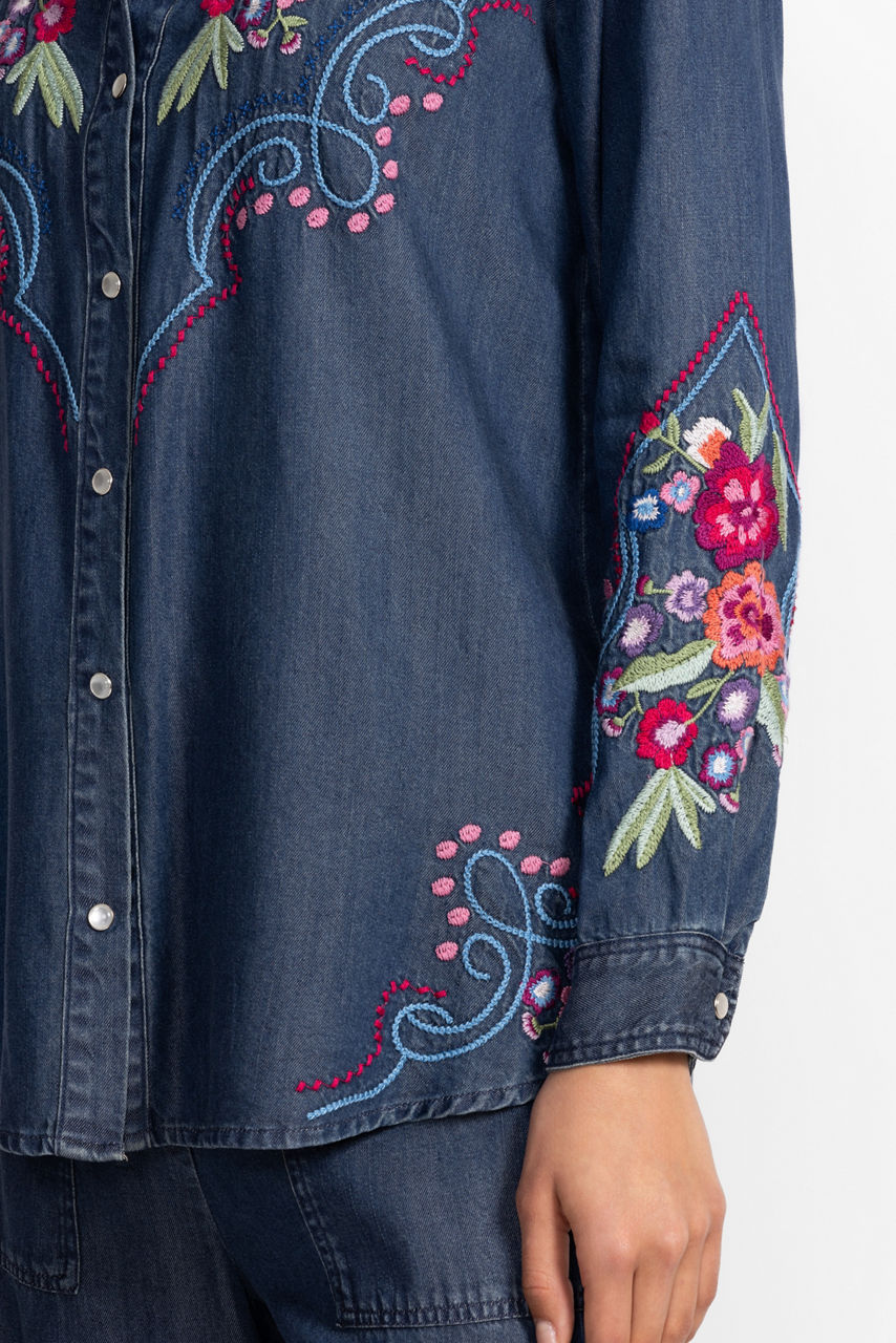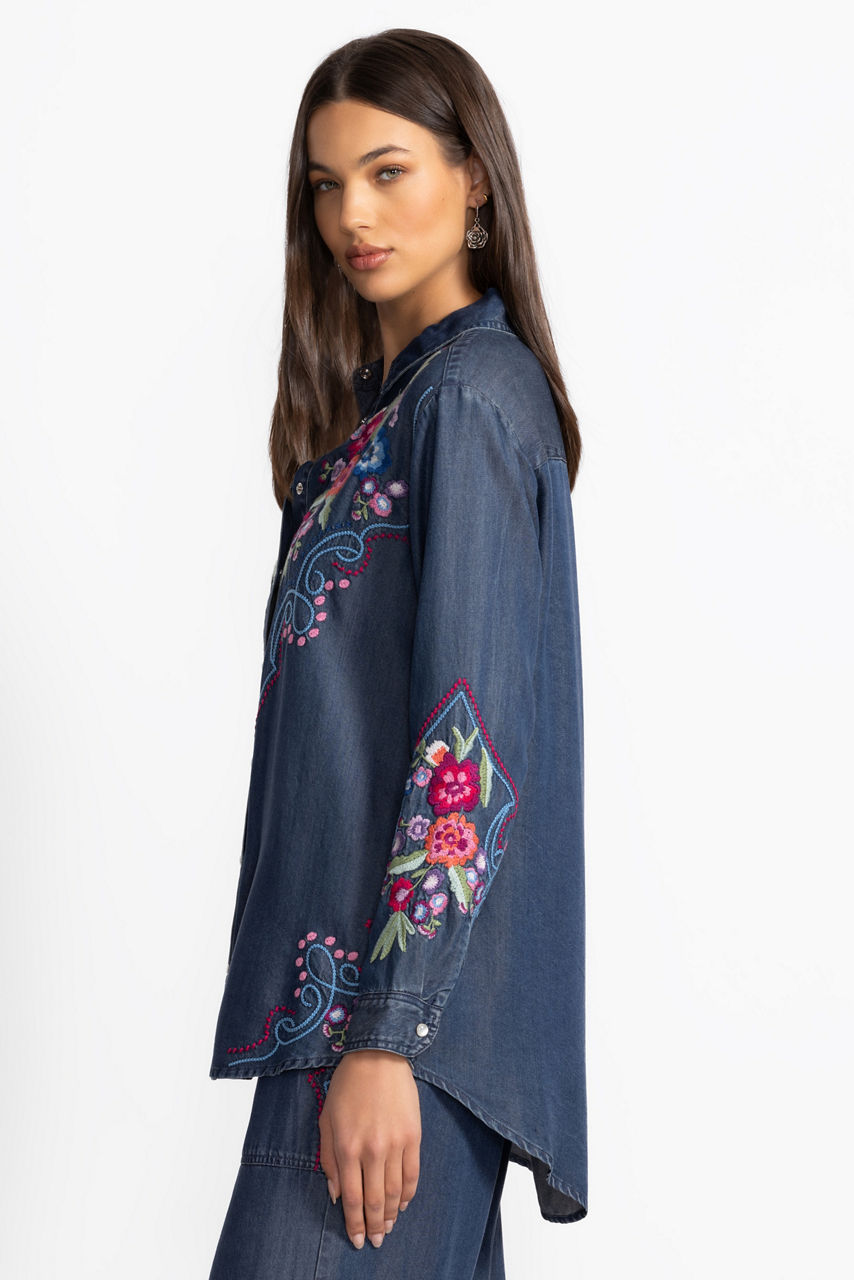 Creating a fusion of classic western wear and modern styling, the Oversized Shirt Tunic is boldly embellished with vibrant floral embroidered details. Crafted from a lightweight fabric with the look of denim, this classic button-down is finished with a curved hemline. Pair with trendy leggings and ankle boots for a fresh look perfect for lunch with friends.
