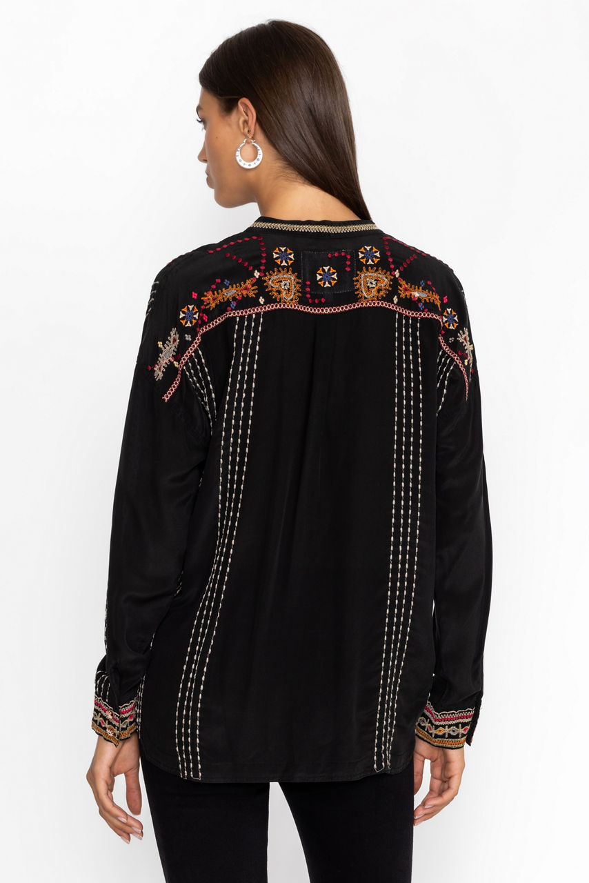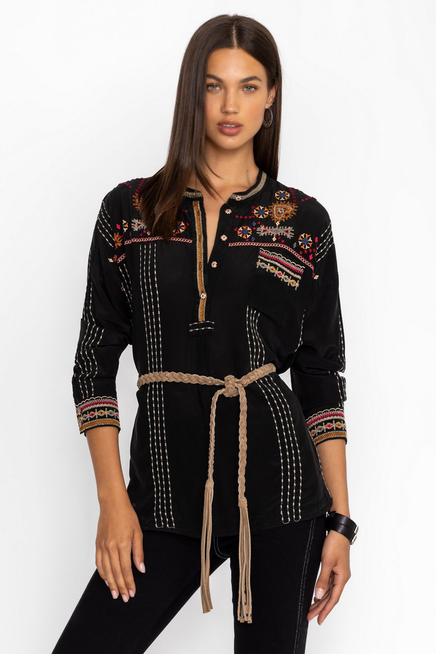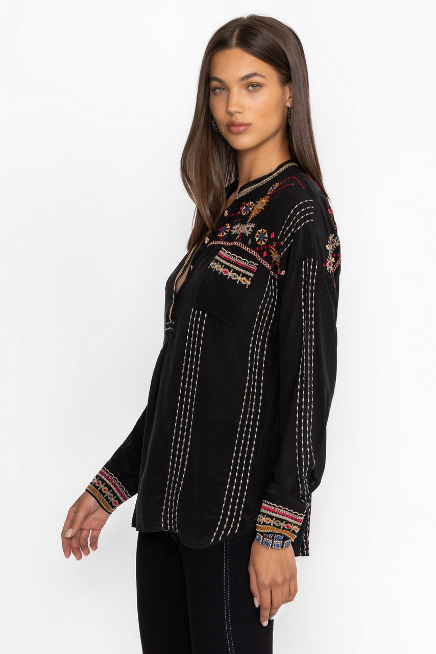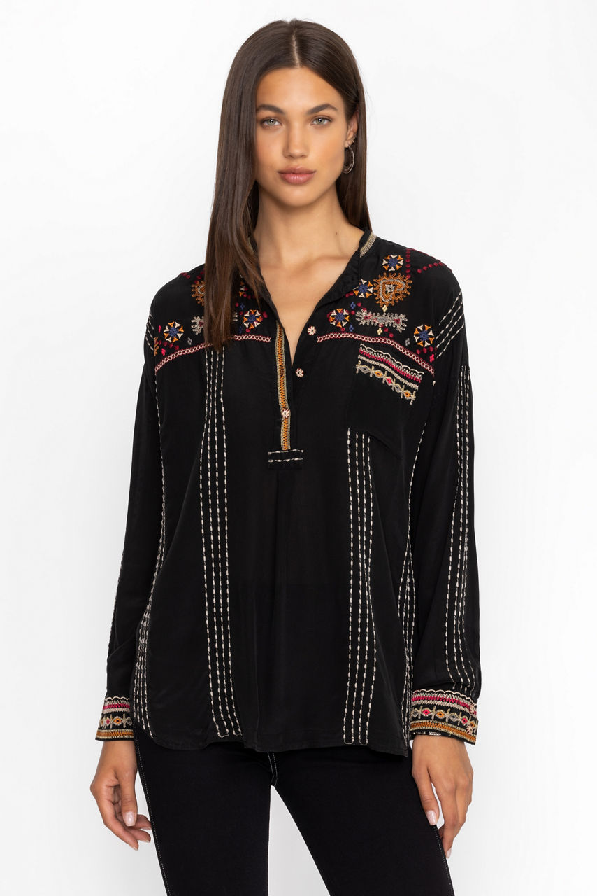 Crafted from 100% luxurious silk, the Ozee Blouse adds a splash of color for a fresh take on a traditional silhouette. Featuring a classic Henley neckline and a front breast pocket, this flowing blouse is embellished with colorful placement embroidery at the yoke and cuffs. Pair with linen pants and leather sandals for a resort-ready look.