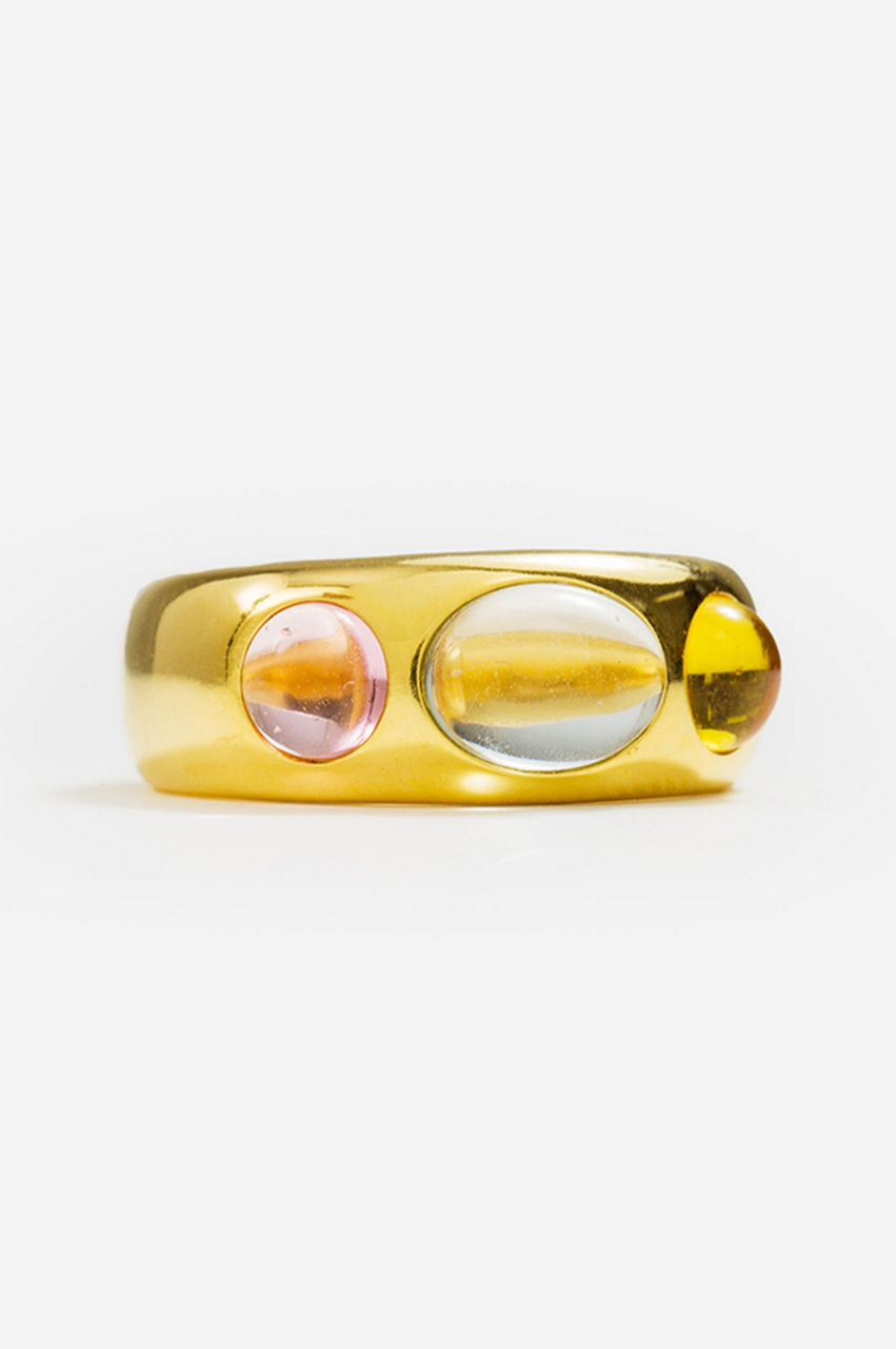 Elegantly balancing a contemporary aesthetic with classic details, this Pacific Pendant 3 Stone Ring is a versatile addition to year-round ensembles. Designed from hard-wearing gold-tone metal, this ring boasts a plain band and an oblong-shaped front with three colorful stones for a statement finish. Pair this ring with gold-tone hoops and casual tailoring for a chic day-to-night look.