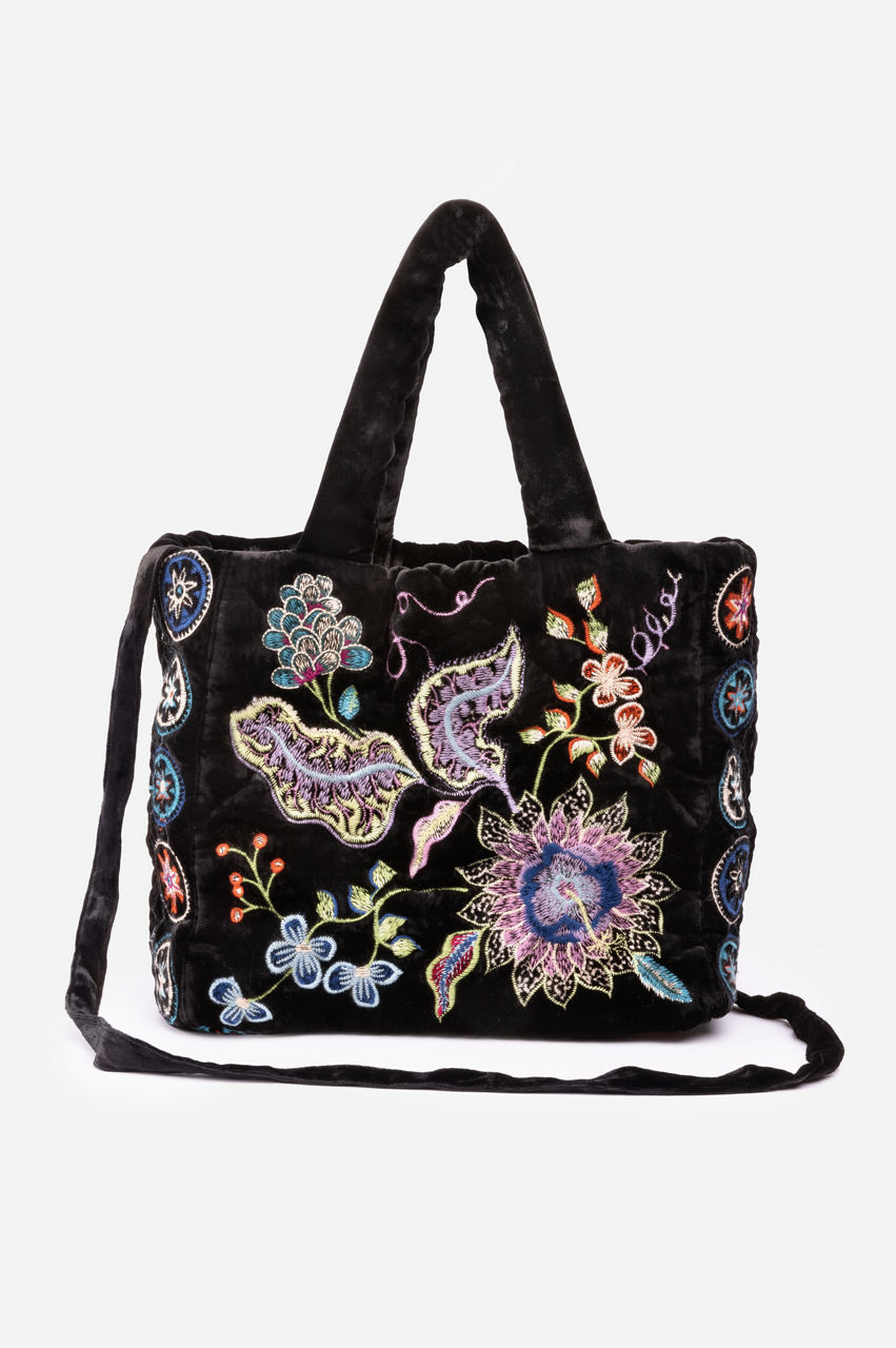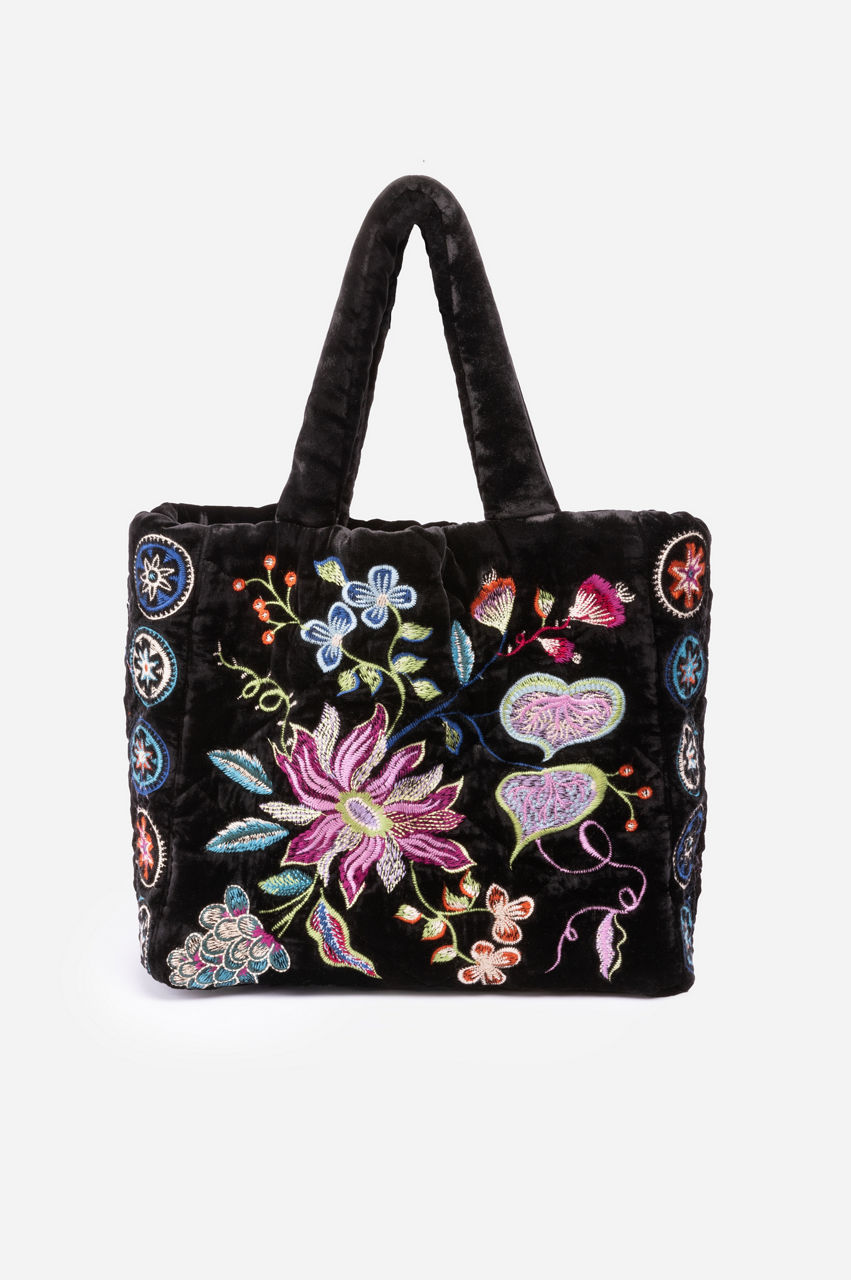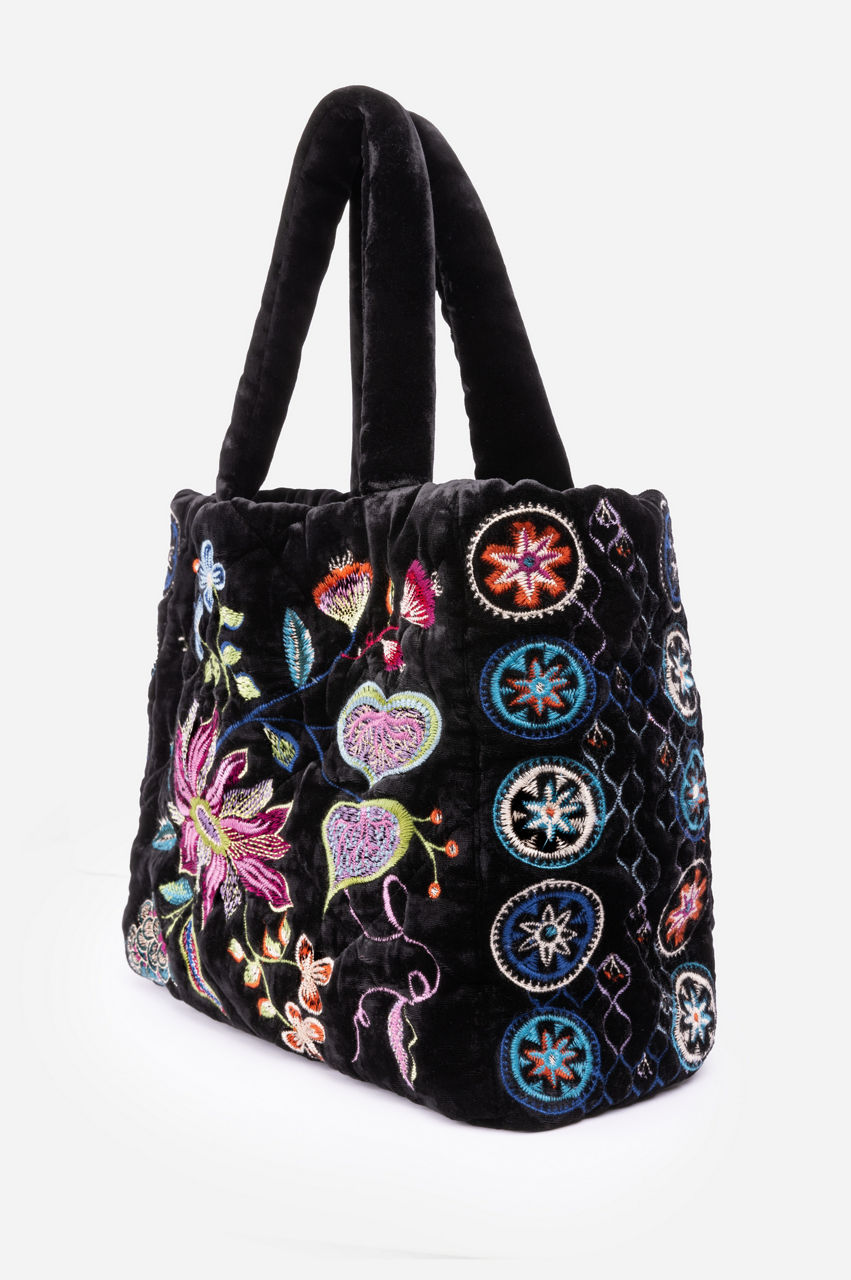 Artfully decorated with brilliant color, the Pacifica Velvet Quilted Tote is a necessary wardrobe statement piece. Crafted from a luxe silk blend fabric and expertly adorned with colorful placement embroidery, this unique bag speaks volumes on the topic of style. Pair with classic trousers and a silk blouse for a polished weekday look.
