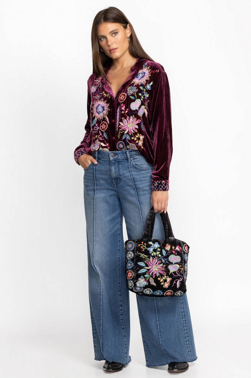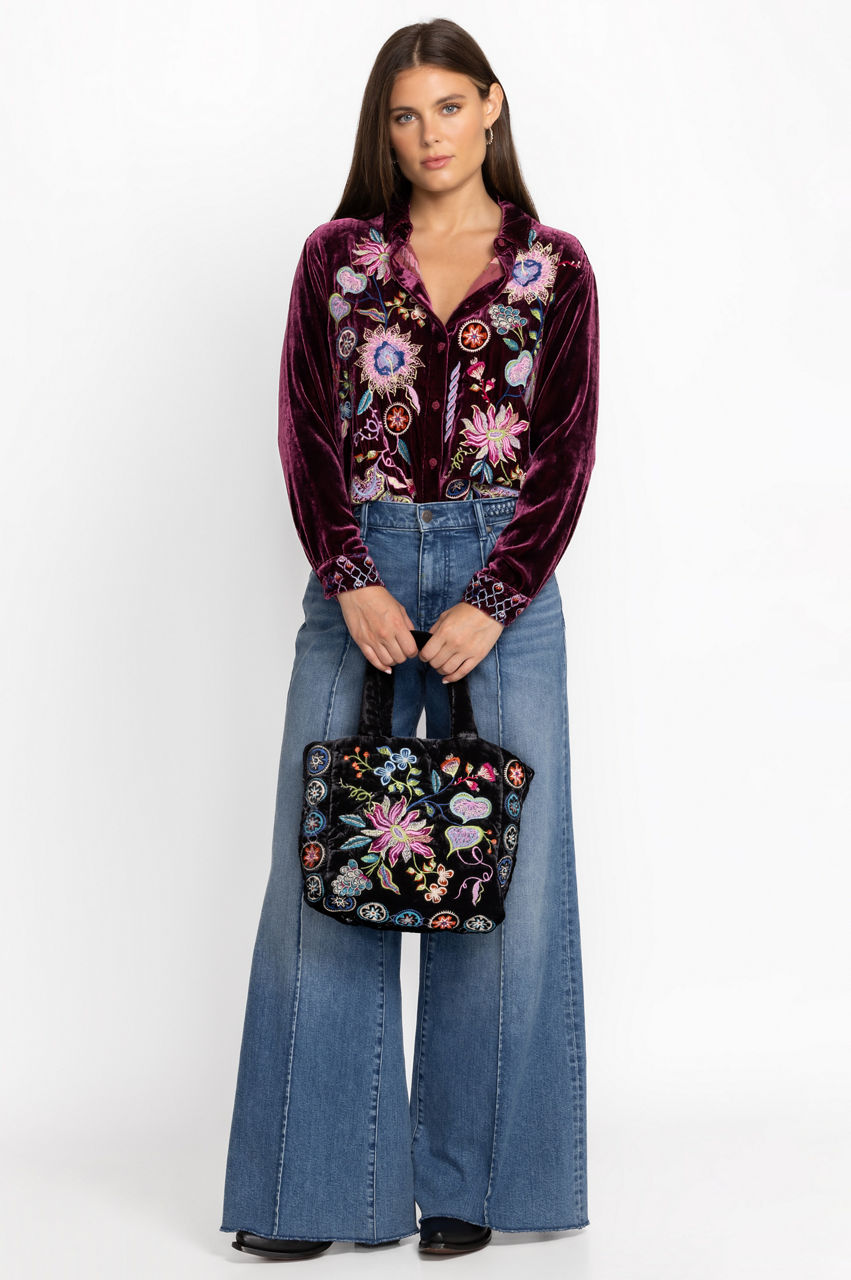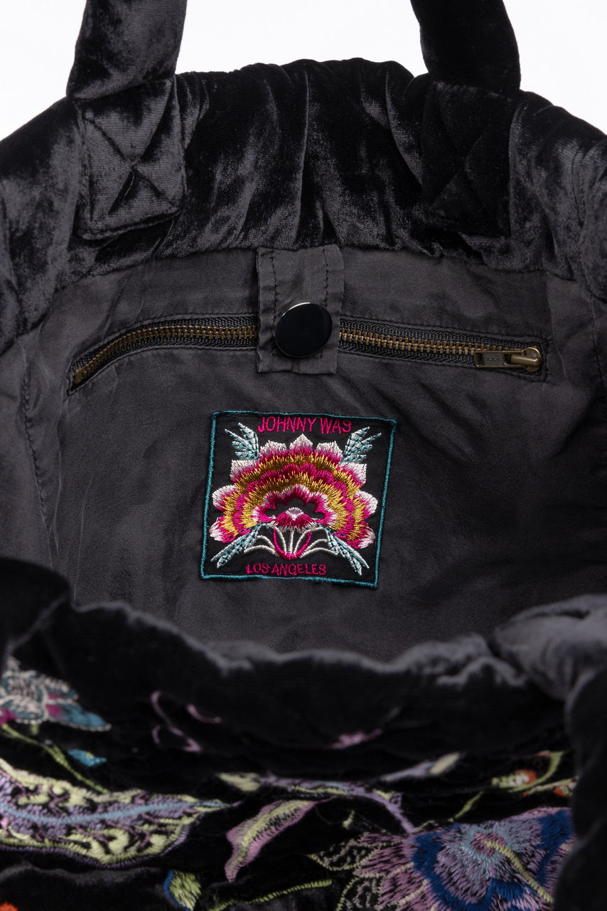 Artfully decorated with brilliant color, the Pacifica Velvet Quilted Tote is a necessary wardrobe statement piece. Crafted from a luxe silk blend fabric and expertly adorned with colorful placement embroidery, this unique bag speaks volumes on the topic of style. Pair with classic trousers and a silk blouse for a polished weekday look.