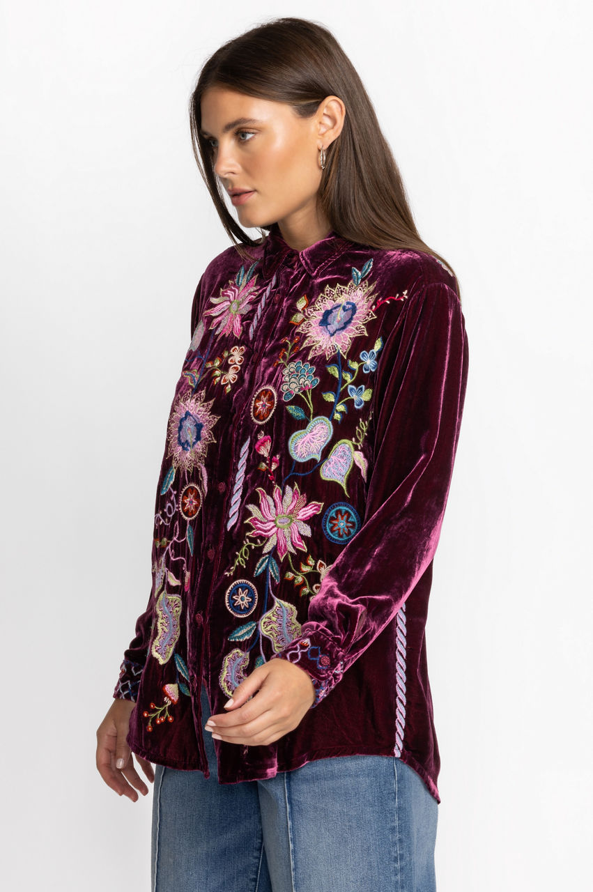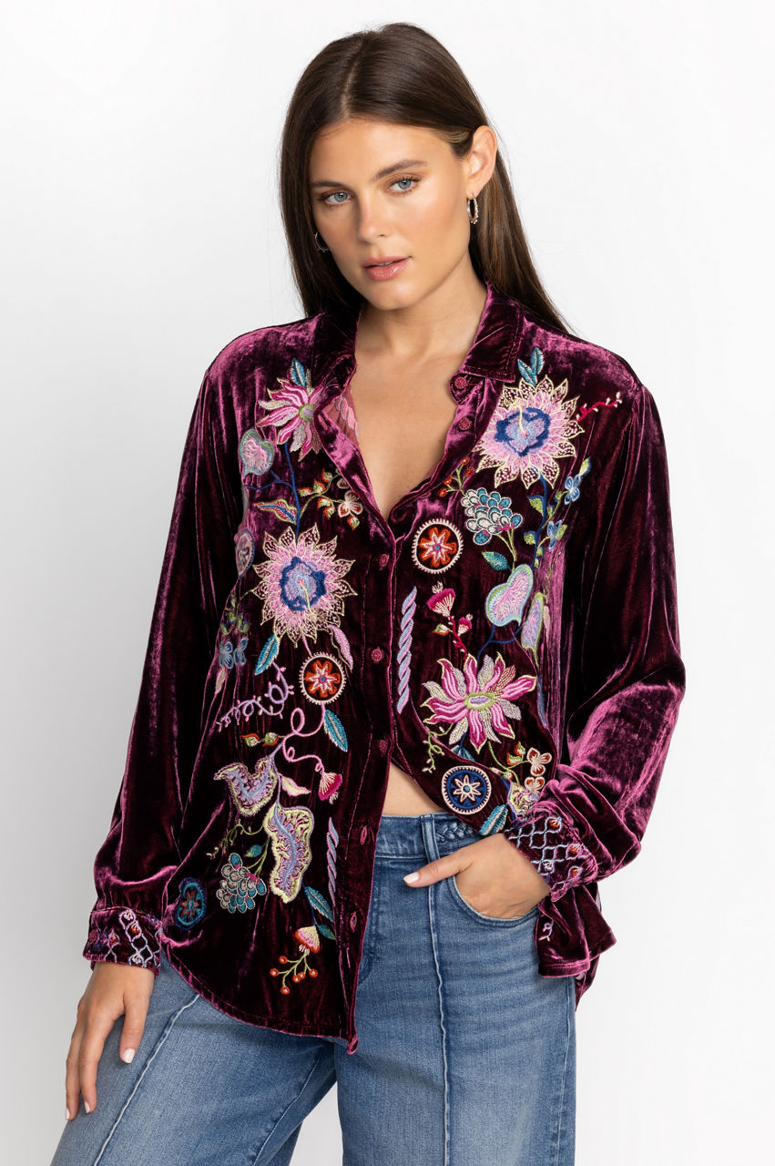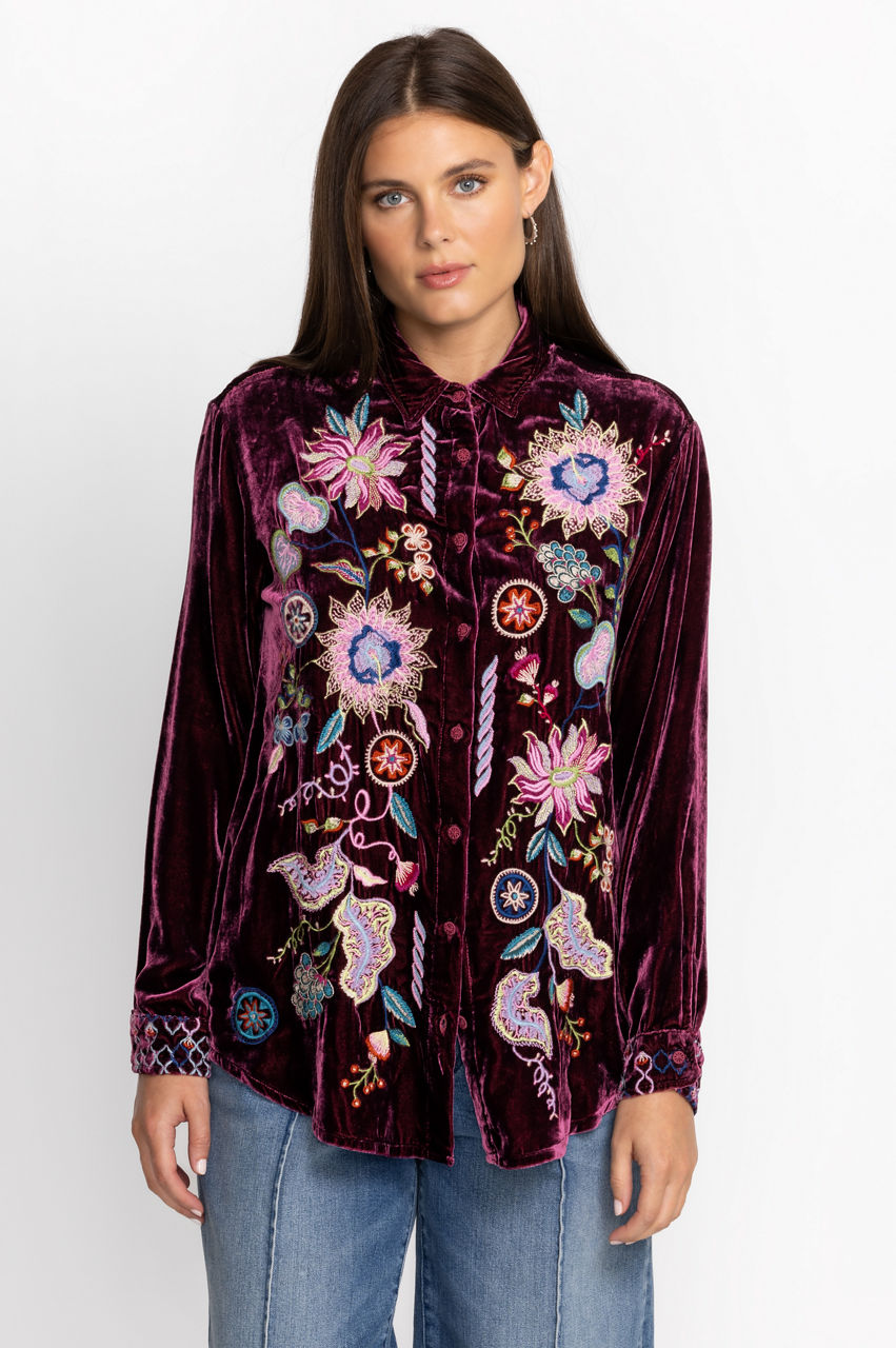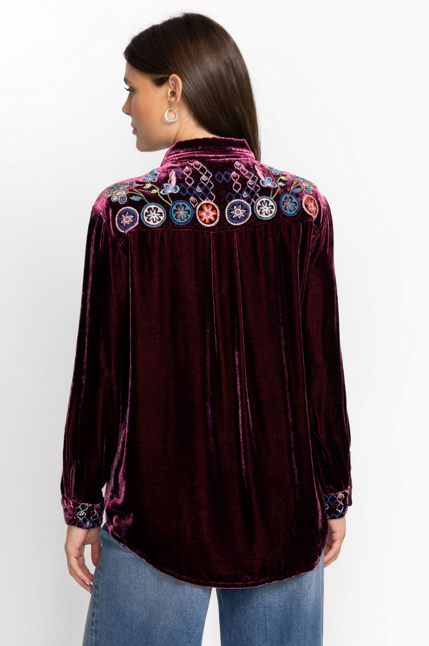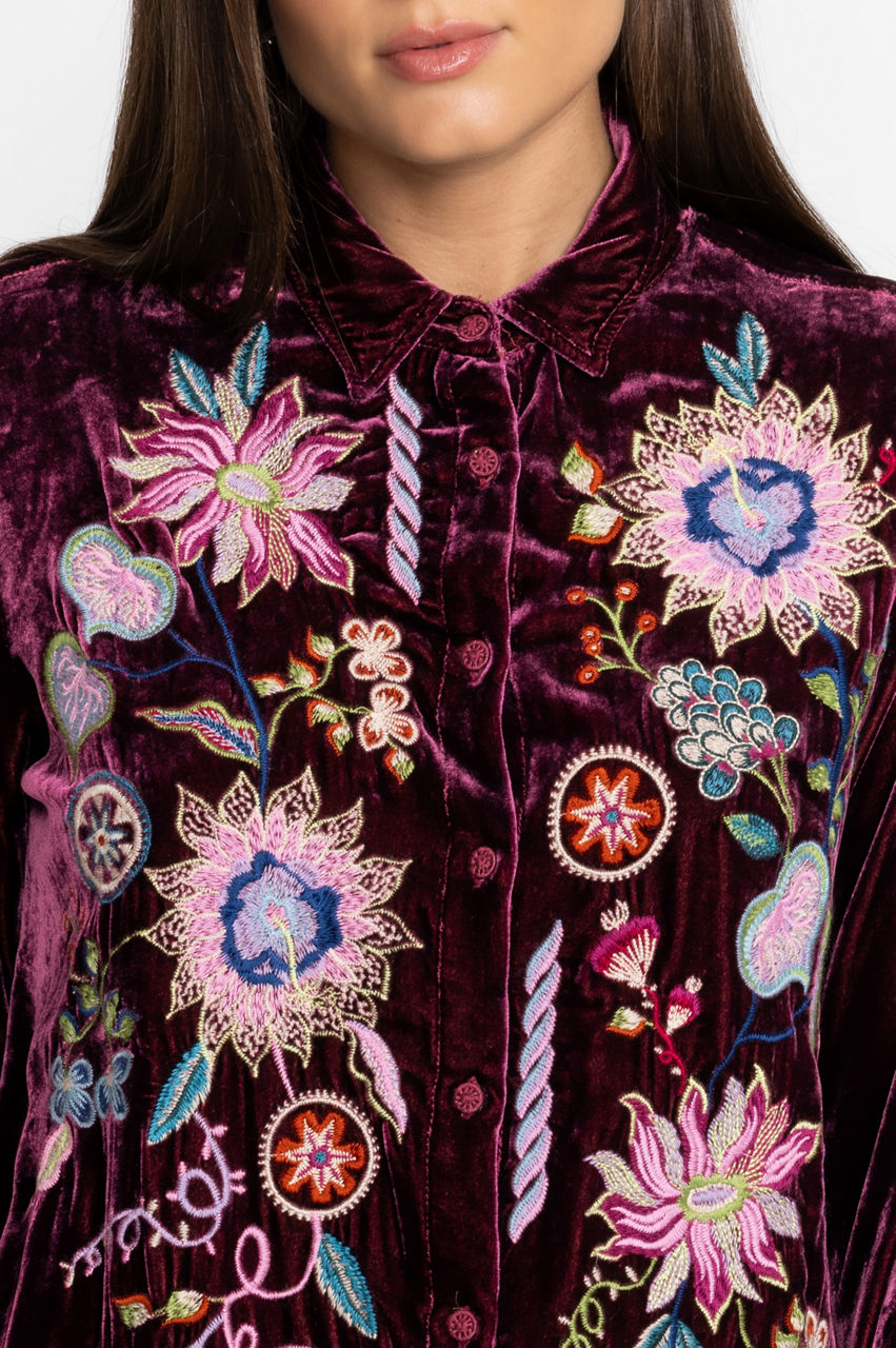 Making a statement without saying a word, the Pacifica Velvet Oversized Shirt boasts bold color and rich fabric. Crafted from a luxe silk blend and adorned with bold pops of color through elaborate placement embroidery, this stunning top offers a curved hem and generous silhouette. Pair with skinny jeans and ankle boots for a girls' night out.