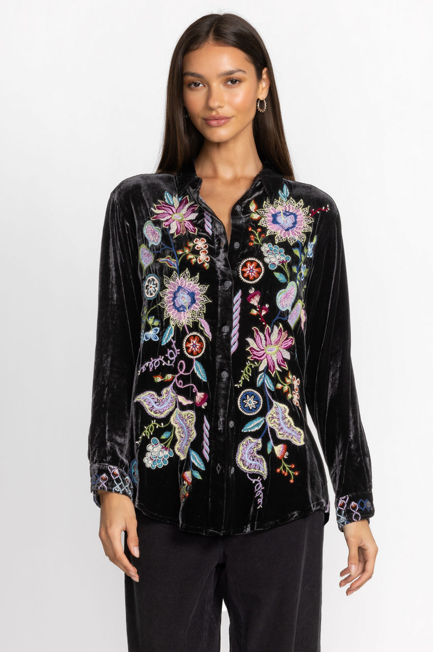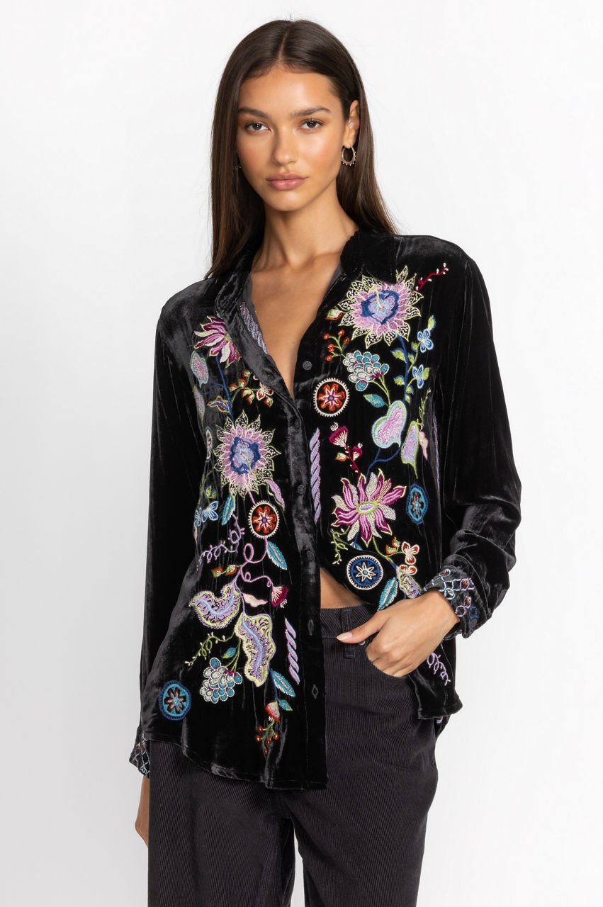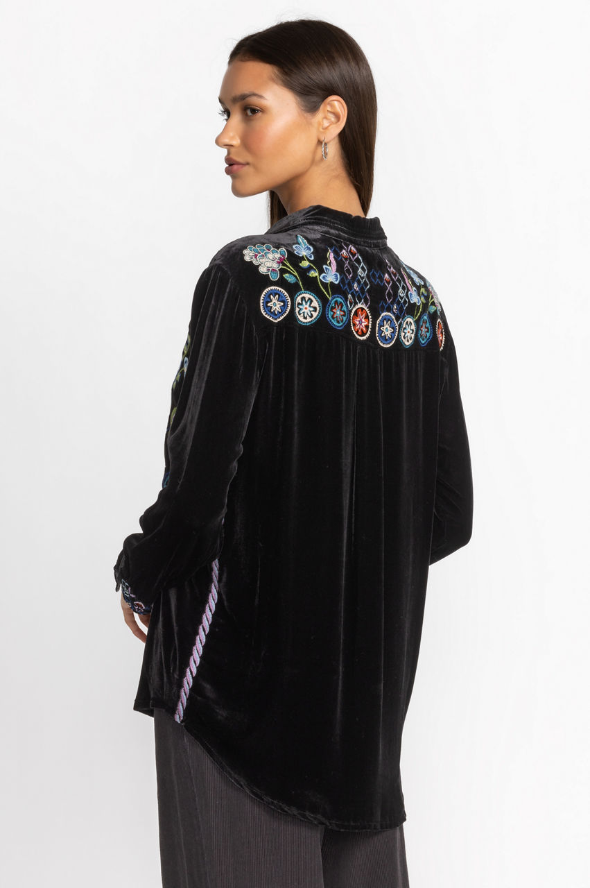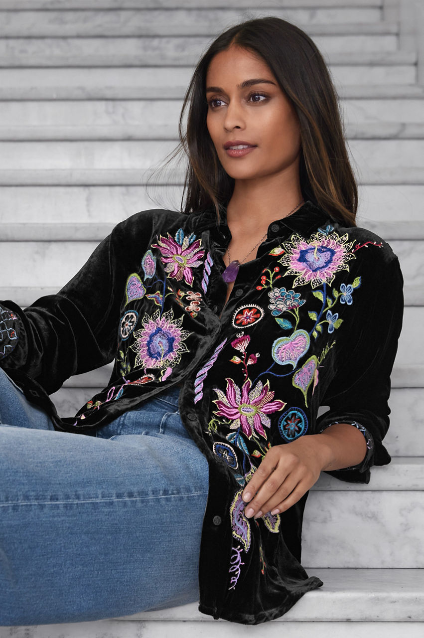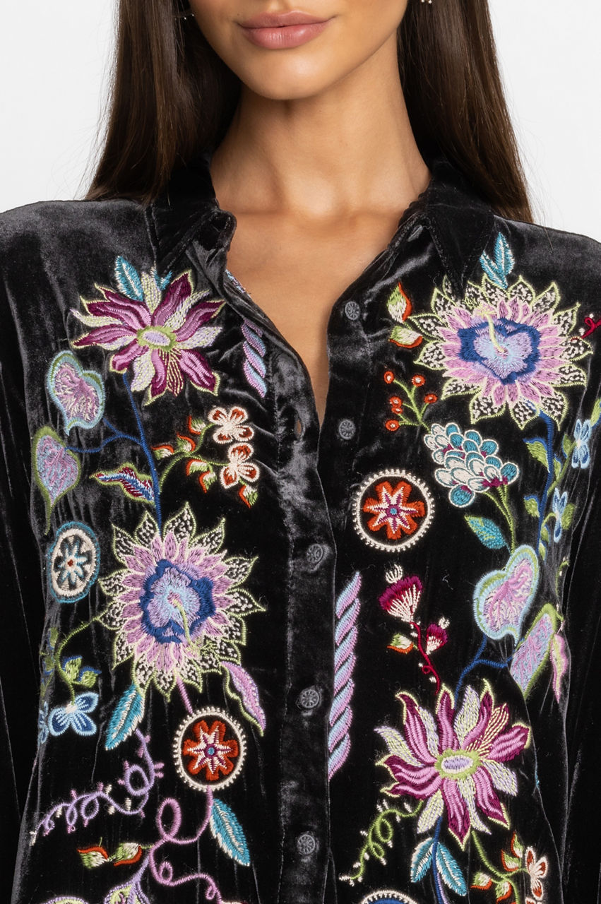 Making a statement without saying a word, the Pacifica Velvet Oversized Shirt boasts bold color and rich fabric. Crafted from a luxe silk blend and adorned with bold pops of color through elaborate placement embroidery, this stunning top offers a curved hem and generous silhouette. Pair with skinny jeans and ankle boots for a girls' night out.