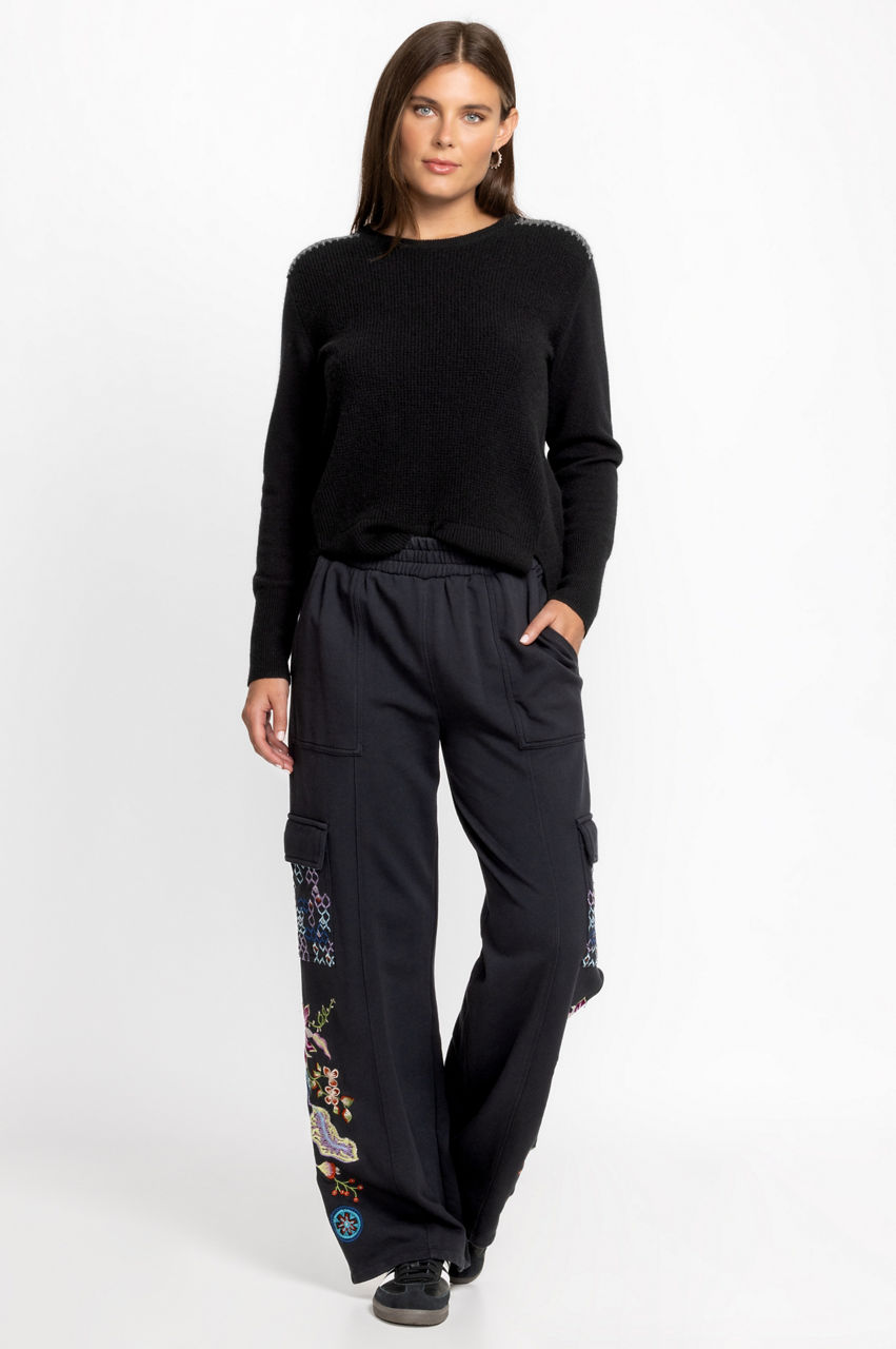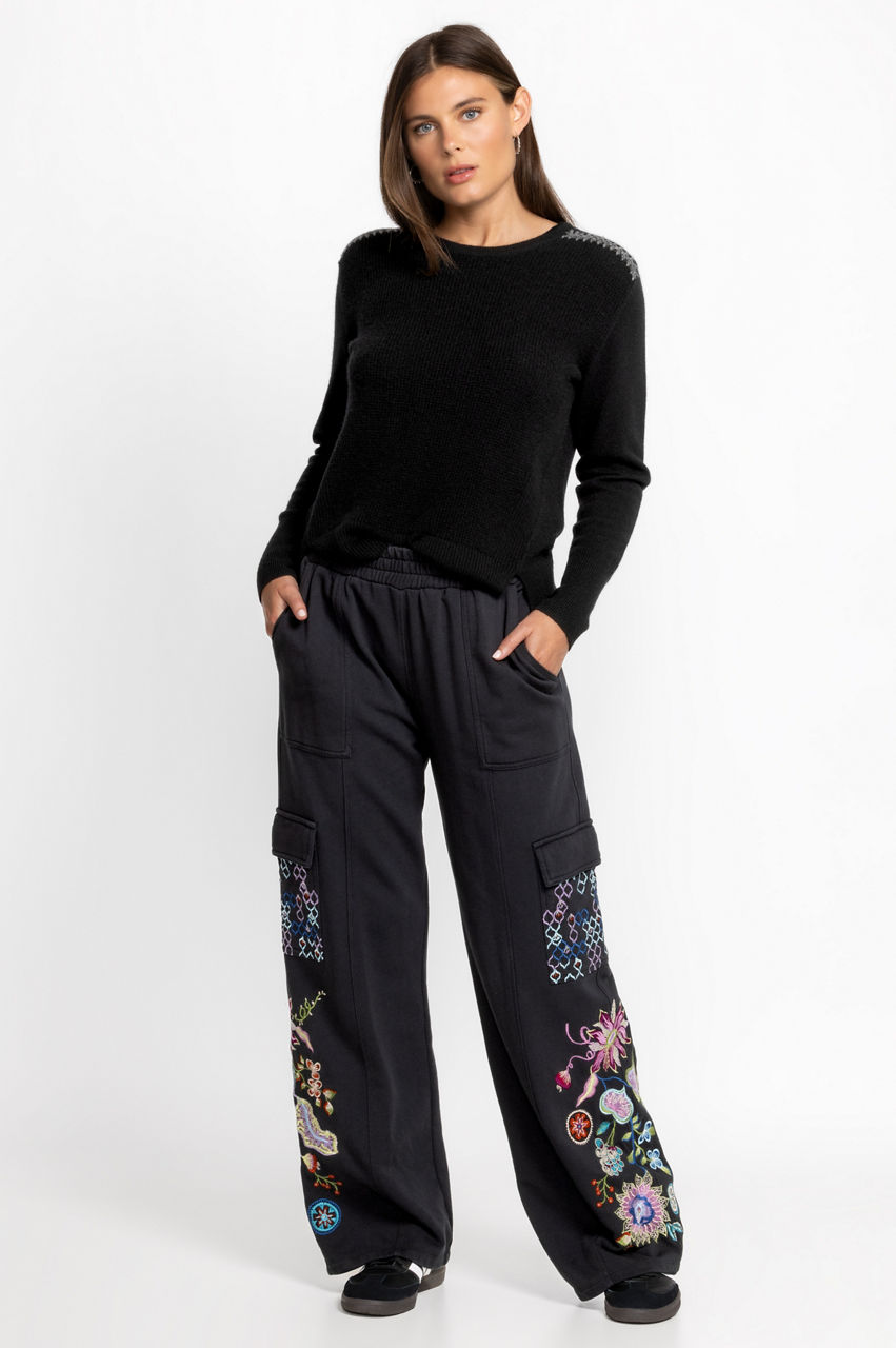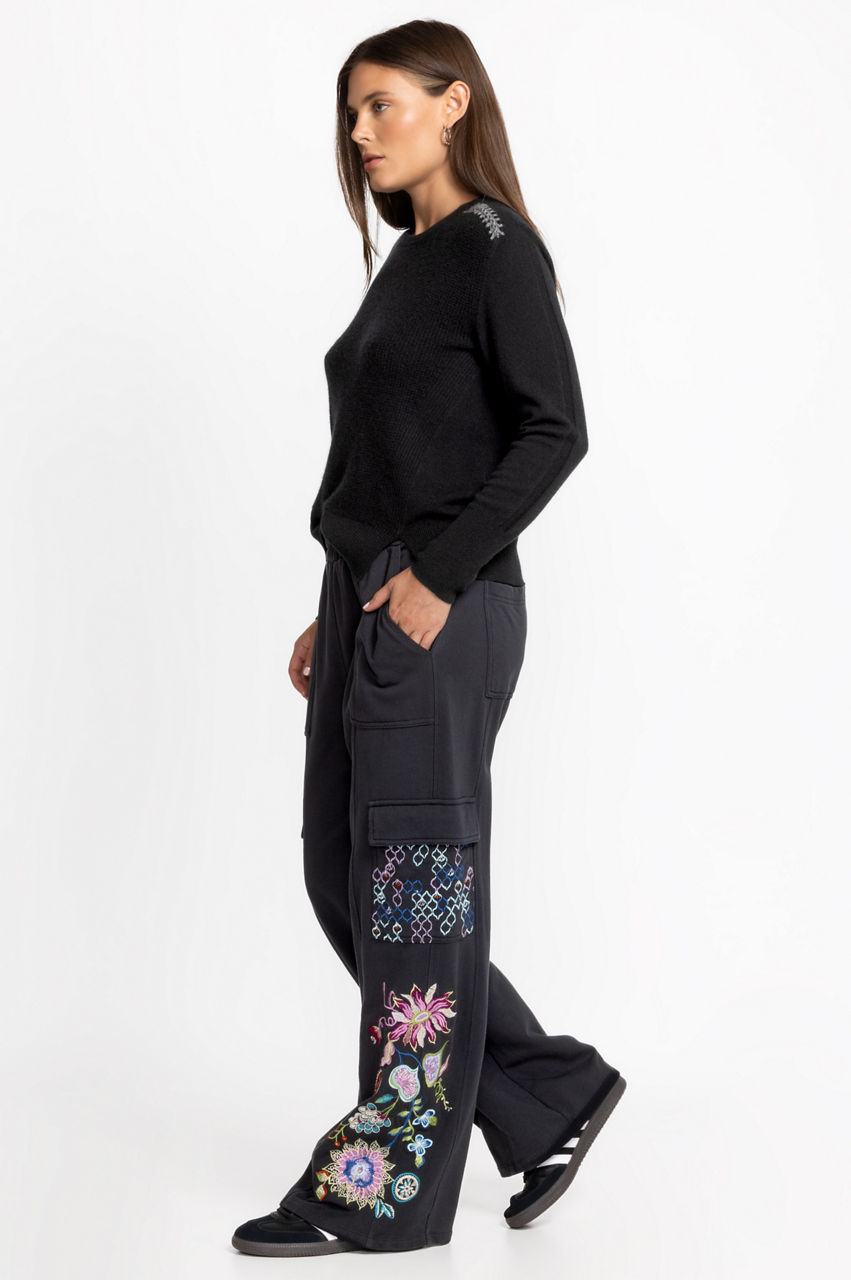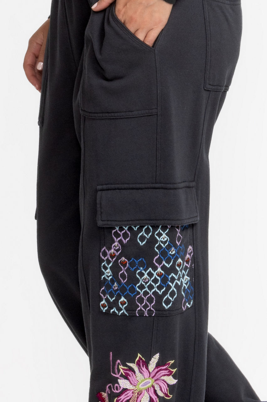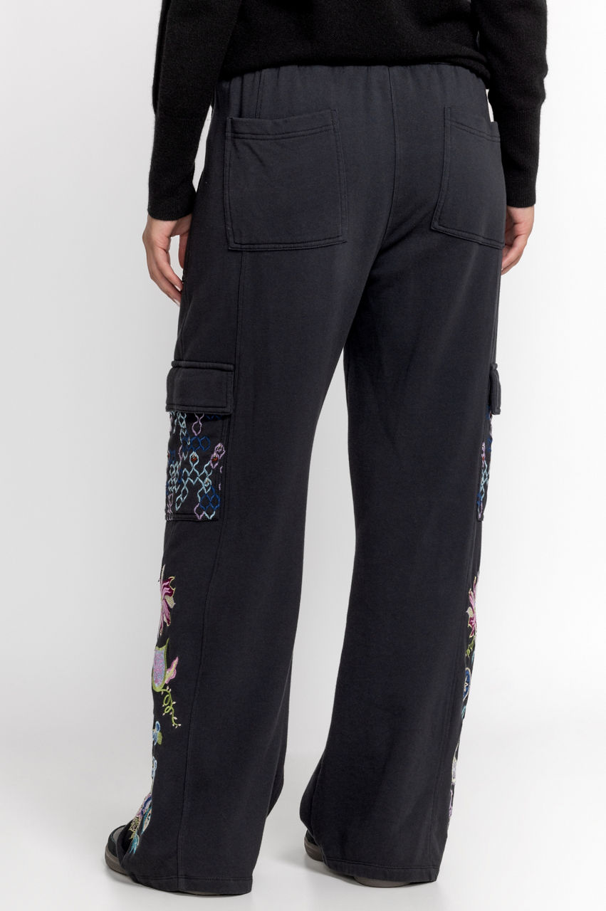 Crafted from pure cotton, the Pacifica Wide Leg French Terry Cargo Pants unexpectedly marry a utilitarian aesthetic with feminine touches. A stylish juxtaposition, these cargo pants feature a comfortable elastic waistband, wide legs, and a joyful floral placement embroidery in vibrant colors. Pair these cargo pants with a plain tee and sneakers for a contemporary daytime ensemble.