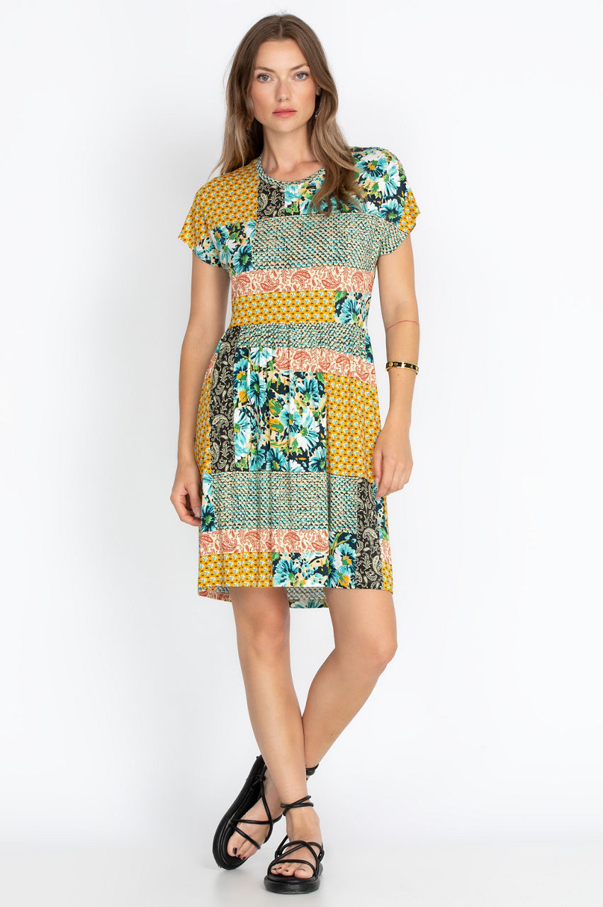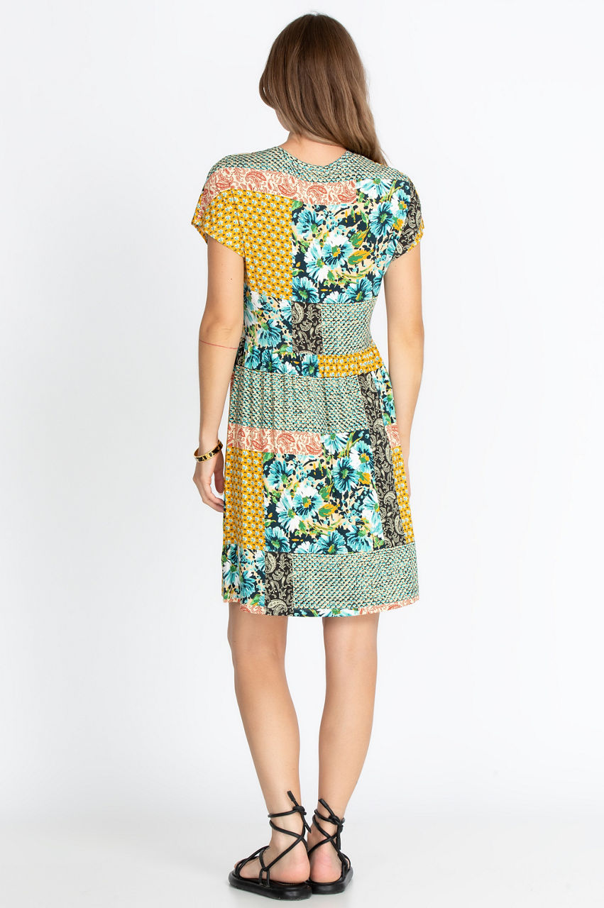 This relaxed T-shirt dress takes a playful and sophisticated approach to mixing colors and motifs with its patchwork-inspired print. The classic T-shirt cut makes this garment versatile, while the flowy cut will draw attention to the hem and to the movement it creates. Layer this versatile dress with a loose cardigan and some sandals for a boho-chic look!