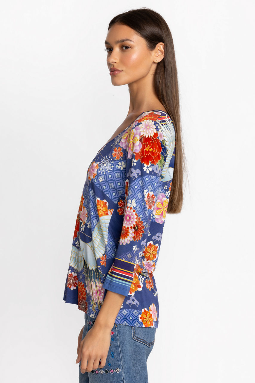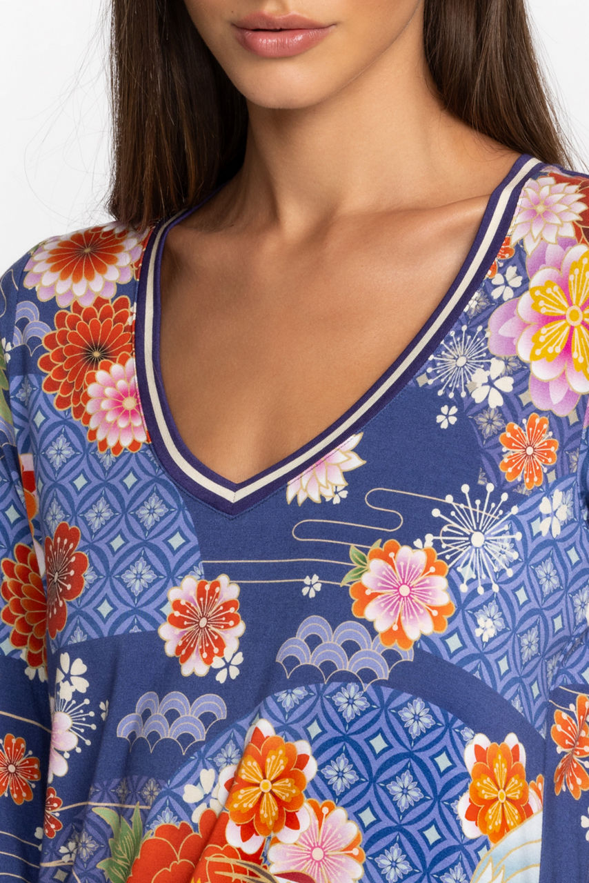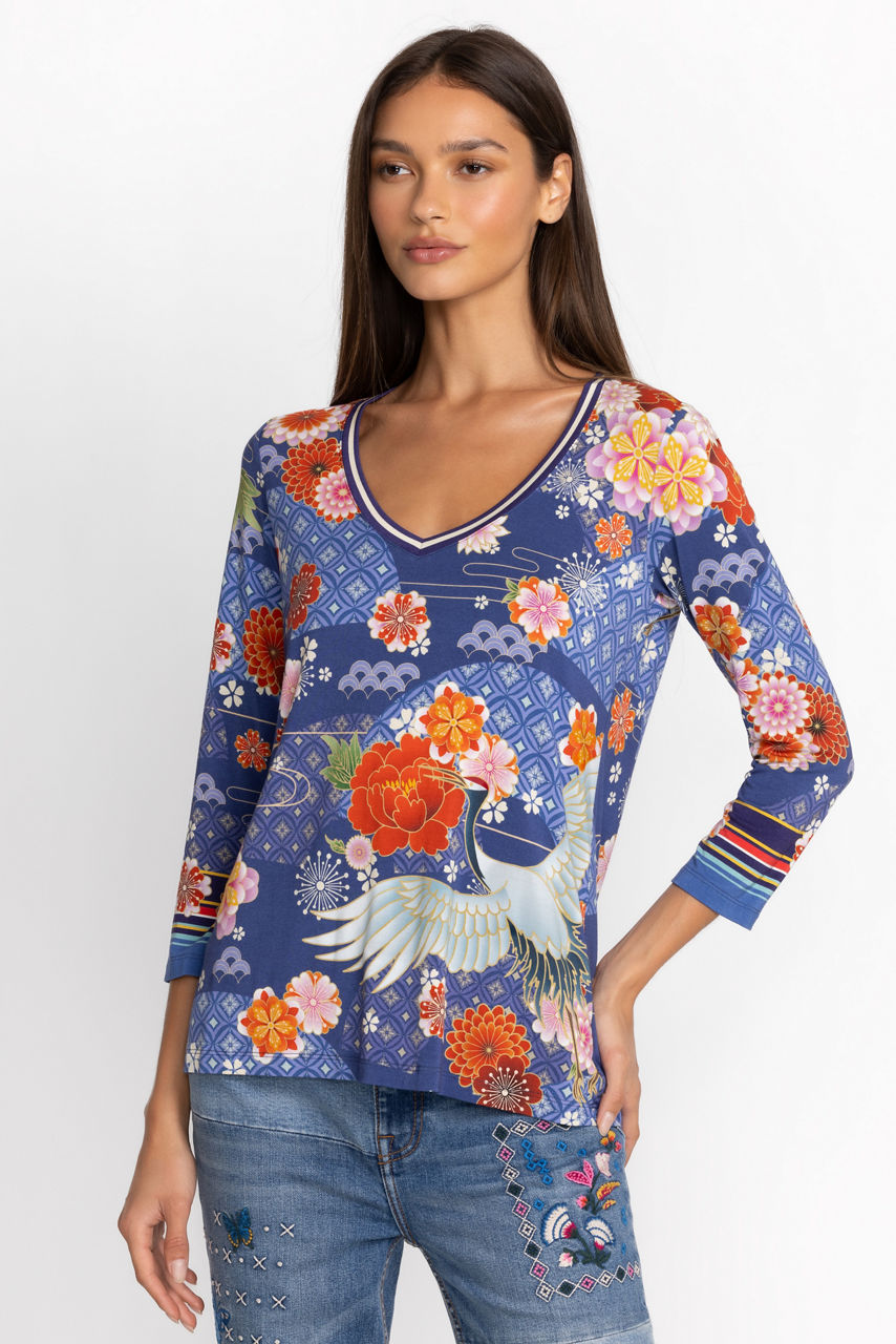 Conveying an optimistic mood, the Pajaro Favorite 3/4 Sleeve V-Neck Tee redefines a versatile silhouette with statement florals. This tee is crafted from a comfortable fabric with added stretch and features a V-neck, 3/4 sleeves, and a striking print comprising floral and animal motifs. Style this tee with wide-leg pants and flats for an effortlessly chic daytime ensemble.