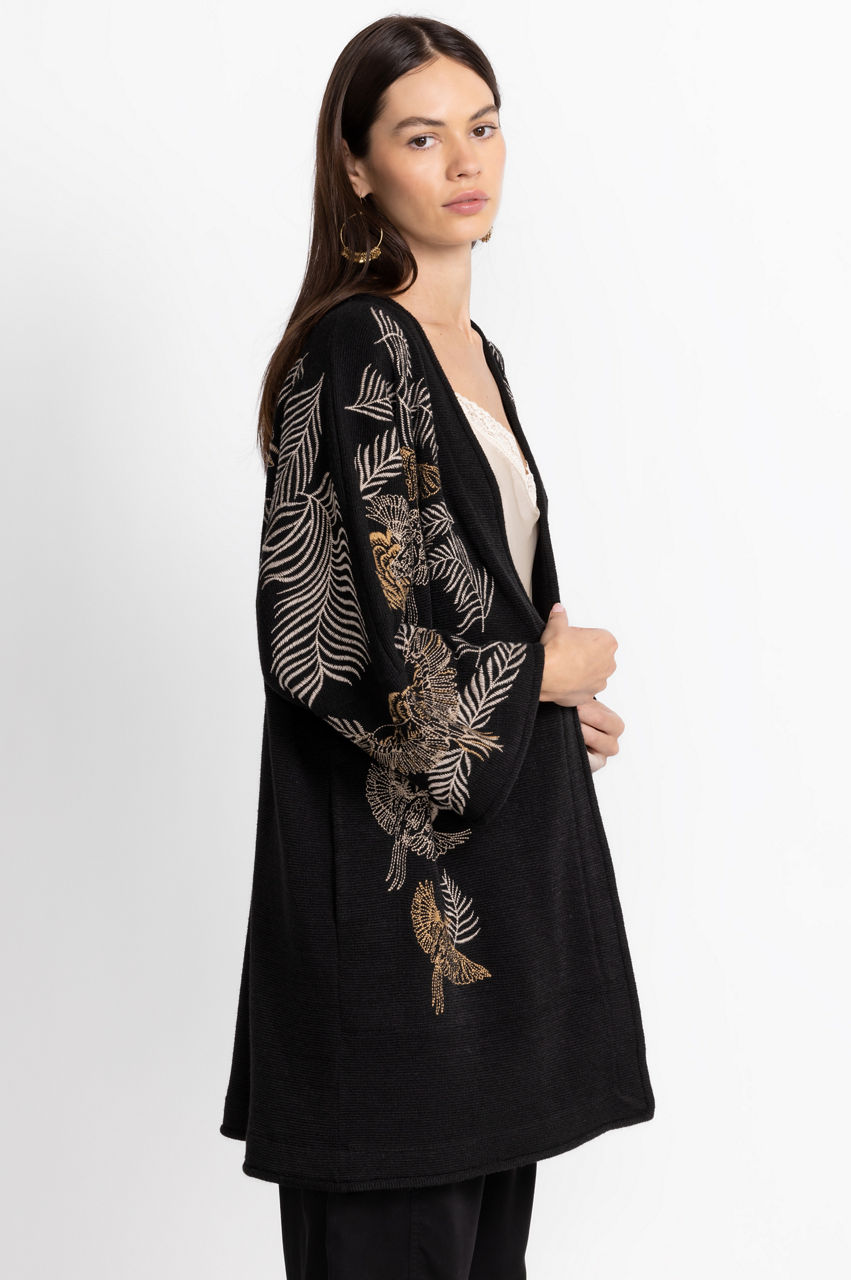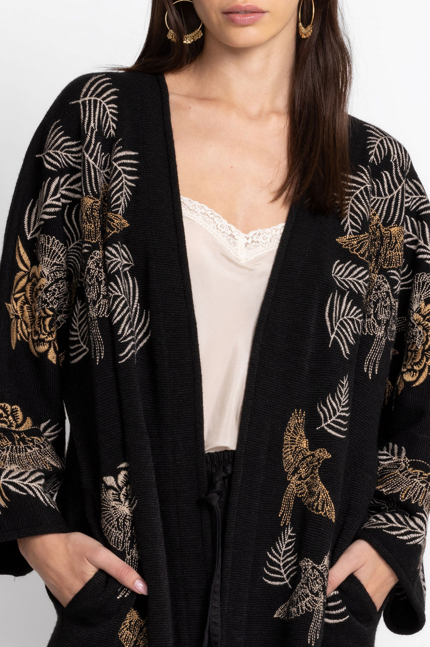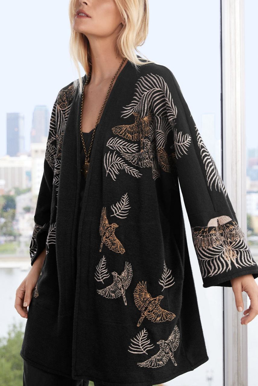 Crafted from a lightweight material, the Pajaro Kimono is equal parts causal and classic. Enhanced by an intricate bird and leaf placement embroidery, this kimono boasts pockets on the seams, long sleeves, and an open front. Layer this kimono over a cream vest and black pants for a seamless day-to-night transition.