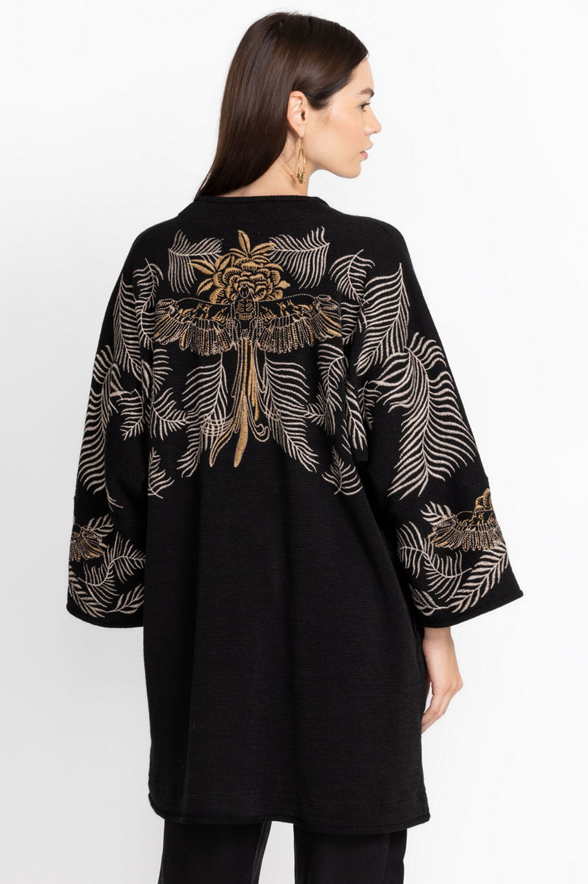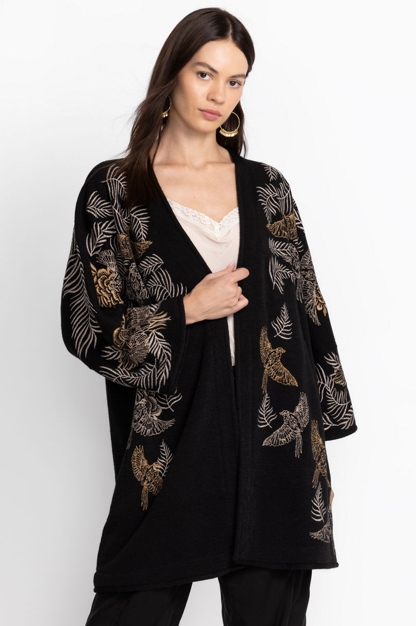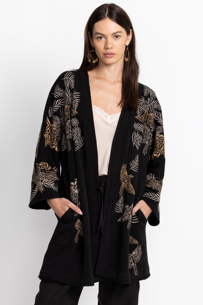 Crafted from a lightweight material, the Pajaro Kimono is equal parts causal and classic. Enhanced by an intricate bird and leaf placement embroidery, this kimono boasts pockets on the seams, long sleeves, and an open front. Layer this kimono over a cream vest and black pants for a seamless day-to-night transition.