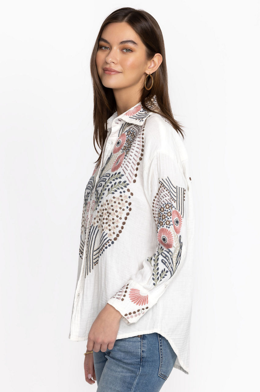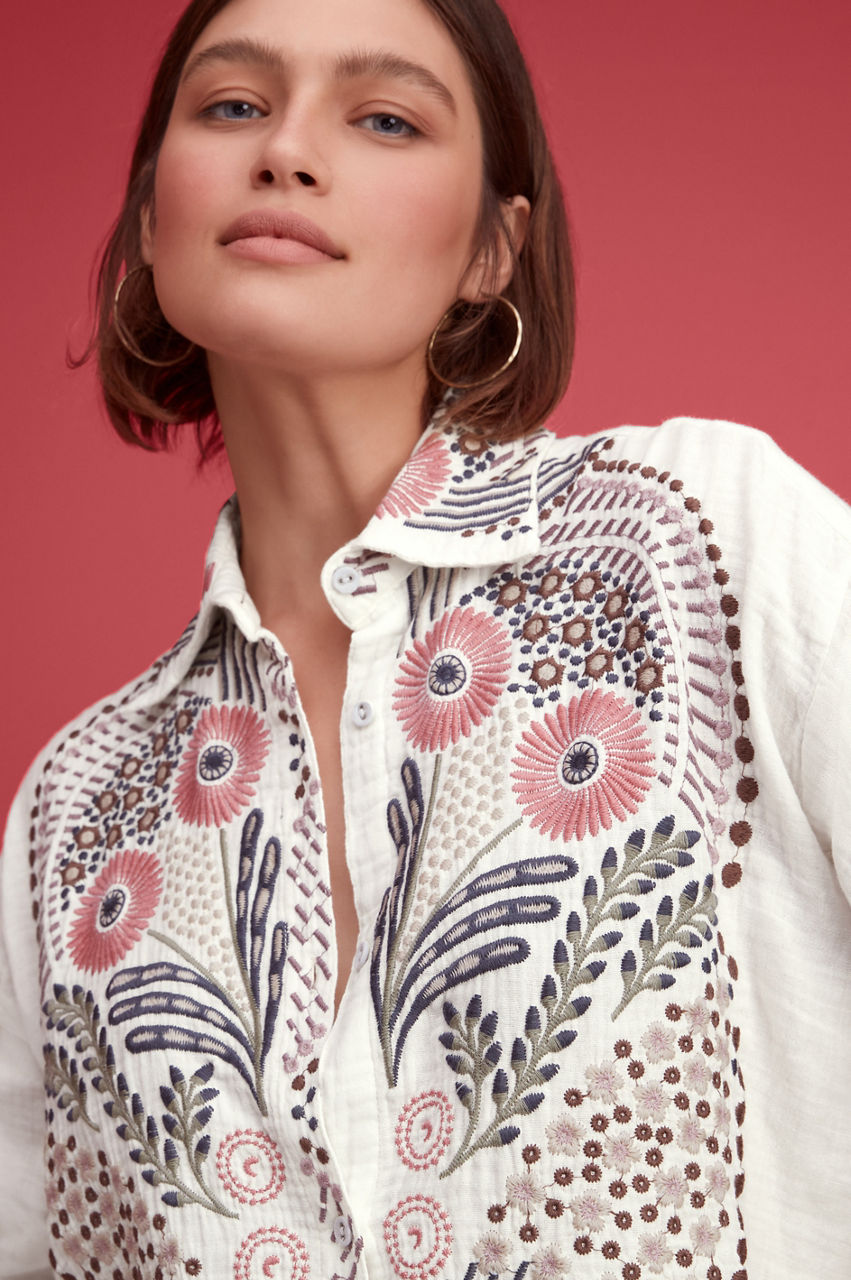 Crafted from cotton, the Palladium Blouse puts a bohemian spin on traditional shirting. Cut in a comfortable regular fit, this blouse is enhanced by a colorful placement embroidery and features a classic collar, a front button closure, buttoned cuffs, and a stepped hem. Team with straight pants for a stylish take on tailoring or pair with shorts for a relaxed look.