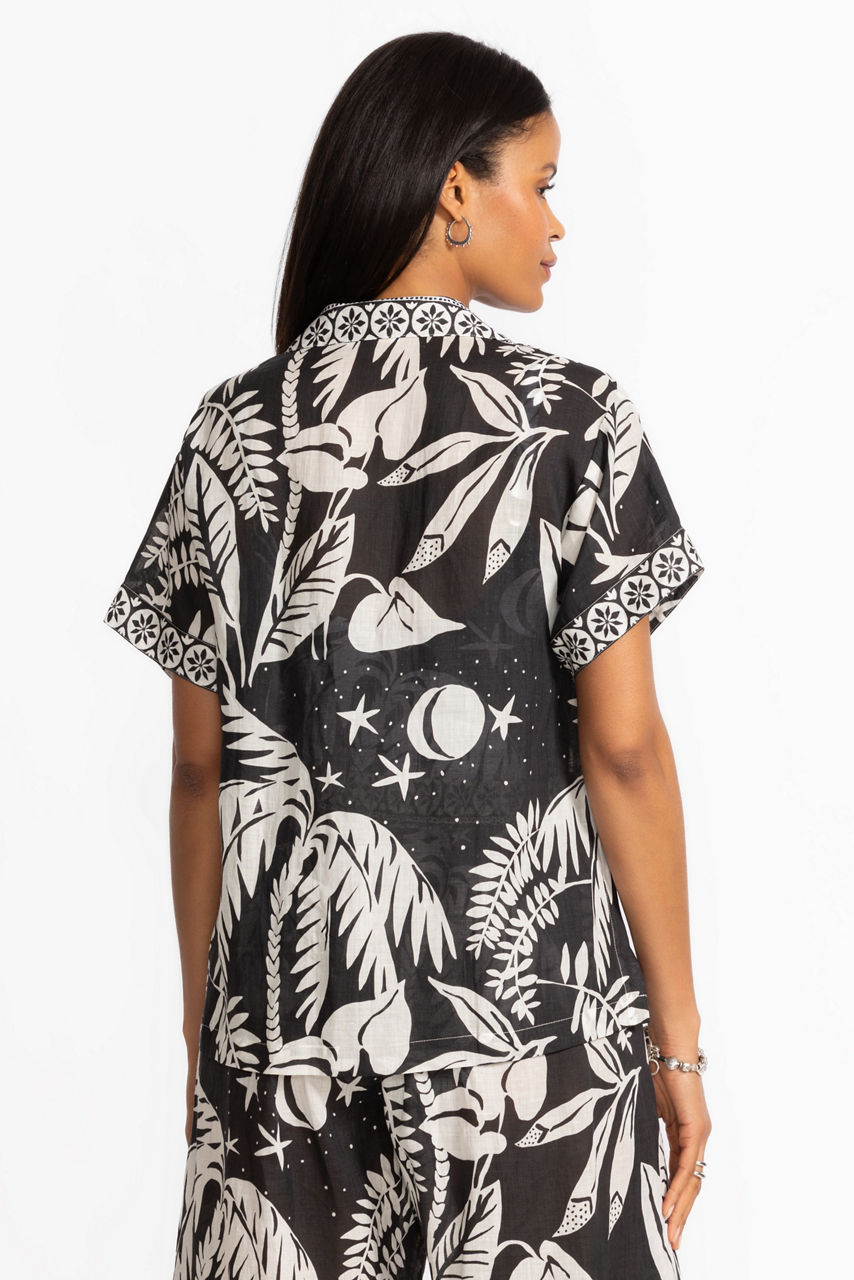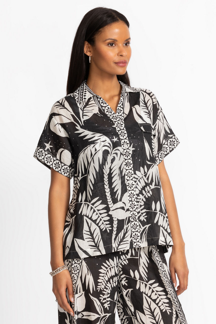 The Palmas Camp Shirt is your go-to swimwear layer, featuring a playful black and white tropical pattern that channels laid-back island vibes. With its lightweight fabric and short-sleeve button-down design, this shirt is perfect for throwing on after a swim or styling up for a breezy beachside lunch.