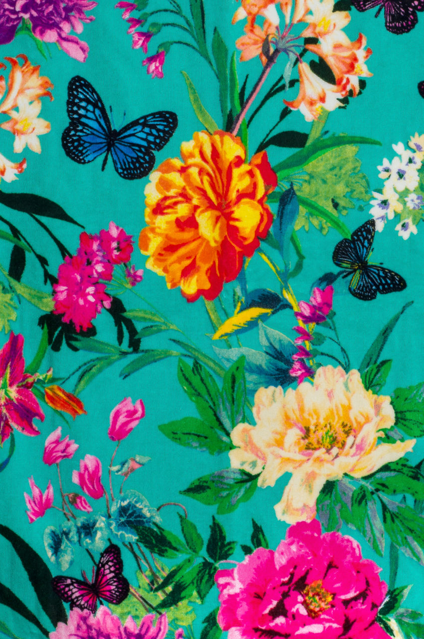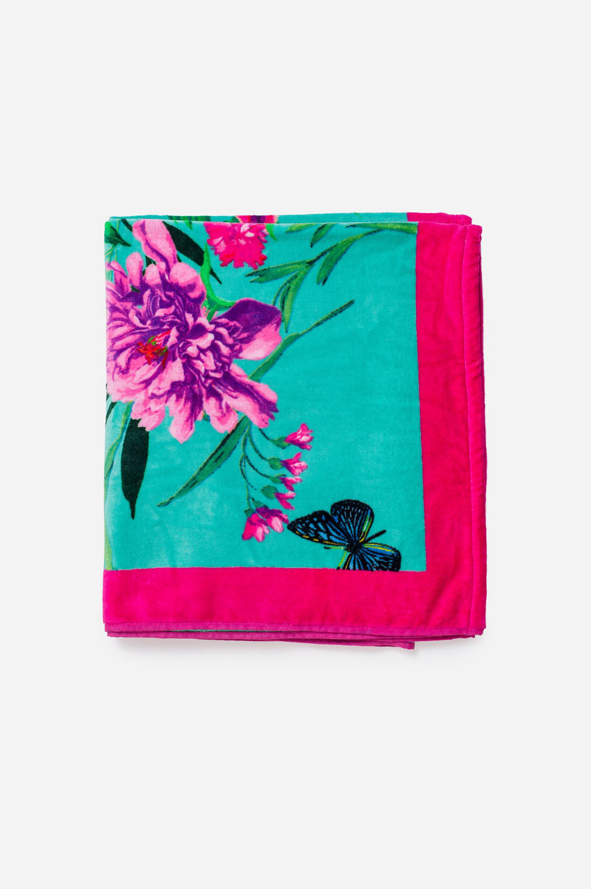 Crafted from an ultra-soft, American-grown cotton, The Panya Terry Beach Towel is designed in a rich color scheme with bold garden-fresh flowers and butterflies on a blue background that is perfect for sandy destinations and warm-weather escapes.
